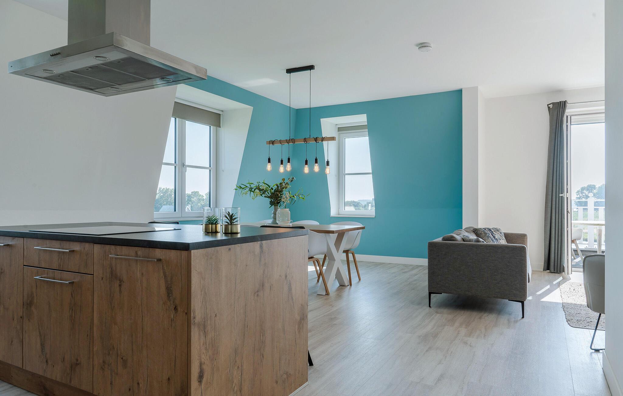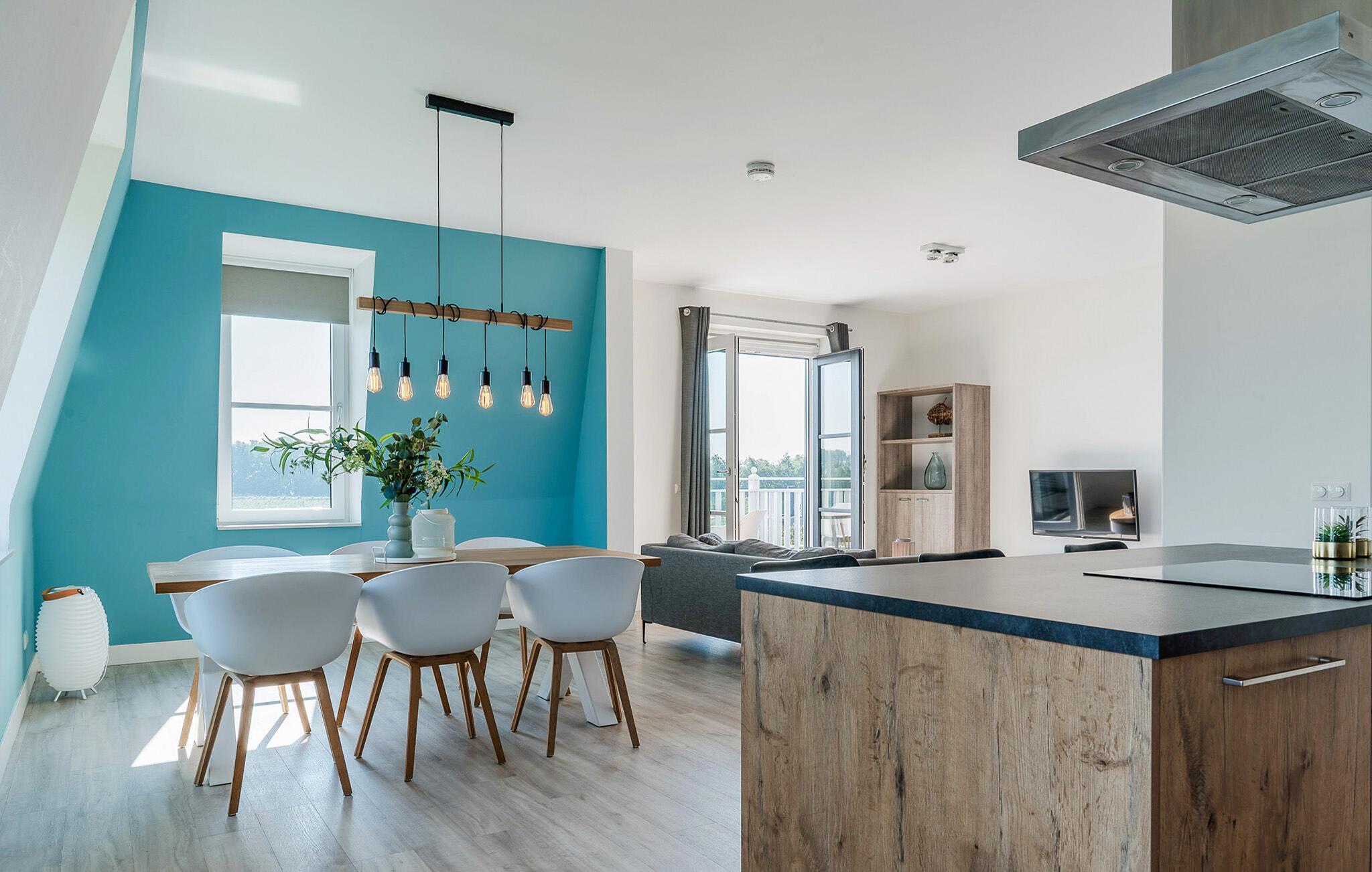 Denne moderne og luksuriøse ferielejlighed i en elegant lejlighedsbygning giver jer det perfekte sted at slappe af. De stilfulde møbler og den lyse, maritime atmosfære skaber en rolig og indbydende atmosfære. Her har I masser af plads til at finde jer godt til rette med familien eller venner. Mød hinanden i det åbne opholdsrum, der succesfuldt kombinerer køkken, spisestue og opholdsstue og lægger op til at lave mad, spise eller slappe af sammen.