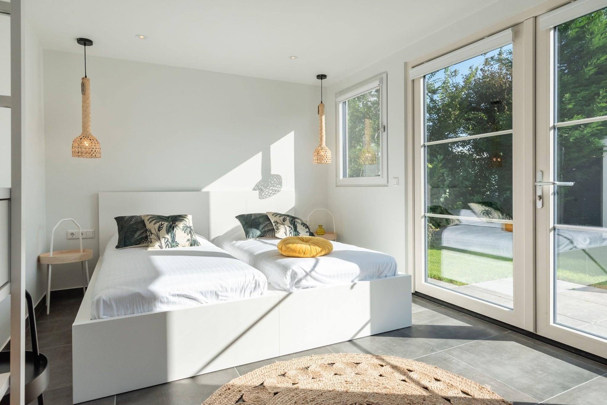 Denne smukke seks-personers bungalow blev fuldstændig renoveret i 2021 og udstyret med al moderne luksus. Det hyggelige feriehus med udendørs pejs ligger i gåafstand, 50 meter, fra Veerse Meer og nær centrum af Kamperland. Feriehuset har en rummelig have med forskellige siddepladser, masser af privatliv og en trampolin. Boligen består af opholdsstue med overdækket og aflåselig terrasse ved hjælp af glasskydedøre. Bungalowen har 3 soveværelser og er opdelt i 2 dele: et meget rummeligt soveværelse med 2 enkeltsenge, et værelse med køjesenge, et badeværelse med bruser, håndvask og separat toilet. 2. fløj har et rummeligt soveværelse med dobbeltseng og et luksuriøst badeværelse med toilet. I stuen er der opholdsområde med TV, spisebord og fuldt udstyret åbent køkken med køleskab, mikroovn, espressomaskine og induktionsplade. Opvaskemaskine og vaskemaskine er placeret i bryggerset På terrassen er der 2 luksuriøse lænestole, 6 personers spisebord og udendørs pejs/grill. I haven bag huset er der 2 liggestole og en trampolin. Der er også en udendørs bruser og et picnicbord i forhaven. Du kan hygge dig hvor som helst i haven. Natur og omgivelser Veerse Meer ligger 50 meter væk med mange muligheder for vandsport såsom surfing, vandski, sejlads osv. (også en bred vifte af udlejningsartikler, herunder vandsportsudstyr, både, Veerse Meer er den historiske landsby Veere, som kan nås med cykel/til fods færge, som nemt kan nås til fods eller på cykel. Naturreservatet "De Schotsman" er lige rundt om hjørnet. Dette er et skovområde med vandrestier, mountainbikestier og hestestier. Det skotske højlandskvæg går frit omkring her. Landsbyen Kamperland ligger 3 km væk med supermarkeder, hyggelige terrasser og en lille havn. De Banjaard, en af de smukkeste og bredeste strande i Holland, ligger