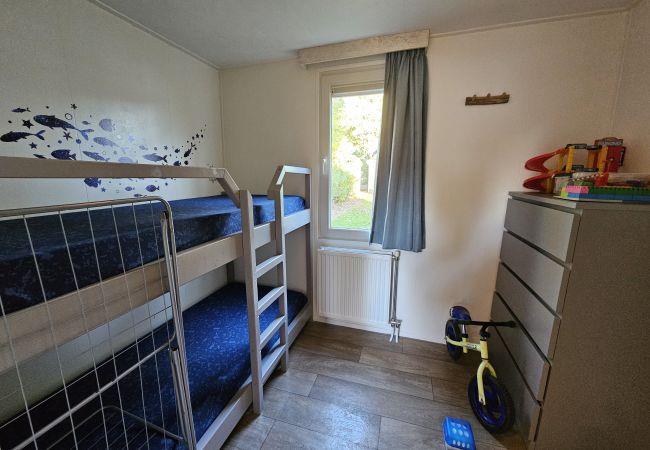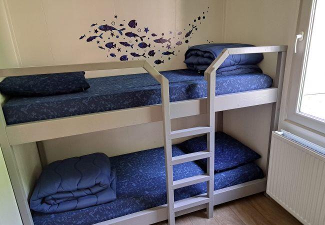 The chalet features two bedrooms, including a comfortable double bed and a practical bunk bed, ensuring a good night's sleep for everyone. The single bathroom with a shower provides all the necessary amenities for a comfortable stay. Central heating keeps the space warm and inviting, while complimentary WiFi ensures you stay connected during your holiday.