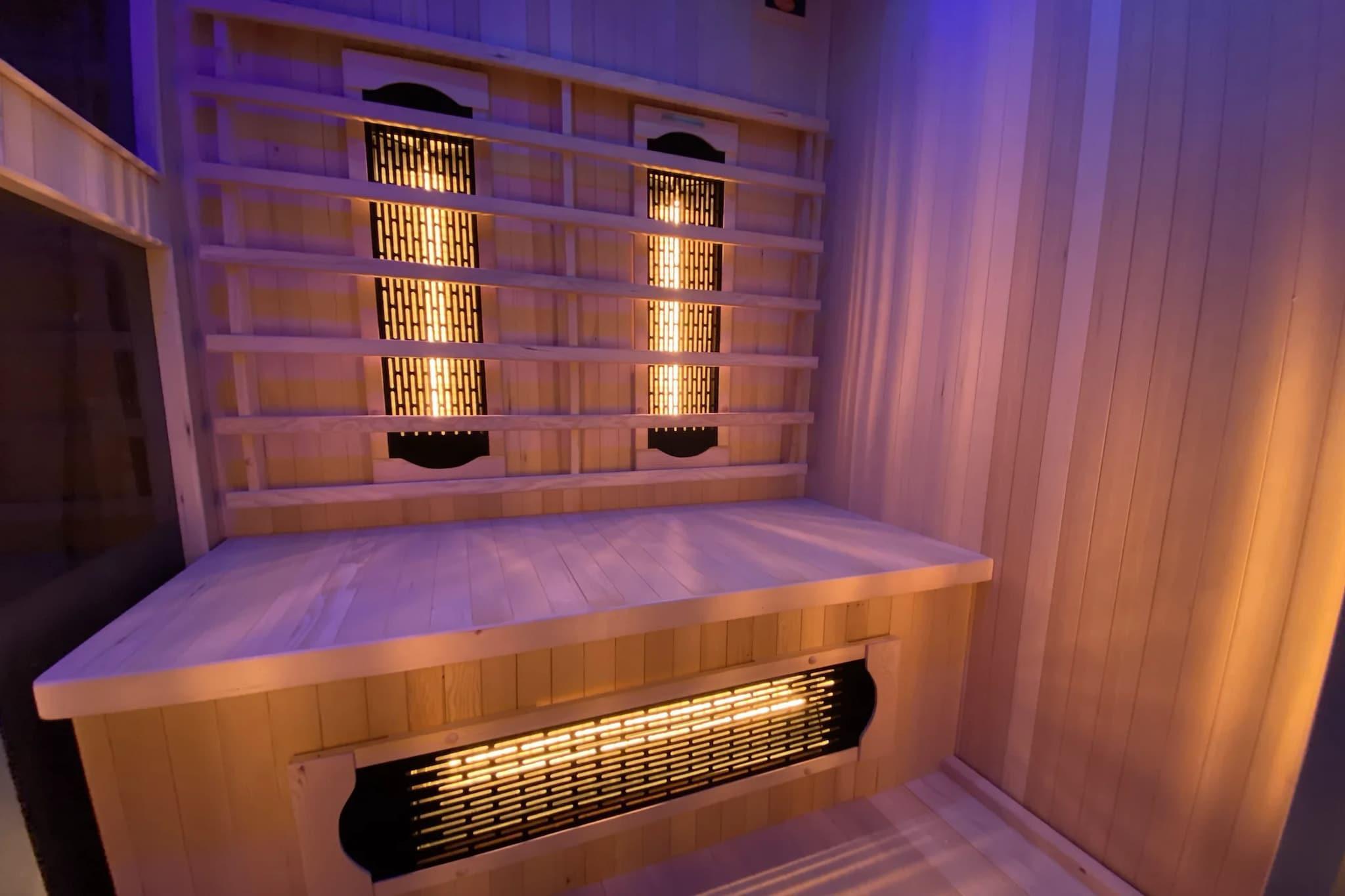 Stueetage: (Stue(Fjernsyn(fladskærm), spisebord, sofahjørne, DVD-afspiller), åbent køkken(kakkelovn(gas), elkedel, kaffemaskine(kaffepude), mikrobølgeovn, opvaskemaskine , køle-fryseskab, , ), soveværelse(enkeltseng, enkeltseng), badeværelse(bruser, håndvask, toilet)) Internetadgang, infrarød sauna, patio, varme(central), terrasse, havemøbler, parkering, Parasol, barnestol, kravlegård
