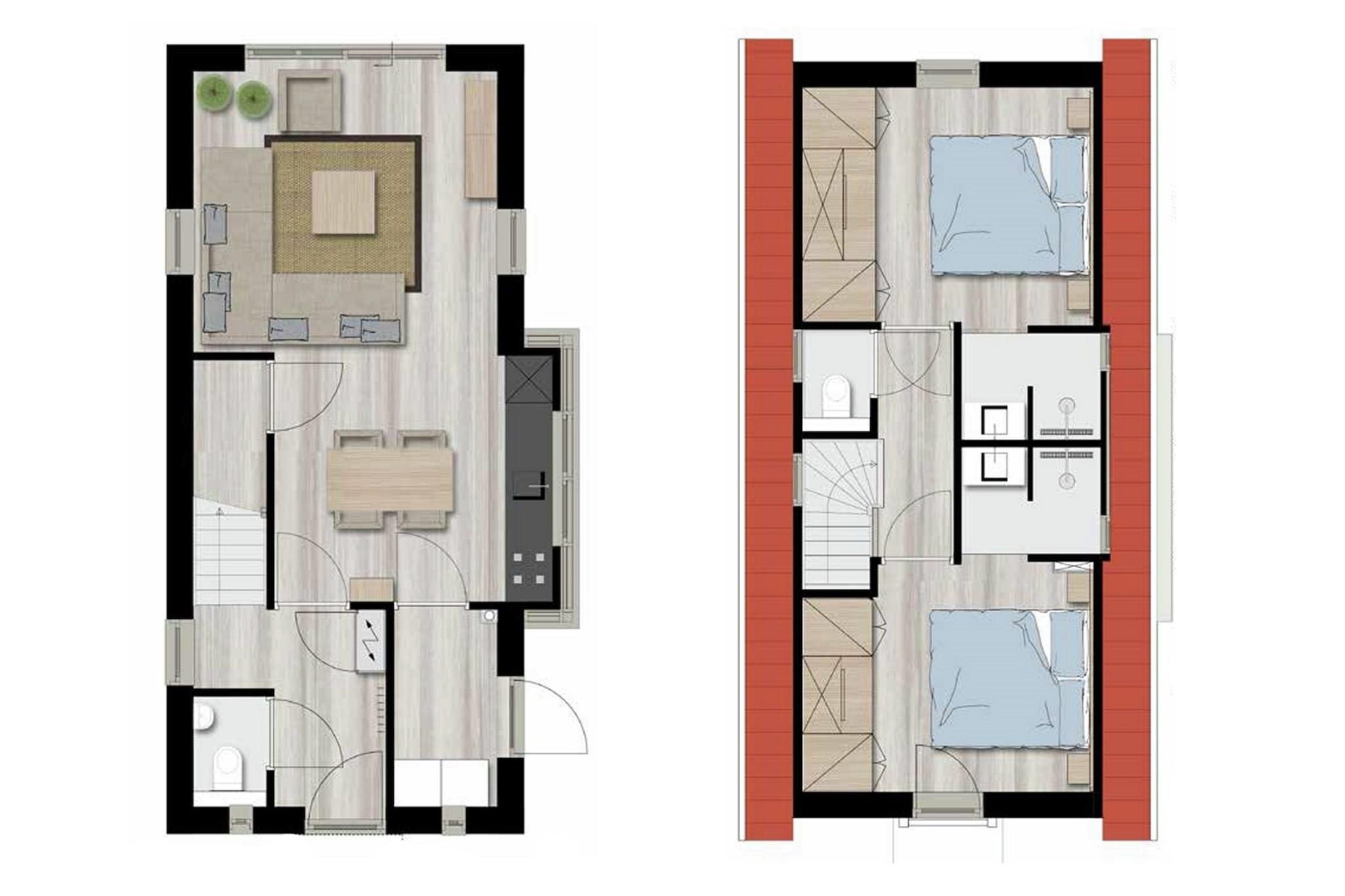 Stueetage: (entre(toilet), Stue(Fjernsyn, varme(gulvvarme)), åbent køkken(elkedel, kaffemaskine(kopper), combi-mikroovn, opvaskemaskine , køle-fryseskab)) På 1. etage: (Soveværelse med badeværelse(dobbeltseng eller 2 enkeltsenge Senge, Fjernsyn, bruser, håndvask), Soveværelse med badeværelse(dobbeltseng eller 2 enkeltsenge Senge, bruser, håndvask), Repos(toilet)) pulterkammer(tørretumbler, vaskemaskine), terrasse, have, havemøbler, parkering, loungemøbler