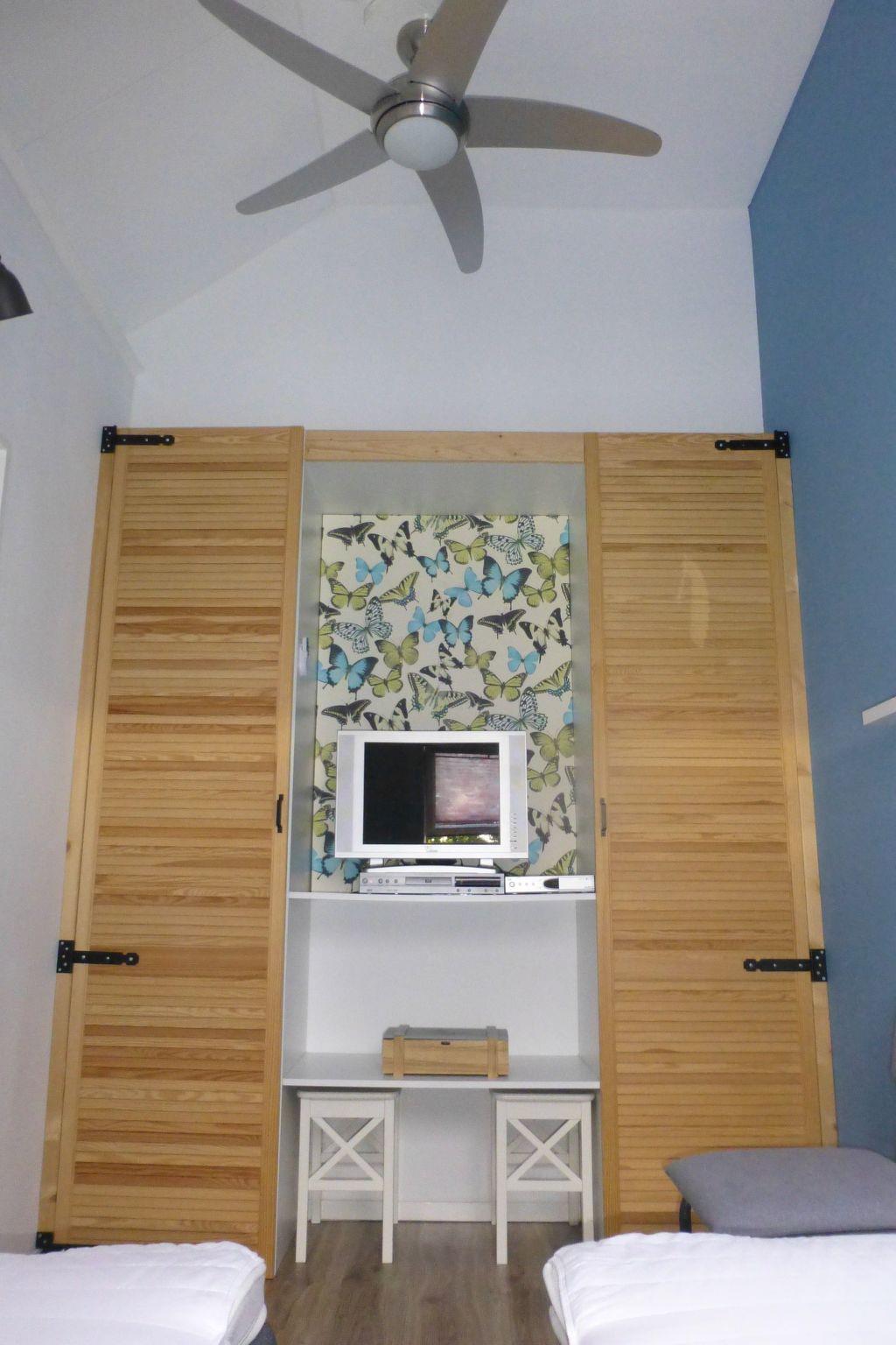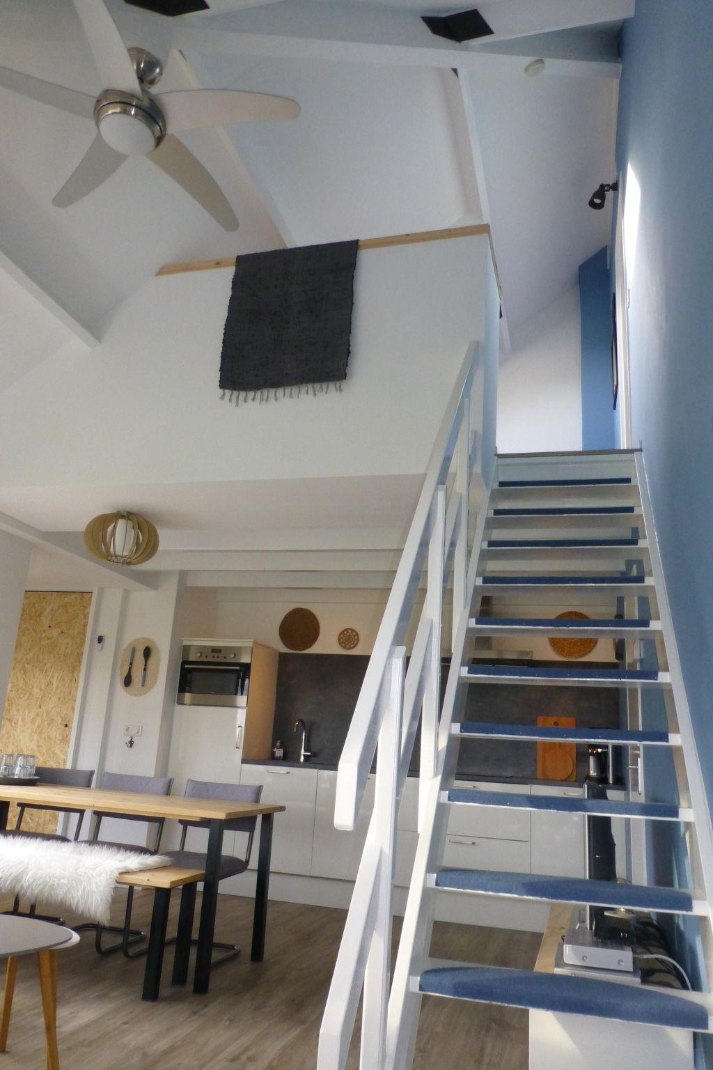 This bungalow is very tastefully decorated, fresh and cosy and has a living/dining room with open kitchen, two bedrooms and a bathroom and is equipped with Wi-Fi. On the ground floor is the living/dining room with central heating, a cosy seating area with satellite TV and stereo. A ceiling fan hangs above the seating area for a refreshing breeze. The open kitchen is equipped with the following appliances, among others: large fridge, dishwasher, combination microwave oven, induction hob (4 rings), cooker hood, toaster, sandwich maker, Senseo coffee machine, filter coffee machine and kettle. The dining table with 3 chairs and bench seats 6 people. The living room has a sliding door giving access to the covered terrace and garden. The first bedroom is located on the ground floor with a sliding door and is furnished with two box-spring single beds (90 x 200 cm) and a wardrobe. The bathroom has a walk-in shower, hanging toilet and a washbasin with 2 washbasins. On the top floor, the second bedroom is also equipped with a ceiling fan, two box-spring beds (90 x 200cm) and a large built-in wardrobe.