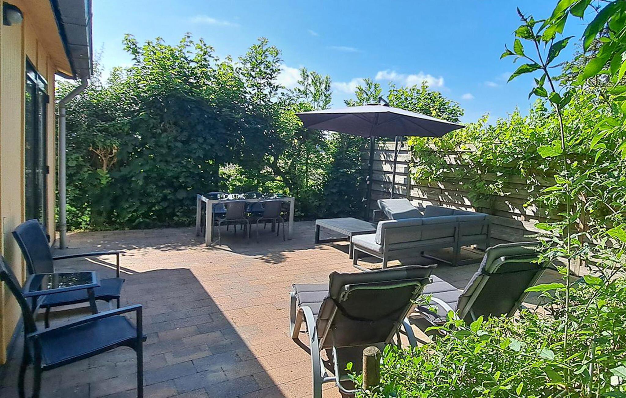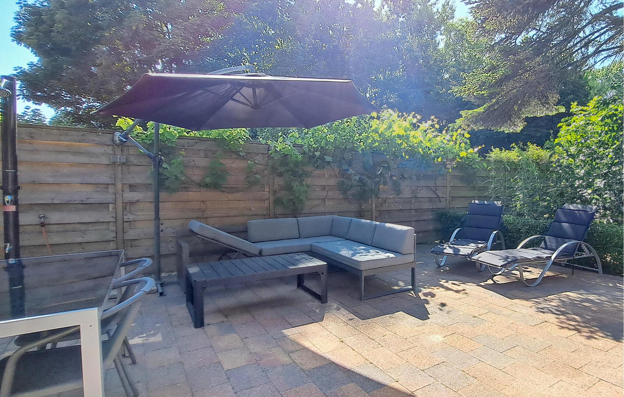 Slap af på den stilfulde terrasse, som er udstyret med moderne siddepladser, liggestole og en parasol. Den velholdte have med buske og skyggefulde træer byder på en oase af fred. Lad jer inspirere af naturen eller nyd et måltid udendørs.