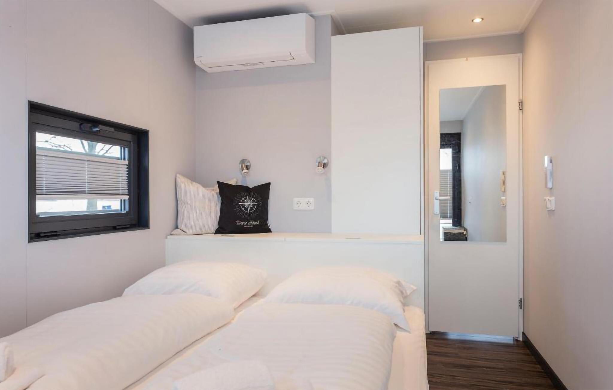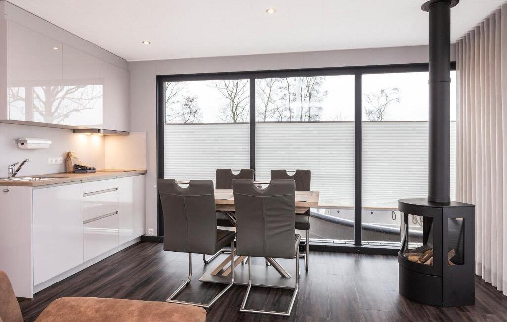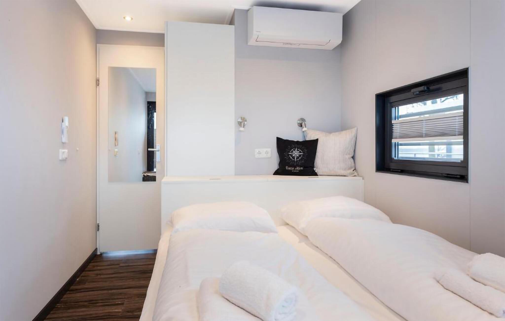 Træd ombord på jeres husbåd og bliv straks betaget af det lyse, moderne design. Sæt jer til rette i den komfortable sofa i det åbne opholdsområde og nyd den uhindrede udsigt over havnen gennem de store vinduer. Brug spisebordet til fælles måltider eller afslappende aftener. Tilbered jeres måltider i det veldesignede køkken og nyd den overraskende rummelige fornemmelse.