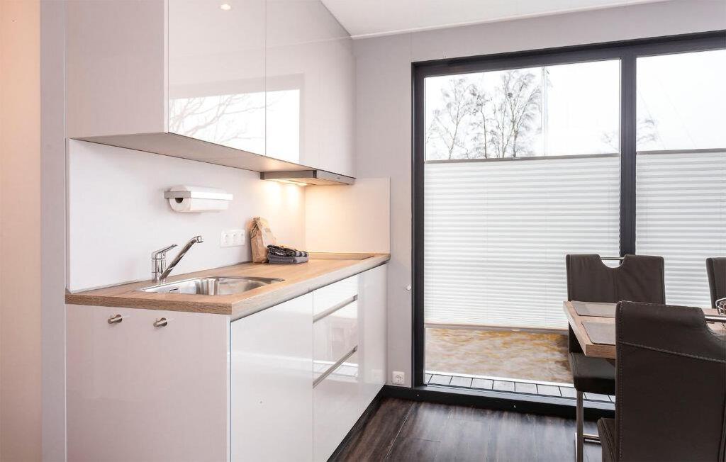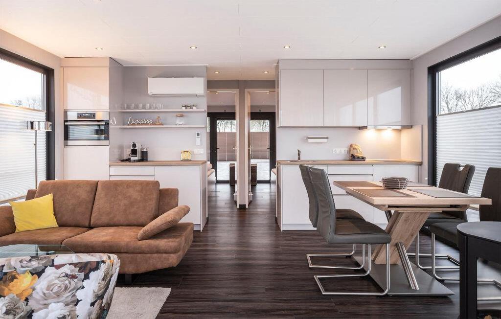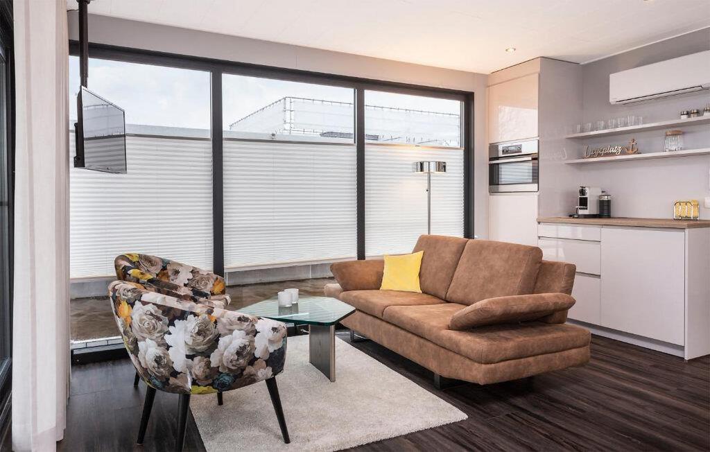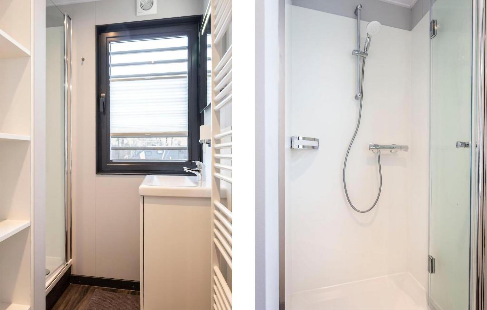 Træd ombord på jeres husbåd og bliv straks betaget af det lyse, moderne design. Sæt jer til rette i den komfortable sofa i det åbne opholdsområde og nyd den uhindrede udsigt over havnen gennem de store vinduer. Brug spisebordet til fælles måltider eller afslappende aftener. Tilbered jeres måltider i det veldesignede køkken og nyd den overraskende rummelige fornemmelse.