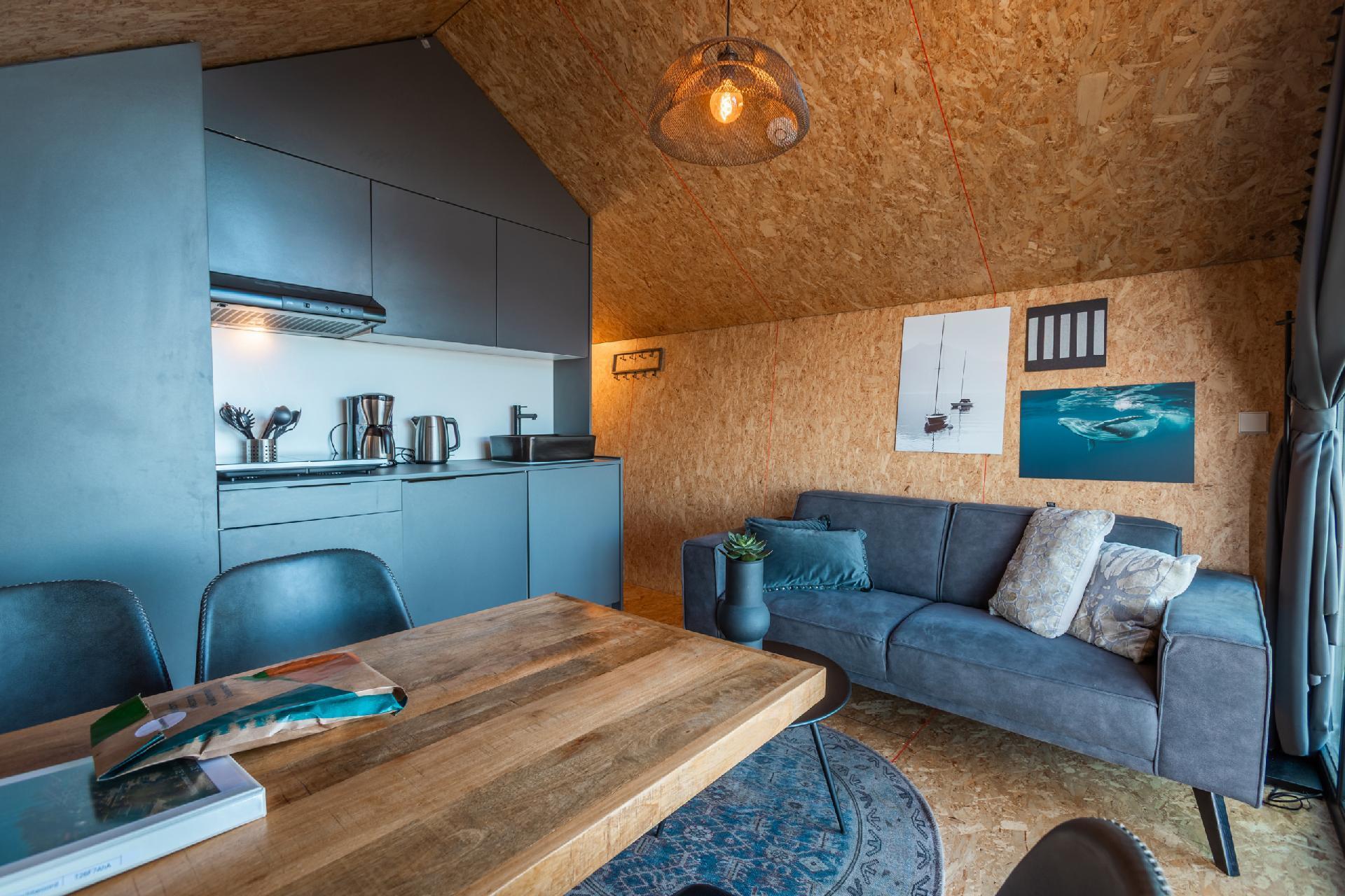 Tiny House Havenzicht is a ground-floor chalet of 30 m², cleverly furnished and equipped with all conveniences. The bright living room is cosy and practical, with a comfortable seating area, a dining area and a smart TV for relaxing evenings. In the modern kitchen, you'll find everything you need, such as an induction hob, kettle and filter coffee machine – ideal for a quiet breakfast or a quick lunch..