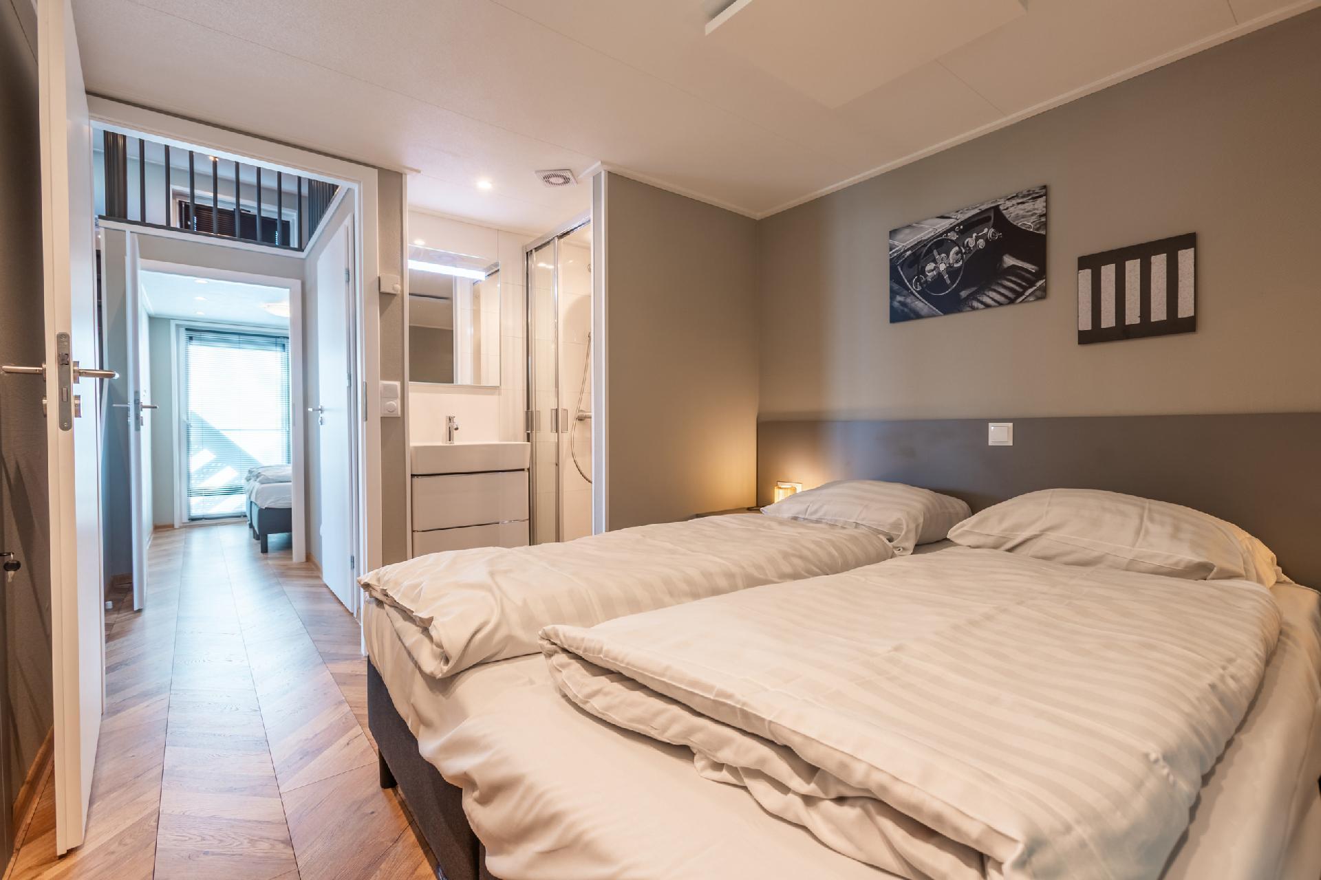There are two bedrooms, one or both of which can be located on the ground floor. Both rooms are equipped with double beds. One of the bedrooms also has its own shower and sink. The apartment additionally has a luxurious bathroom with a shower and toilet.