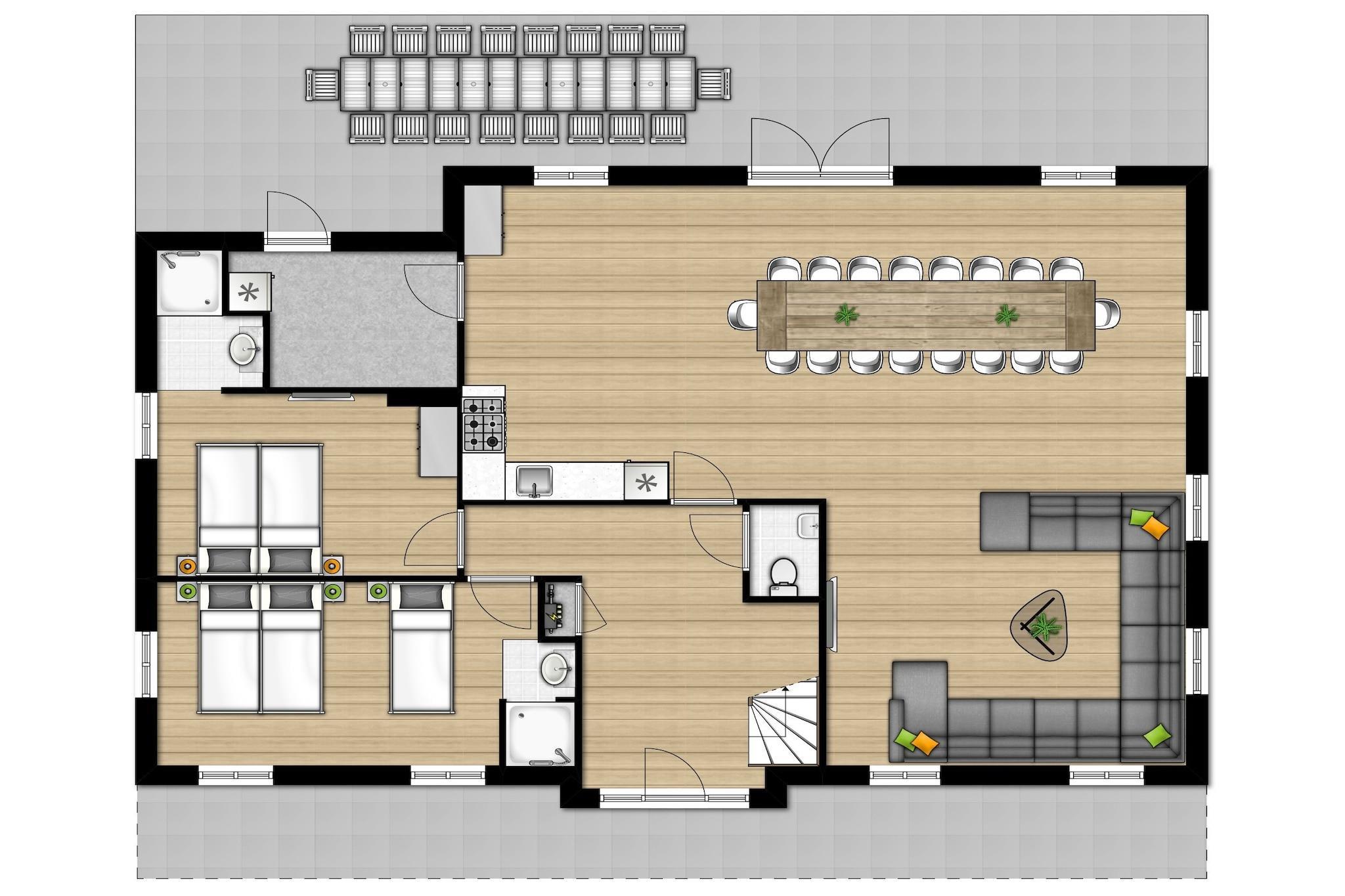 Stueetage: (entre(toilet), Stue(Fjernsyn(kabel), varme(gulvvarme)), Køkken(elkedel, kaffemaskine(kaffepude), combi-mikroovn, opvaskemaskine , køle-fryseskab), Soveværelse med badeværelse(enkeltseng, dobbeltseng eller 2 enkeltsenge Senge, bruser, håndvask), Soveværelse med badeværelse(dobbeltseng eller 2 enkeltsenge Senge, bruser, håndvask)) På 1. etage: (soveværelse(enkeltseng, dobbeltseng eller 2 enkeltsenge Senge), soveværelse(enkeltseng, dobbeltseng eller 2 enkeltsenge Senge), soveværelse(enkeltseng, dobbeltseng eller 2 enkeltsenge Senge), soveværelse(dobbeltseng eller 2 enkeltsenge Senge), soveværelse(enkeltseng, enkeltseng), badeværelse(bruser, sauna, håndvask), badeværelse(bruser, håndvask), badeværelse(badekar, håndvask, toilet), Repos(toilet), trappegitter) pulterkammer, varme(central), terrasse, havemøbler, parkering, swimmingpool(deles med andre gæster), swimmingpool(deles med andre gæster, overdækket), barneseng, barneseng, barnestol