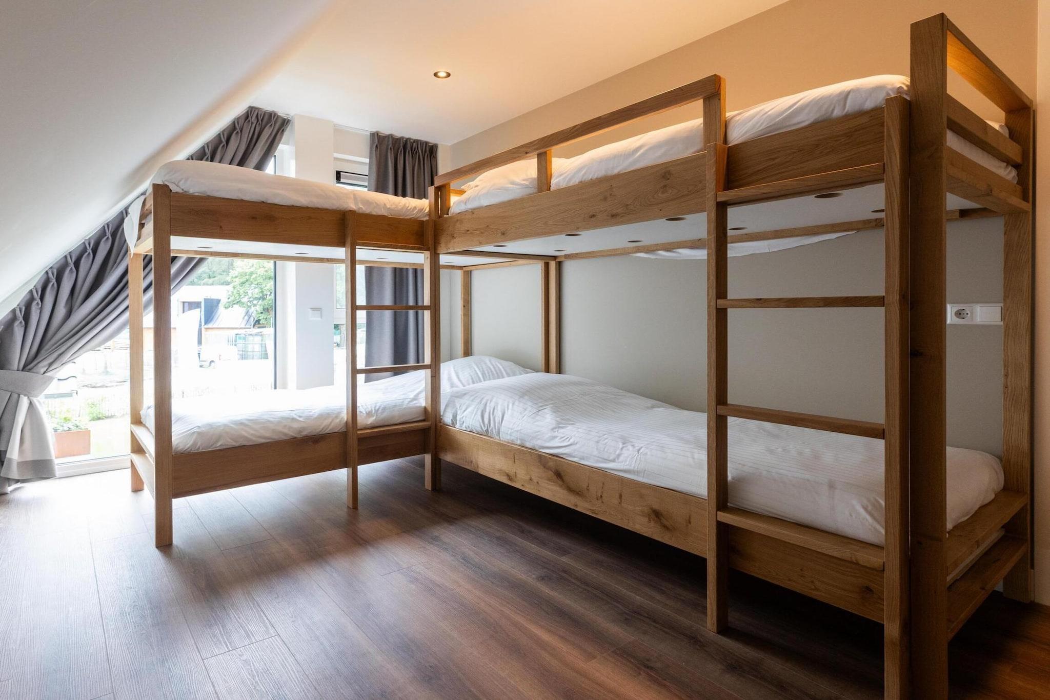 Stueetage: (Stue(sofahjørne), spisestue(spisebord), åbent køkken(komfur, kaffemaskine, ovn, mikrobølgeovn, opvaskemaskine , køle-fryseskab), Soveværelse med badeværelse(dobbeltseng, bruser, håndvask, toilet), Soveværelse med badeværelse(dobbeltseng, bruser, håndvask, toilet)) På 1. etage: (Soveværelse med badeværelse(dobbeltseng, bruser, håndvask, toilet), Soveværelse med badeværelse(dobbeltseng, bruser, håndvask, toilet), Soveværelse med badeværelse(køjeseng eller 2 enkeltsenge, køjeseng eller 2 enkeltsenge, bruser, håndvask, toilet)) Kælderetage: (hottub, bruser, toilet, solstole, private indoor pool)