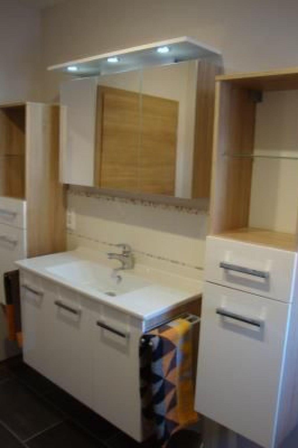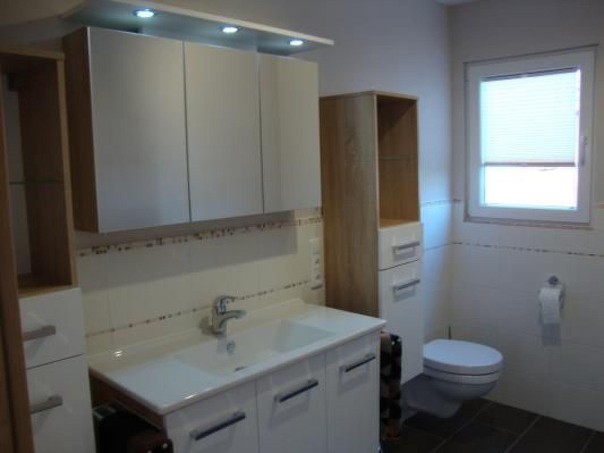 Wellness shower, washbasin, illuminated mirror cabinet, toilet, towel dryer and hairdryer