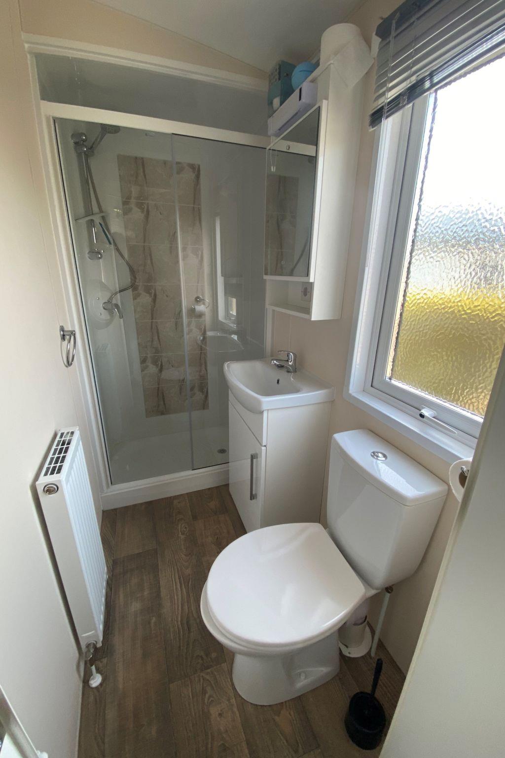 The bright bathroom impresses with a spacious shower, 1 washbasin and 1 toilet.