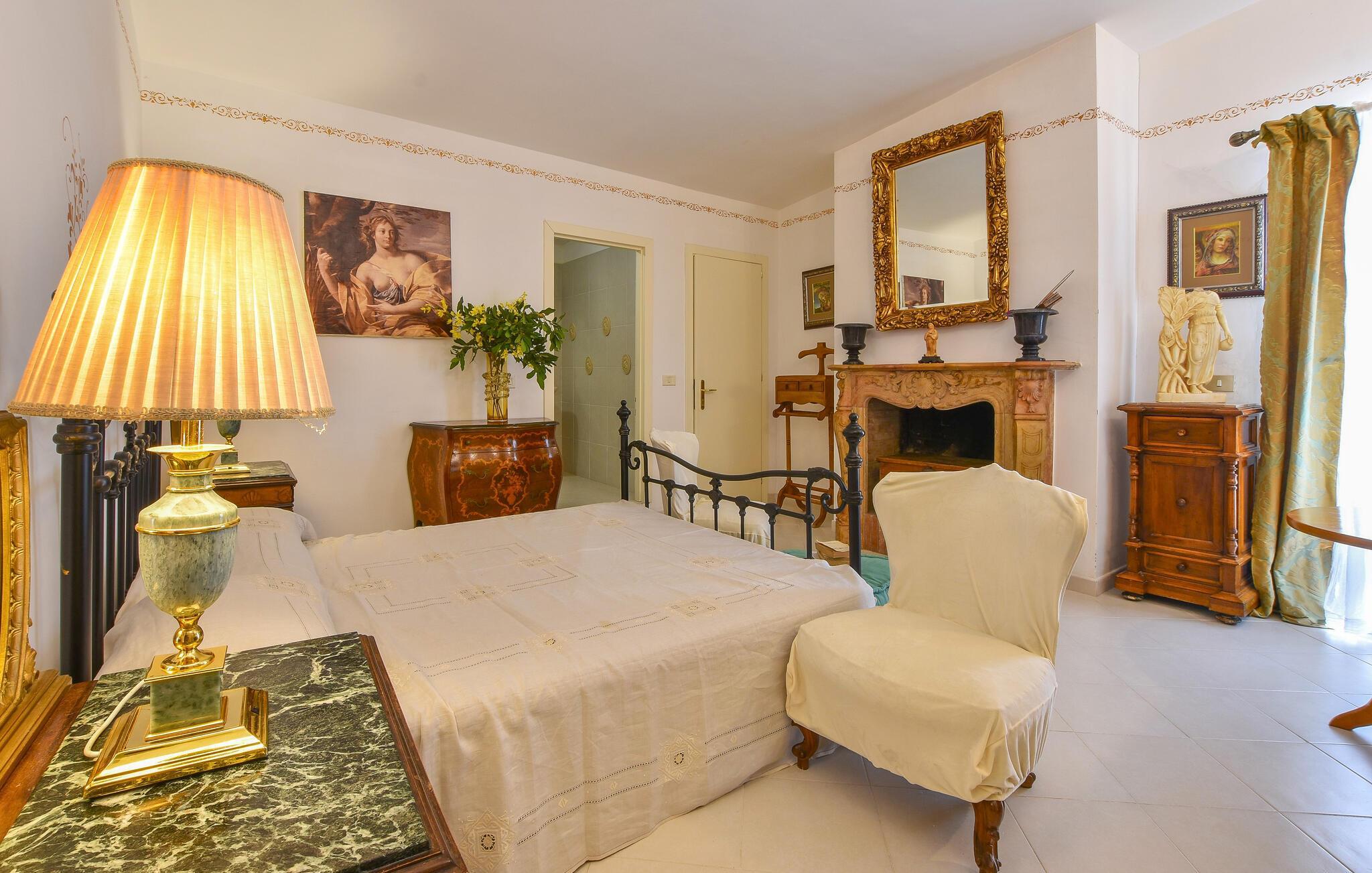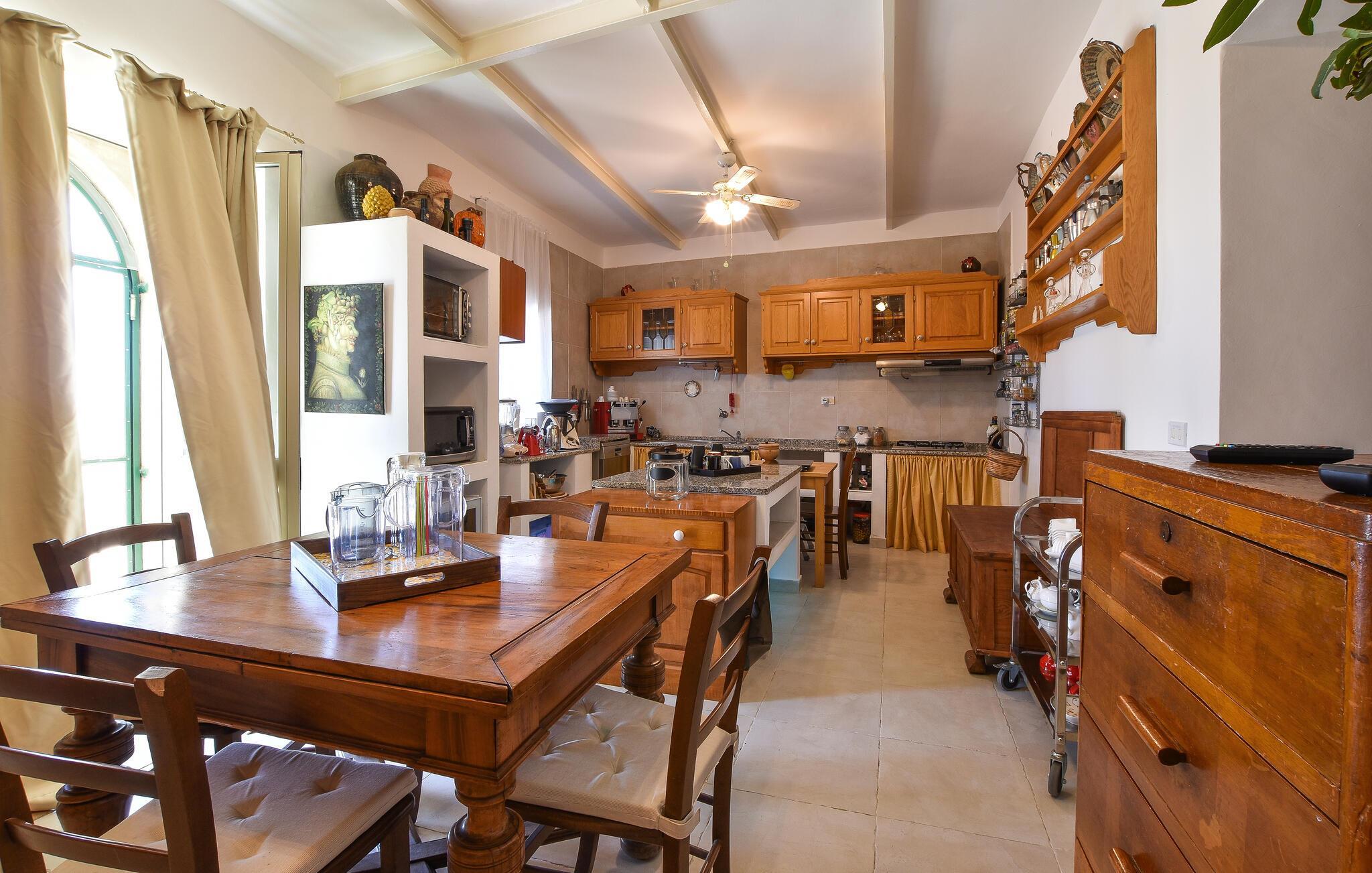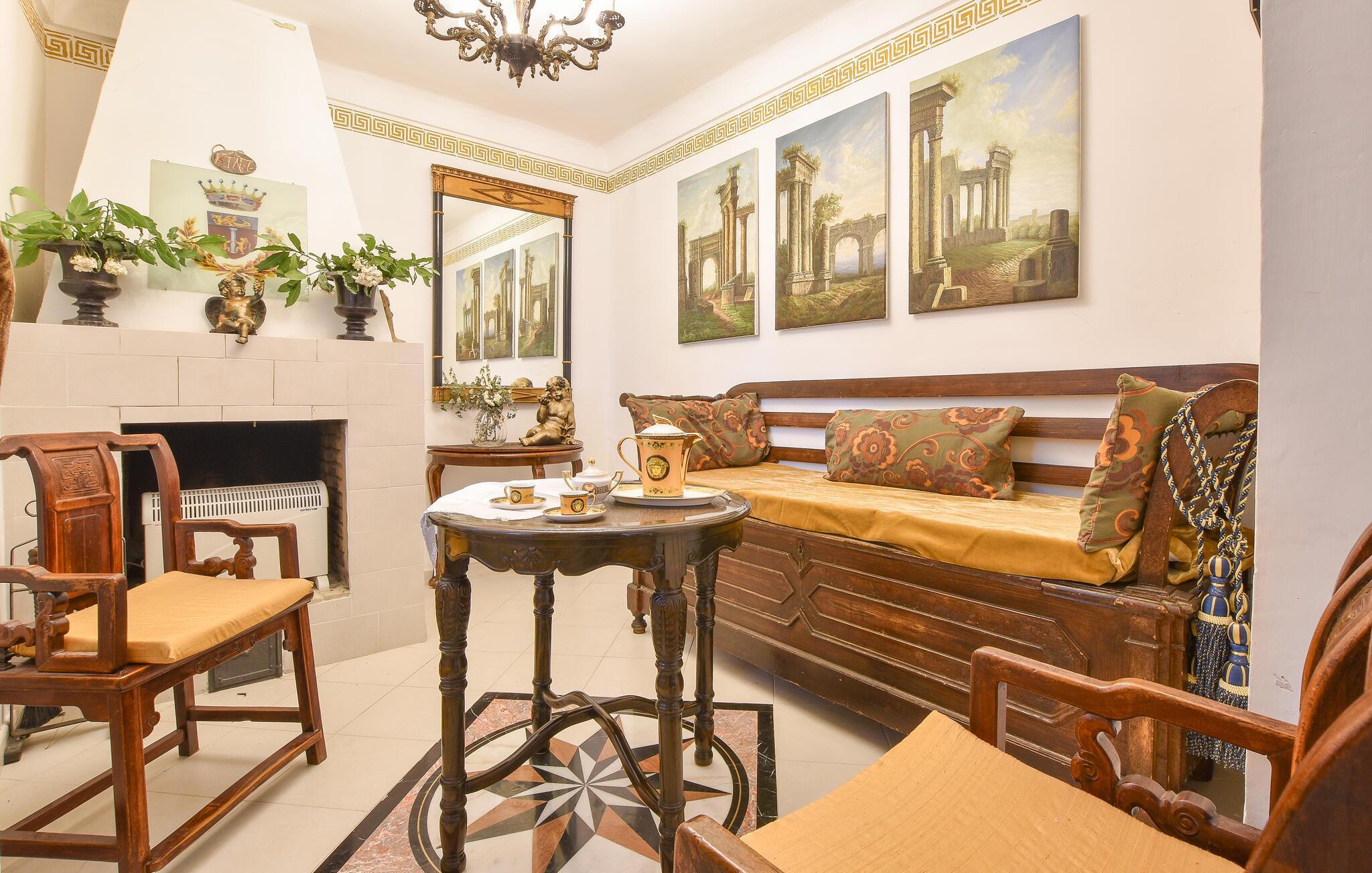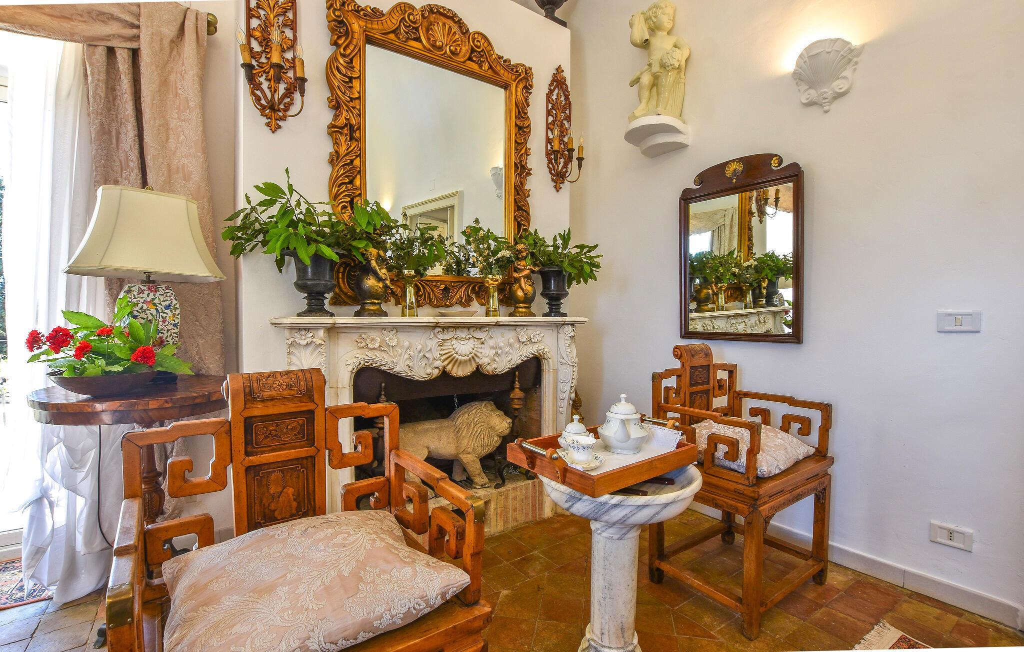 Inde i det herskabelige hus er der en elegant atmosfære med antikke møbler og charmerende detaljer, der afspejler regionens stil. Det lange spisebord lægger op til kulinariske kreationer, mens den hyggelige opholdsstue med komfortable sofaer lægger op til afslappende aftener.