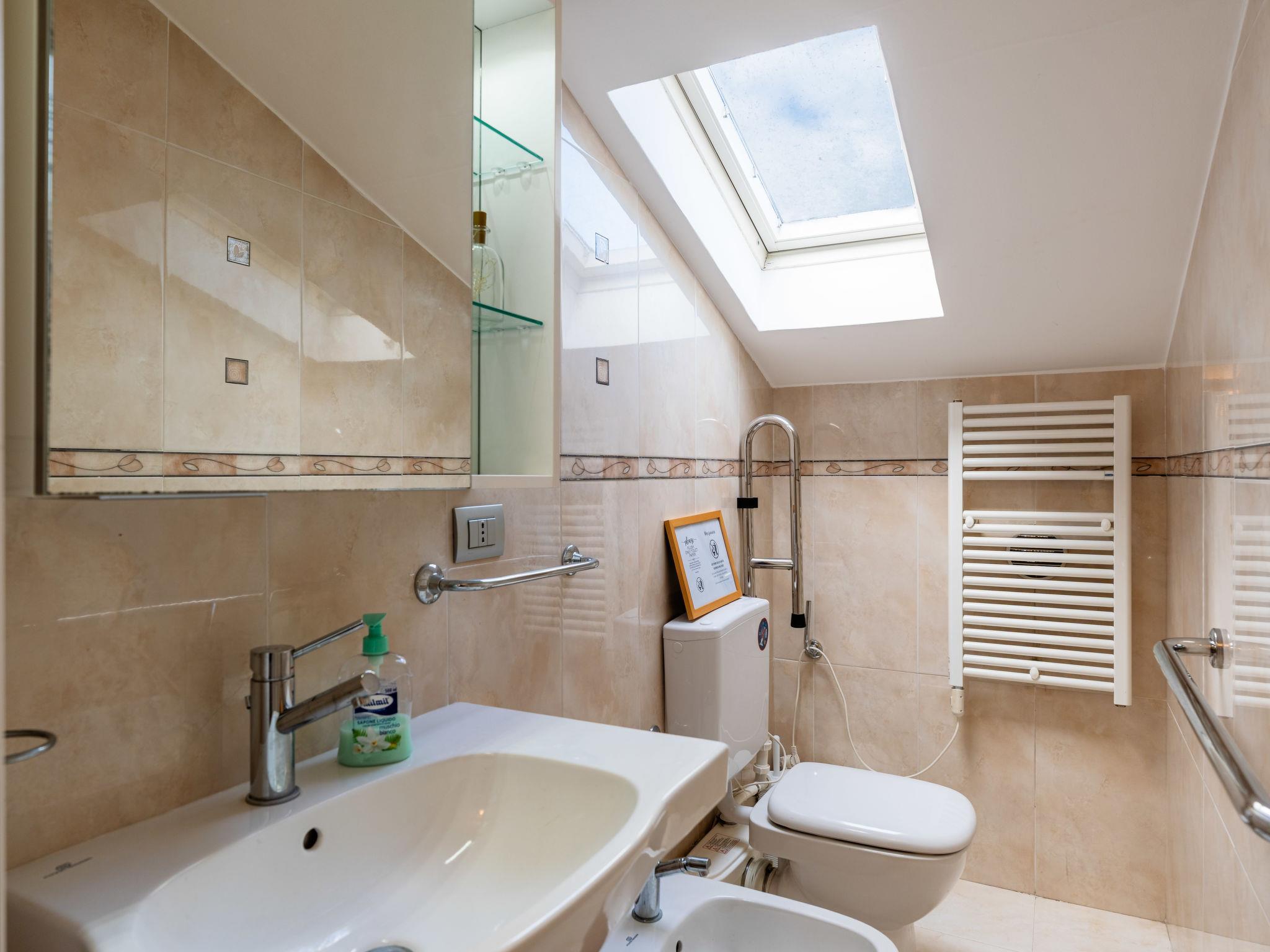 "By Center and Sea", 3-room penthouse 80 m2 on 3rd floor. With sloping ceilings, comfortable and tasteful furnishings: living/dining room (120 cm, length 200 cm). 1 double bedroom with rooflight. 1 double bedroom with rooflight. Kitchenette (oven, 4 gas rings, toaster, kettle, microwave, electric coffee machine). Bath/bidet/WC, shower/bidet/WC. Air-conditioning, forced-air heating. Heating available only from 01.11. to 15.04. Large terrace. Terrace furniture. View of the resort. Facilities: washing machine, iron, children's high chair, baby cot for up to 2 year olds, hair dryer. Internet (WiFi, free). Garage (extra). Please note: non-smoking house. Smoke alarm, fire extinguisher. IT009001B43A3O4WMG