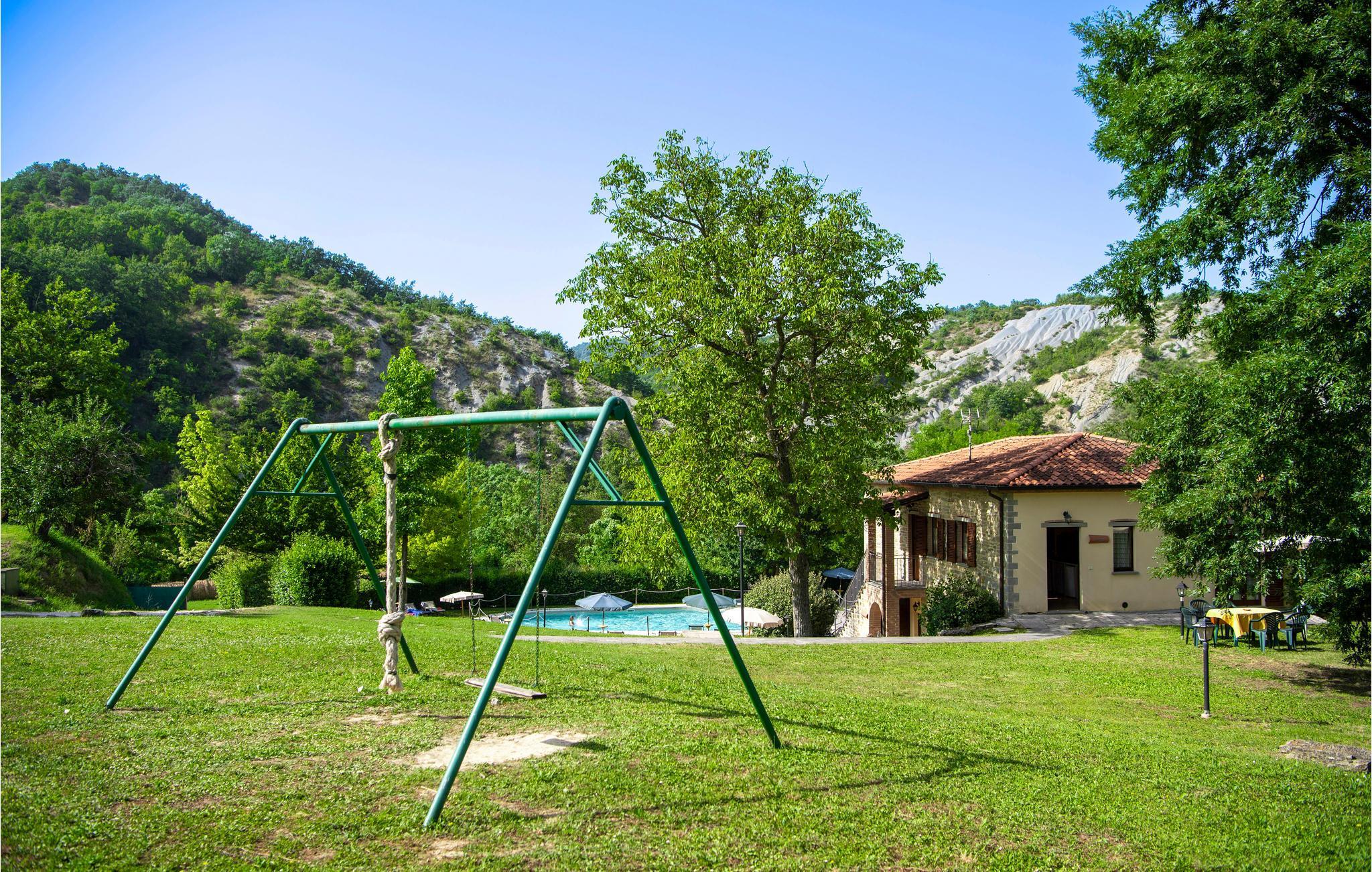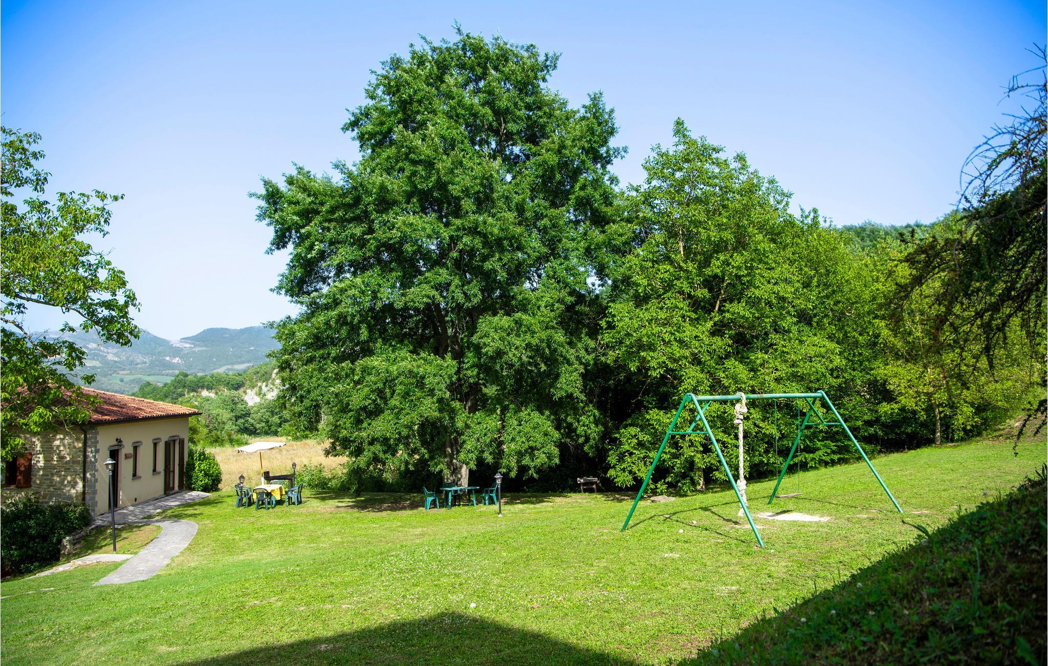 Denne ferielejlighed ligger på ejendommen Valguerriera, ca. 4 km fra Piobbico, i en dal i Apennin, det ideelle rejsemål til jer, hvis I ønsker jer en afslappende ferie i uberørt natur. Ejendommen består af herskabshuset og tre landhuse, de generøse udendørsområder og den dejlige, fælles pool på 17 x 10 m med undervandsmassage. I landhusene er der i alt 11 indbydende indrettede ferielejligheder. Lejligheden byder på en uafhængig indgang i eget udendørsområde med bord, stole og parasol, hvor I kan slappe af og spise jeres måltider i det fri. Grill og vaskemaskine til fælles brug. Parkering på grunden. En barneseng er til rådighed. Her bor I i Marche, ved grænsen til regionerne Toscana og Umbrien, i nærheden af Piobbico (Pesaro og Urbino), i en rolig dal ved navn Candigliano, en af de dejligste og mest oprindelige dale i baglandet af Pesaro, der byder på mildt klima og hvorfra I nyder en vidunderlig udsigt til Apennin. I omgivelserne venter der kunst- og renæssancebyer som Urbino, UNESCO-verdenskulturarv, fortryllende middelalderlandsbyer som Piobbico, Apecchio, Sant’Angelo in Vado og Acqualagna, kendt for trøflerne, samt Urbania, Cagli, San Marino, Gradara og San Leo. Ejendommens beliggenhed er også fordelagtig til lidt længere dagsture som til Gubbio, Assisi, Perugia, Città di Castello, Arezzo, San Sepolcro, Loreto, Florenz og Siena, der alle rummer stort kunsthistorisk relevans, eller til San Marino, til borgen af Gradara, grotterne af Frasassi eller til Furlopasset. Afstande: 4 km Piobbico (dagligvarer og andre indkøb, bank, apotek, læge), 30 km Urbino, 55 km Fano og strandene langs Adriaterhavet, som I når på omkring en times kørsel. 6 km til wellnesscenter og 10 km til ridebane. Mulighed for guidede ture.