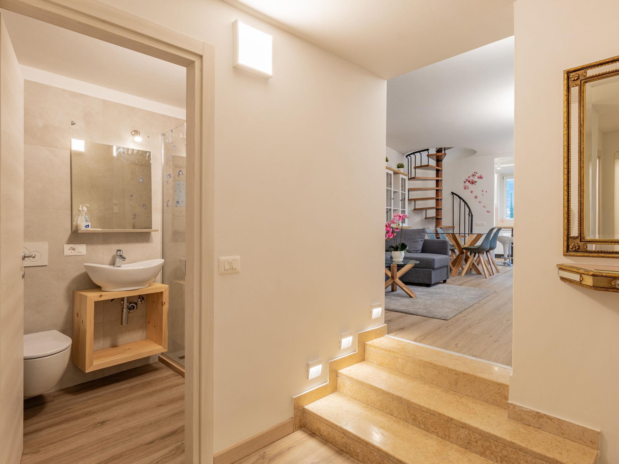 "Crosina", 3-room maisonette 90 m2, on the lower ground floor. Spacious and bright, very modern and cosy furnishings: entrance hall. Luggage room. Living/dining room with 1 double sofabed and TV. Open kitchen (oven, 4 induction hot plates, toaster, freezer, electric coffee machine) with bar, dining table. Shower/WC. Heating. Heating available only from 15.11. to 20.05. Upper floor: 1 double bedroom with TV. 1 room with 2 beds and 1 sofabed. Shower/bidet/WC. Heating. Small garden. Sitting area. Partial view of the resort. Facilities: washing machine, iron, mosquito net, hair dryer. Parking (roofed) at the house. Please note: non-smokers only. Private entrance, no lift. IT022006B4R4FWH7UW