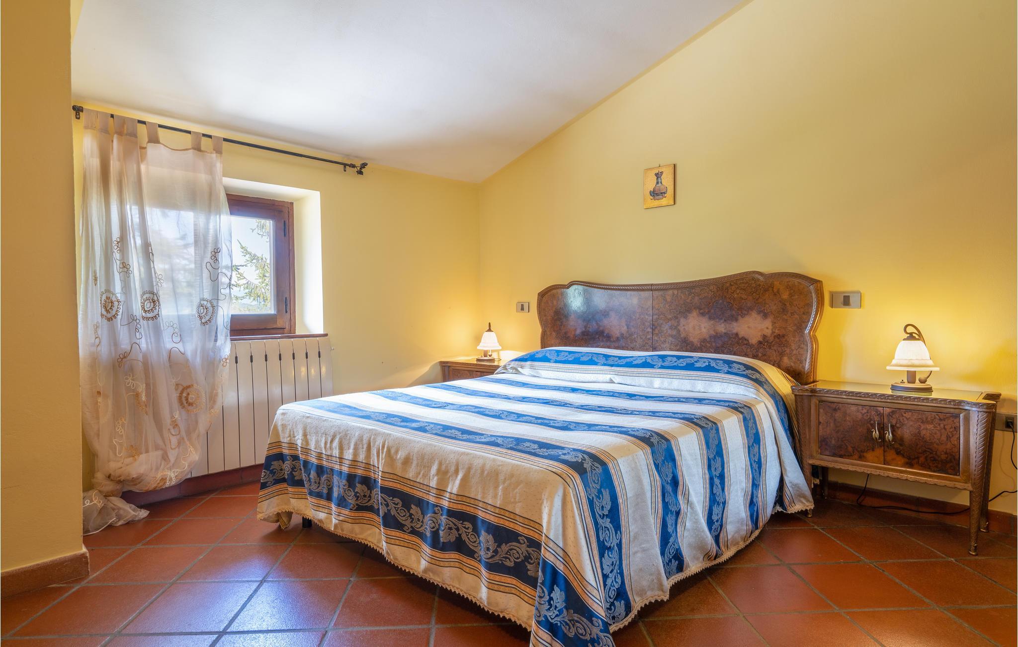 I stueetagen ligger køkkenet med åben kamin og to tilstødende stuer, også med pejs/grill og sofa samt et badeværelse. På første sal, som også kan nås via en udvendig trappe med en lille loggia (buegang), er der en anden pejsestue, tre soveværelser, en stue med sovesofa og et stort badeværelse. Overalt har du en smuk udsigt over de skovklædte bakker og Tiber-dalen.
