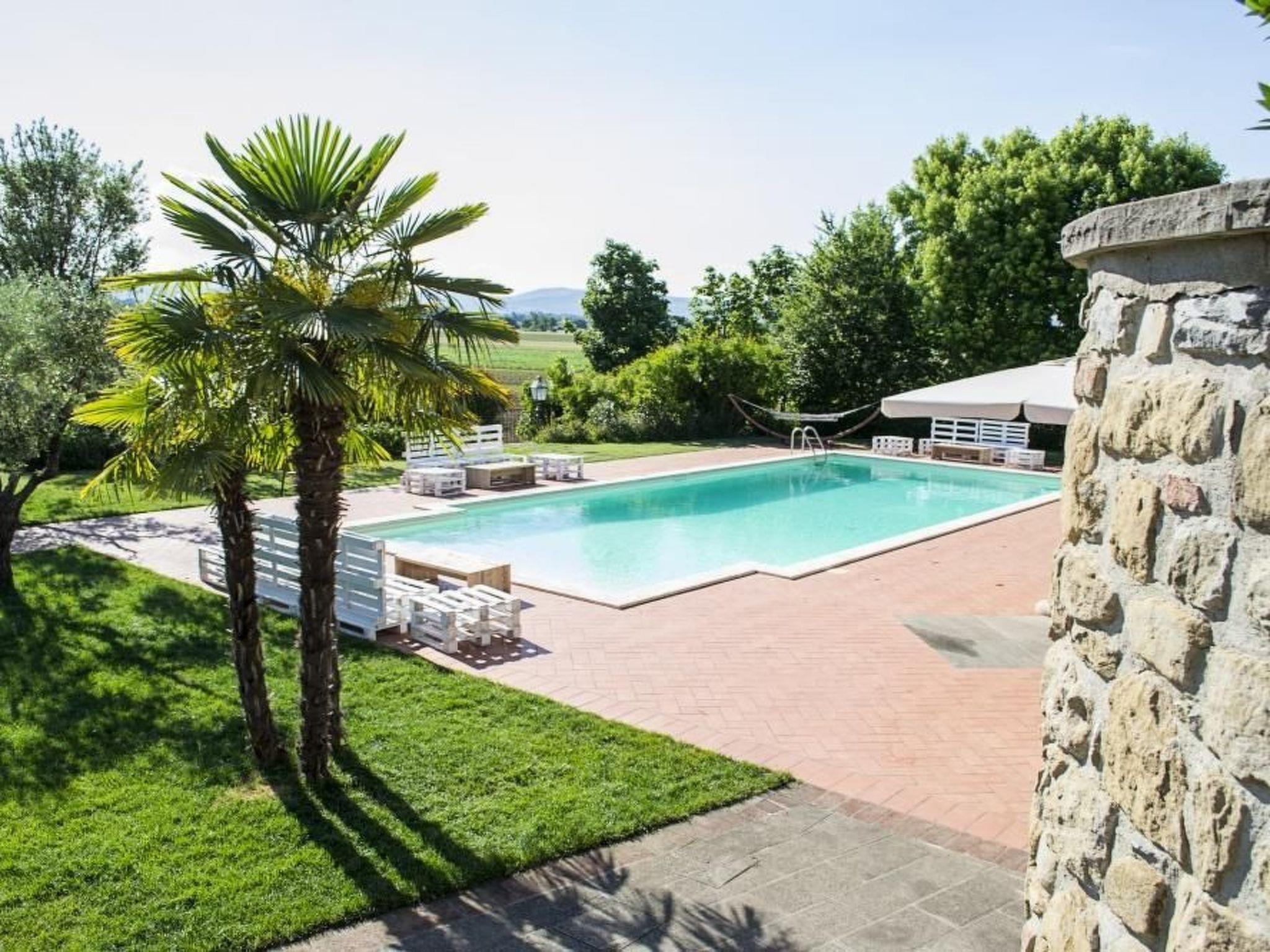Villa Leopoldina, immersed in a wide Italian-style meadow with a breathtaking view on the countryside and the surrounding hills, is a splendid sample of Tuscan rural architecture, dating back to the reclamation of the Valdichiana, established in the 18th Century by Granduca Leopoldo di Lorena, after who the architectural style and the villa itself are named.The whole complex, which hosts a chapel still consacrated, has been recently restored according to the new "green" philosphy that provided it with a photovoltaic system designed to guarantee the independence from the energetic point of view. Building materials, pieces of furniture and accessories in contemporary style make this villa a modern and elegant place: welcoming and comfortable, yet maintaining the authentic "taste" of the beautiful and majestic structure, untouched by time.The stone farmhouse: LeopoldinaThe ground floor boasts a spacious and elegant living room with stone fireplace and sitting area with sofas and satellite TV; magnificent dining room with large table ideal for groups up to 16 people; adjacent modern kitchen equipped with central island and up-to-date cooking devices. The floor is completed by a double bedroom with private bathroom, another bathroom with shower and laundry area. The first floor, used as sleeping area just like in the past, is accessible by both inner and outer staircase, the latter covered by a loggia. It is composed of two double bedrooms with private bathroom and two additional bedrooms, a double and a triple one, sharing a full bathroom with shower. In the Torre colombaia (the very top part of the house), which is another distinguishing feature of the Leopoldina architecture, there is a romantic double bedroom with private bathroom. Finally a triple bedroom with bathroom is located in the lovely stone annex.Garden and Pool:Inside the wide garden, guests can find the BBQ area, equipped with oven and grills; a gazebo where to enjoy al fresco meals overwhelmed by the smell of jasmine bushes and experience romantic sunsets in this part of countryside. The pool, equipped with solarium area and sunbeds can be reached both through the lovely staircase and the grassy ramp. Under the outer loggia it is possible to find a shadowed area with sofas and table where to eat open-air and an additional covered area equipped with kitchenette, fridge, sofas, TV, bathroom and dressing room. Villa Leopoldina is the perfect place for those who are looking for a relaxing though high quality holiday. The city centre is located just 10km away: there one can find services, museums, churches, monuments that worth a visit. Upon arrival, guests will be welcomed with a welcome basket with breakfast products.Short description 1Number of kitchens : 1SurroundingNearby sports facilities : Bike tours, Golf course, Indoor riding arena, Mountainbiking, Riding possibilitiesGarden and outdoorGarden facilities : Garden furniture provided, GrillOn-site leisure facilities : Outdoor swimming pool exclusive use, Solarium, Swimming poolService benefitsService facilities (may incur additional costs) : Breakfast, Chambermaid, Cleaning service during your stay, Cook, Shopping service before arrival