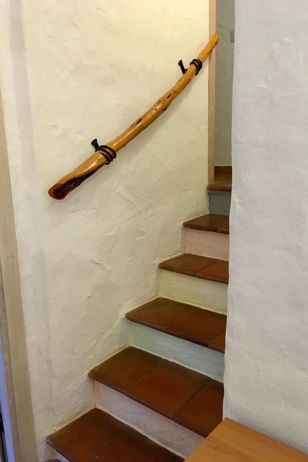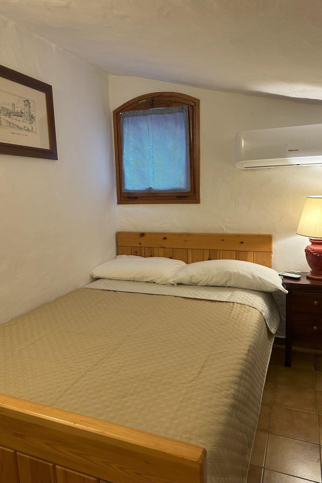 The holiday apartment is on three floors. The entrance area provides access to the bedroom with a double bed (160 x 190cm) and a great view of the Mediterranean macchia with the lovely cliffs, as well as to the bathroom with a shower. Seven steps lead to the upper level, with a little attic room with a French bed (130 x 190cm). The lowest ceiling height of the room is 1.65m. Seven steps down lead to the lower level with a living room with a sofa bed for two people (160 x 190cm), a kitchen and a veranda. The charming apartment is ideal for couples or a family with two children. Air conditioning is available in the bedroom with a double bed and the living room. The fireplace cannot be used.