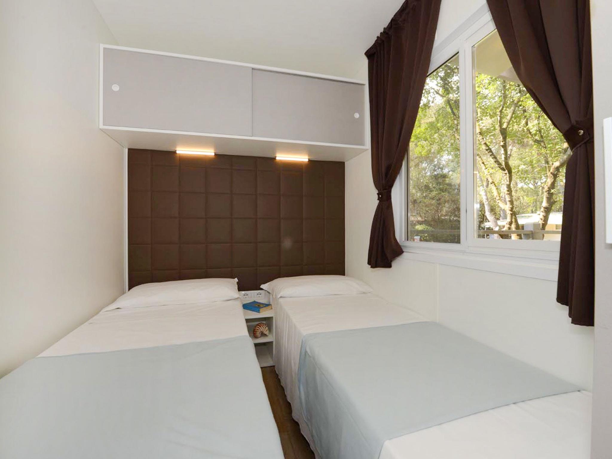 "Capri", 4-room mobile home 34 m2. Modern furnishings: living/dining room with kitchen corner, satellite TV and air conditioning. Exit to the terrace. 1 room with 1 double bed (160 cm, length 200 cm), shower/WC. 2 rooms, each room with 2 beds (80 cm, length 200 cm). Open kitchen (4 gas rings, freezer). Shower/WC. Air-conditioning (extra). No heating option. Terrace roofed. Terrace furniture, deck chairs (1). Parking (1 car). Please note: non-smokers only. IT061088B3LUIBMCPY