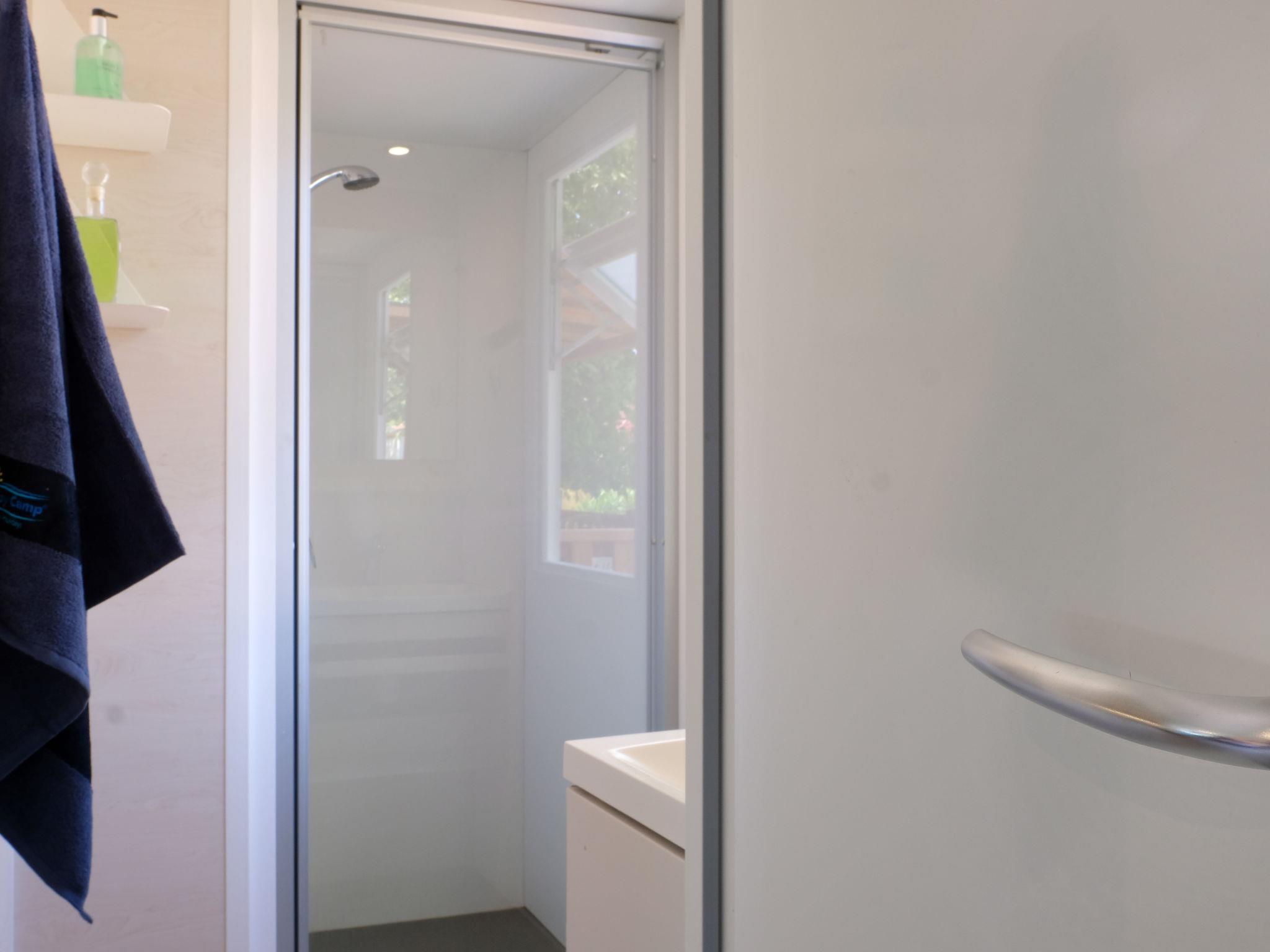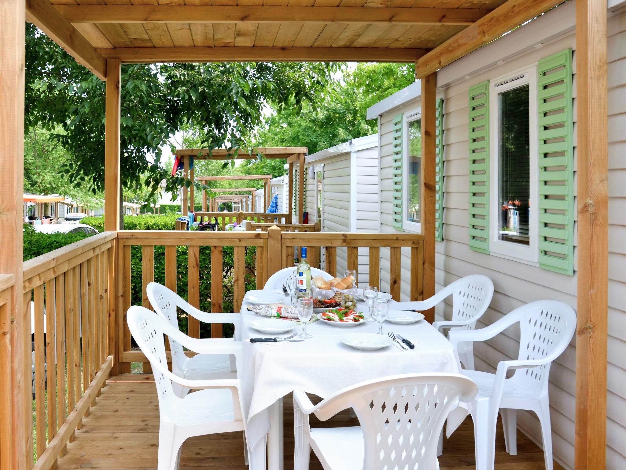 "Happy Premium", 4-room mobile home 30 m2. Comfortable furnishings: living/sleeping room with dining table, electric heating and air conditioning. 1 room with 1 french bed (140 cm, length 190 cm). 2 rooms, each room with 2 beds (70 cm, length 190 cm). Open kitchen (4 hot plates, microwave, freezer, electric coffee machine). Shower/WC. Air-conditioning (extra). Terrace partly roofed. Terrace furniture, electric barbecue (portable), deck chairs (2). Facilities: mosquito net. Parking (1 car). Please note: non-smokers only. IT023006B143AX8QZE