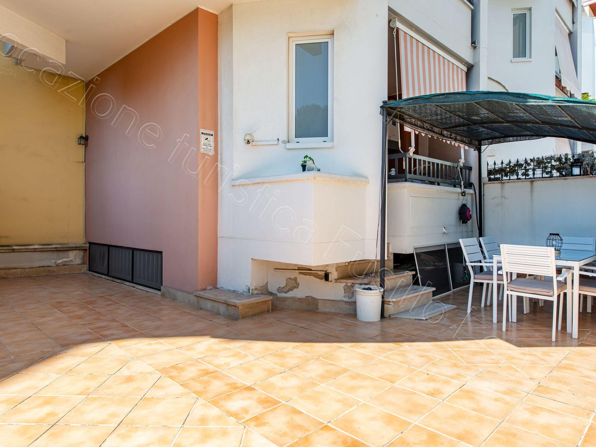 Outside, the flat boasts a terrace furnished with a lovely gazebo, ideal for enjoying meals al fresco and taking in the evening breeze. For those arriving by car, convenient parking is available on the terrace, making it even easier to explore the surroundings. This outdoor area is a true piece of paradise where you can relax after a day of sightseeing or the sea.