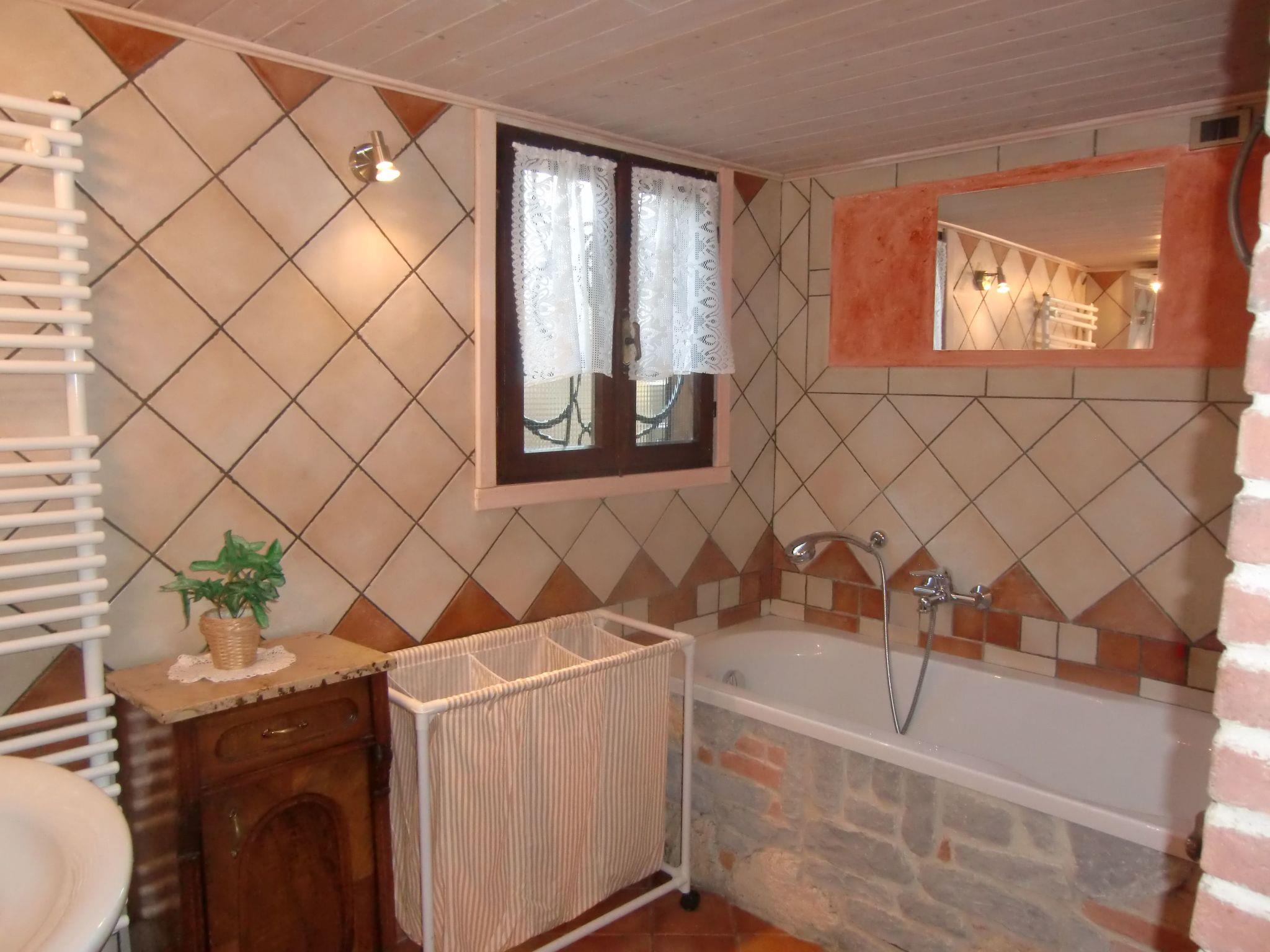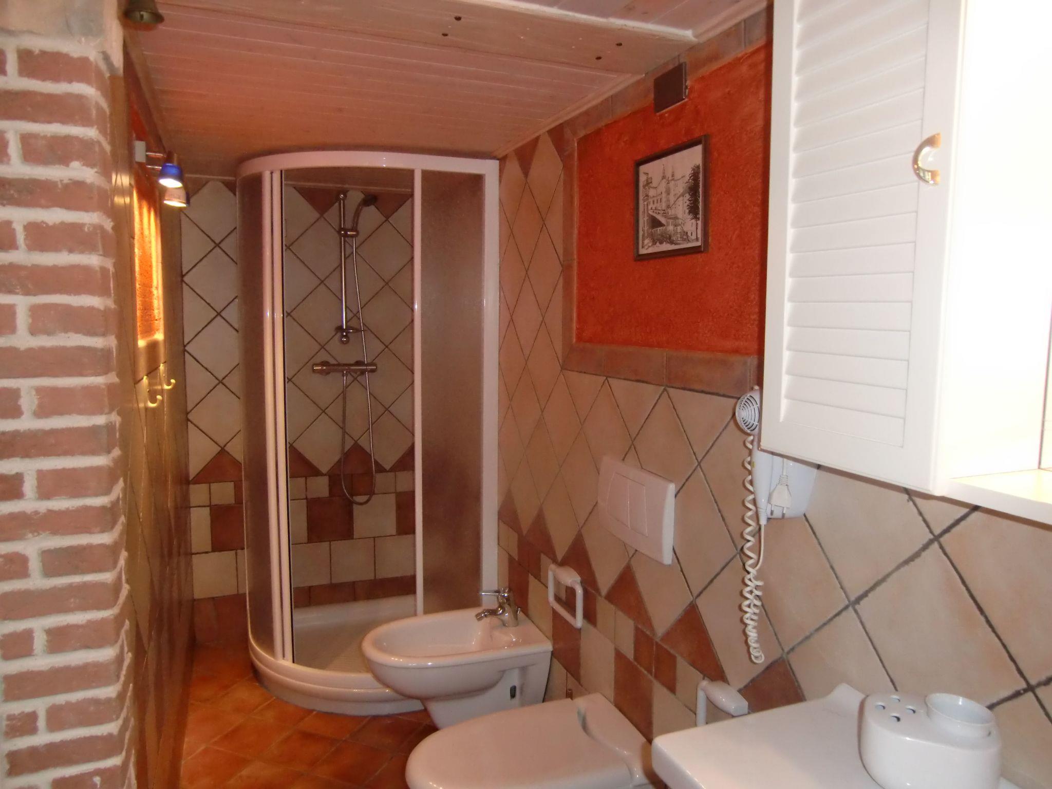 Inside, **Casa Carla** stands out for its comfortable furnishings on two levels, both easily accessible. The masonry ground floor boasts a cosy living room with sofa, armchairs, wood-burning fireplace, table and chairs and satellite TV, as well as a washing machine for all your practical needs. The main bathroom, decorated in rustic style with stone cladding, includes a modern shower stall and bathtub, while a second bathroom is equally well equipped.