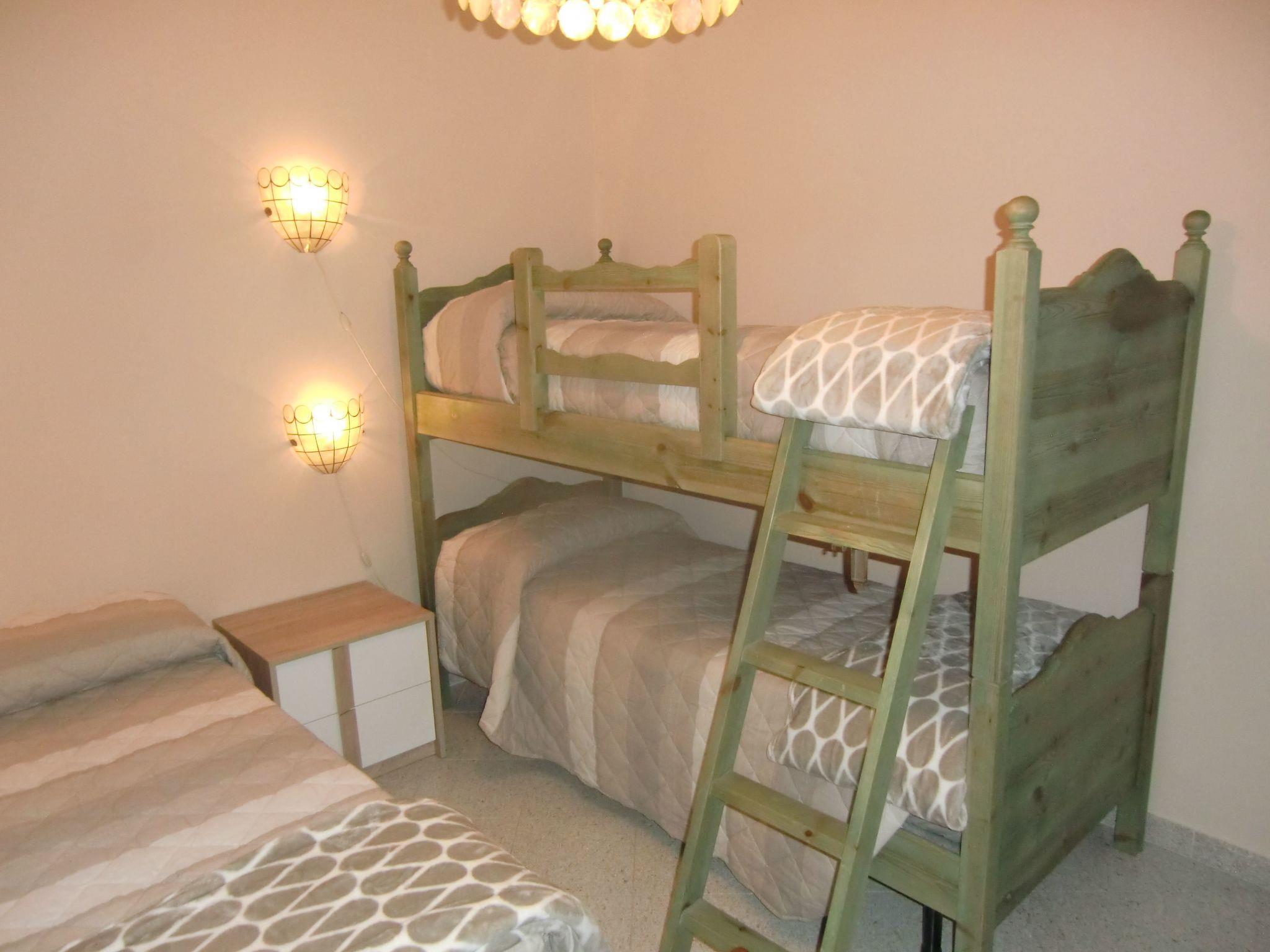 In the living room, which is quite large, we have a dining table, sofa, satellite TV and a wood-burning fireplace. On the first floor we have two bedrooms, one with a double bed and one with a bunk bed plus a single bed and another bathroom.