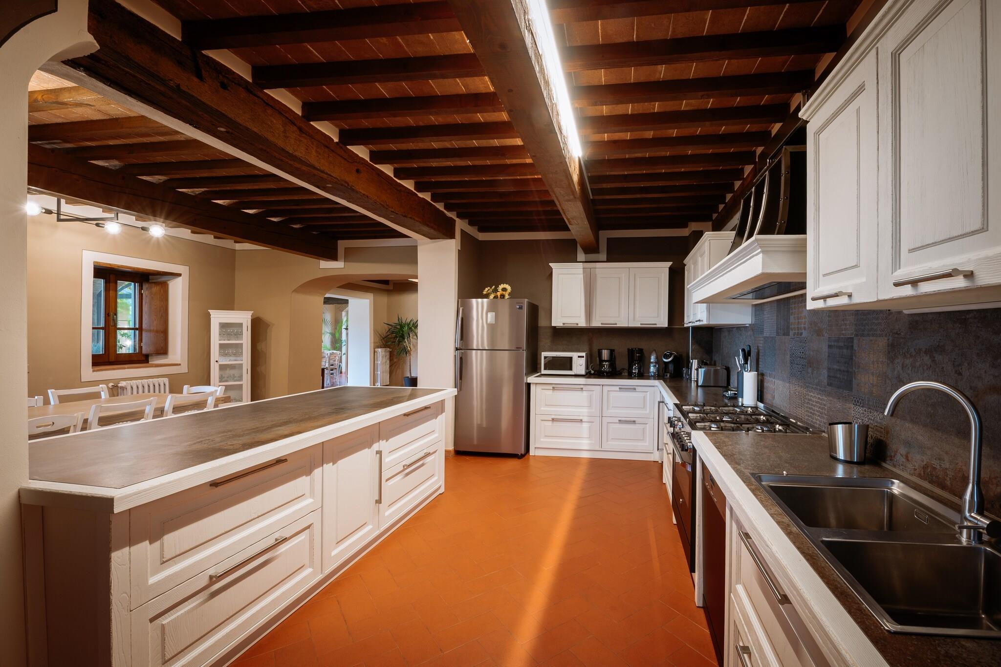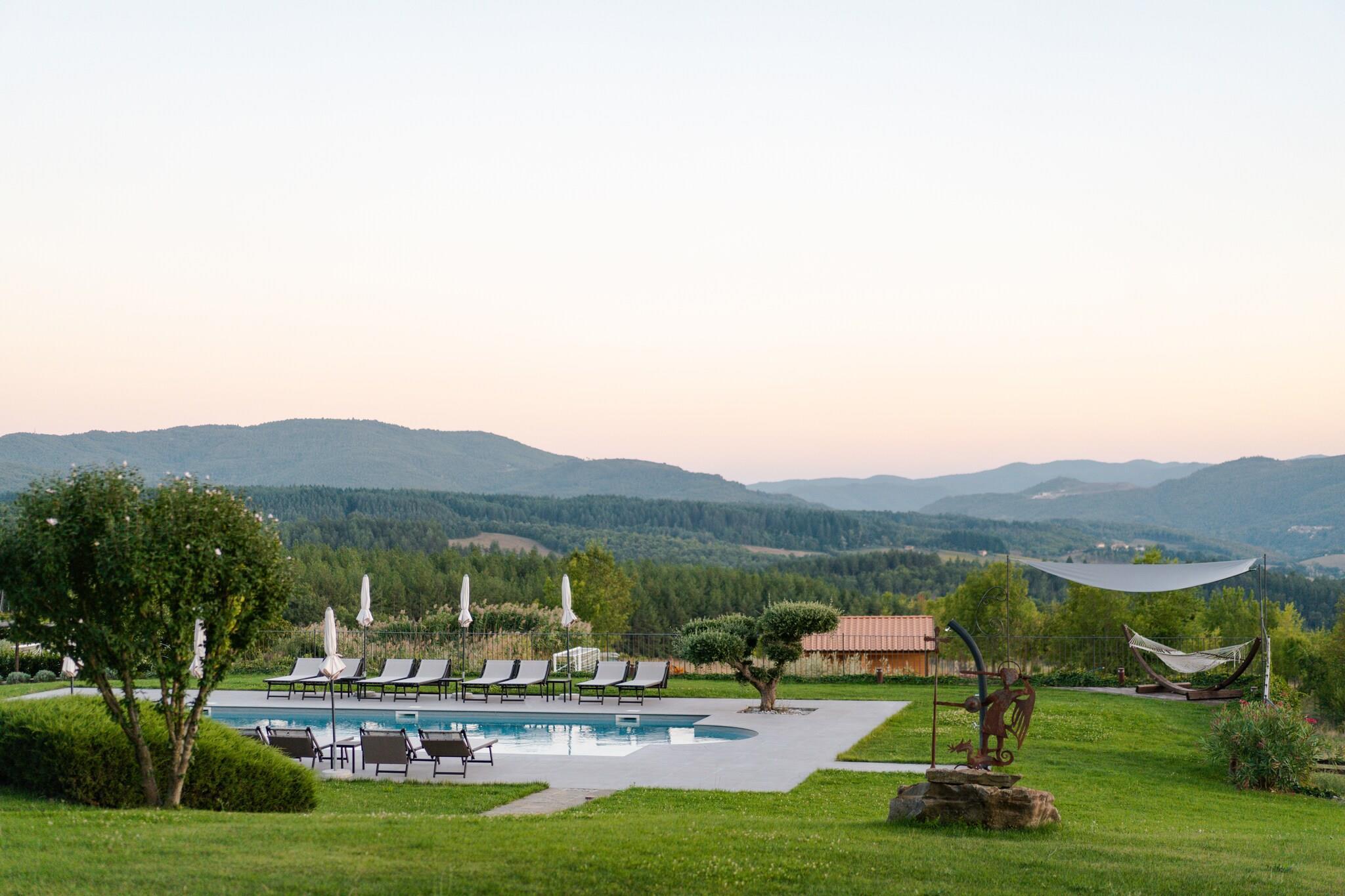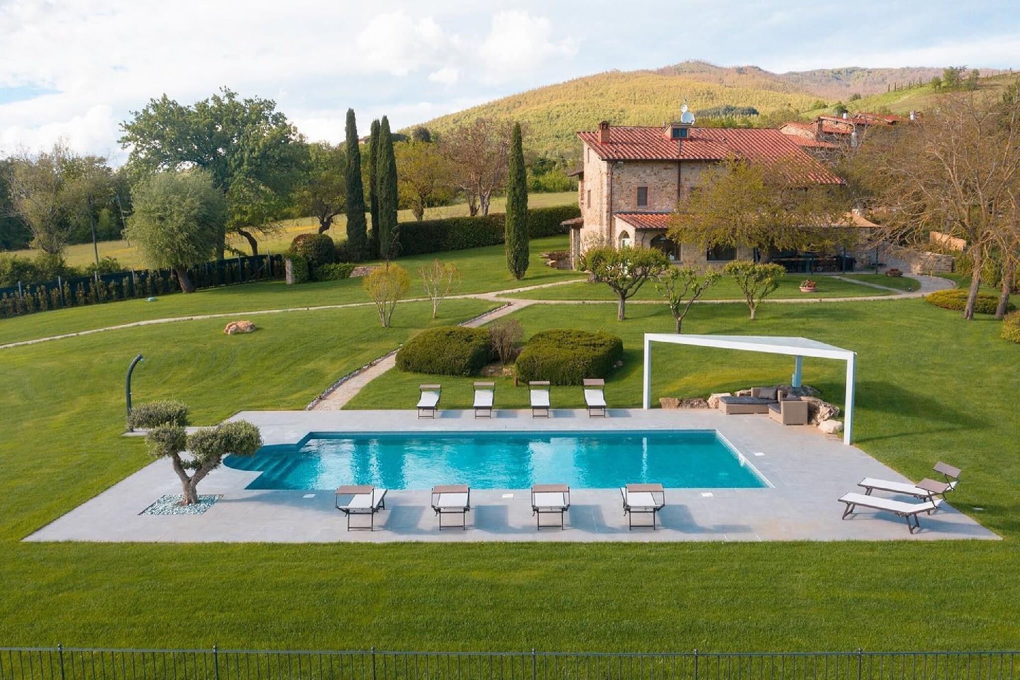 The interior is fully furnished and is characterized by a bright open-space that connects the living room to the kitchen with the garden view. On the ground floor you will find a room framed and embellished by a majestic fireplace flanked by three comfortable sofas, a satellite TV, a studio designed for those who love reading, a bathroom and a kitchen suitable for all your needs. It is divided into three floors connected by rustic stone stairs and consists of 12 modern and spacious double bedrooms with 12 private bathrooms. The whole house is provided with Wi-Fi. The Tuscan structure being surrounded by clean and fresh air does not need air conditioning and you can keep the windows open, equipped with mosquito nets in every room. The interior design wisely combines antique and modern furniture. In all rooms you will find massive solid wood beams and the terracotta attic and floors together with plenty of processed chestnut wood, emphasize the rustic character of this villa. The holiday home is provided with 12 double bedrooms with panoramic view of the area and 12 private bathrooms equipped with bed linen and shower. The rooms are located on the first, second and third floors and are connected by stone stairs. On the first floor there are two large suites and one suite with a double sofa bed, suitable for children who would like to sleep next to their parents. This room has a glass door through which you have access to an exclusive courtyard, ideal for an aperitif for two. On the second floor there are four double bedrooms and on the third floor there are three double bedrooms too, all with a private bathroom. On the top floor there is a double bedroom and an additional twin bedroom, which opens onto a second bedroom with a double bed suitable for two children. All of them have a private bathroom. The rooms are furnished in a modern rustic style that reflects the luxury of the structure and the simplicity of Tuscany. Each room has the name of a town, recalling the Casentino history. We have carefully and precisely chosen the best quality products for you. The living room has a bright and cozy entrance with a view of the entire property and the valley. It is equipped with armchairs and sofas that have been handcrafted by a historic local company. In the living room you will find many beautifully designed lamps, the master fireplace and a 4K satellite TV where you can watch documentaries, movies and cartoons. Subscriptions to Netflix and Amazon Prime are included too. The kitchen is located on the ground floor where it forms an open-space with the living room. Next to it you will find a guest bathroom and a secondary entrance leading to the garden. Bright and welcoming are the features that strike at first glance. The uniquely designed kitchen is equipped with customized furniture. There is an electric oven, gas hob with five burners, large fridge with freezer, microwave, dishwasher and refrigerator cellar with red and white wines department. From the kitchen you get to an adjoining room where there is a pizza oven and there is plenty of space for food and drink supplies. The windows that flank the dining table show a breathtaking view of the garden and pool. The kitchen has been made to celebrate and enjoy your stay trying to cook or calling a real chef. If you would like to be spoiled by a local chef with a Tuscan/Italian menu to celebrate and enjoy a special evening, we can arrange it for you. On the outside, thanks to an enchanting garden of 25000 square meters made of cypresses, olive trees and oleanders, you will be immersed in the valley’s nature. The illuminated pool (16m x 5m x 1,5m) with panoramic view, gazebo, umbrellas and comfortable sun beds will make you live a unique experience. The sofas by the pool, the outdoor shower and the large hammock will offer you comfort and relaxation for the entire duration of the holiday. Two stunning solid oak wooden tables are located in the large roofed veranda and are perfect to have lunch, dinner, to celebrate and spend time in case of bad weather. Near the veranda is the masonry barbecue area, ideal for grills with family and friends. The view focuses on the imposing gelso tree (which gives name to the structure) in front of the villa. The scenic lighting throughout the garden and around the swimming pool creates a suggestive atmosphere. In the large covered veranda there are two magnificent solid oak tables. Ideal to sit comfortably while celebrating and eating all meals with the whole group. The view falls on the imposing tree directly in front, which gives name to the holiday structure: Il Gelso. Next to the veranda is the brick barbecue area, perfect for your barbecues. Enjoying the mild summer evenings here with friends or family members is definitely the highlight of every holiday day. The picturesque lighting throughout the garden and around the pool makes these evenings unforgettable. In the center of the well-kept garden is the swimming pool (16m x 5m x 1.5m) with internal lighting for the night and sun shower and beds. The location is idyllic, surrounded by nature with the sun shining all day long. In the relaxation area you will find comfortable sofas and the super relaxing hammock to rest at any time of the day. The poolside tables are ideal for sipping your favorite drink and enjoying it while watching your children play and admiring the view. For the little ones there is a table tennis table sheltered by a canopy in case of bad weather and next to it a soccer field to challenge the whole family. Services list: Hot water Gas for cooking Electricity (up to 200 KWh/ week) Heating Linen for beds, bathrooms and kitchen with weekly change Barbecue Wood for the barbecue Moka Kettle Washing machine Fridge with freezer Toaster Dishwasher Coffee machine Oven Microwave oven Wifi 4K satellite TV Netflix subscription Amazon Prime subscription Shower cabin Basin Toilet Bidet Sinks Hairdryer Cooling fan mosquito net Studio Pool Outdoor s