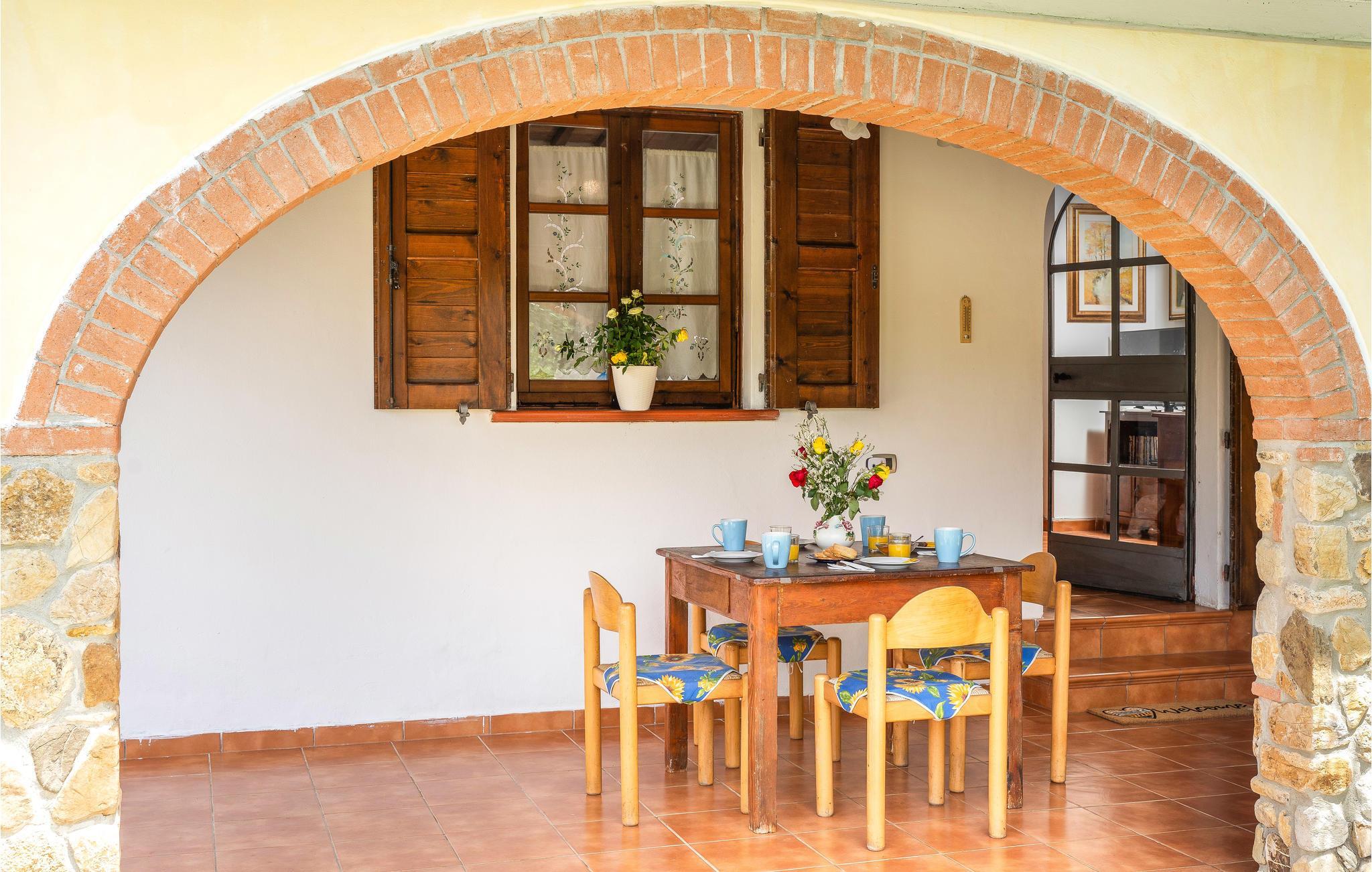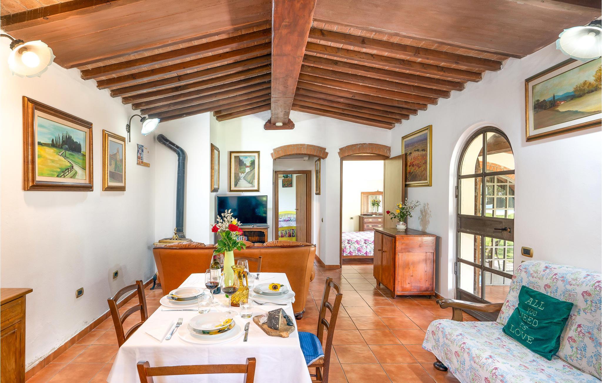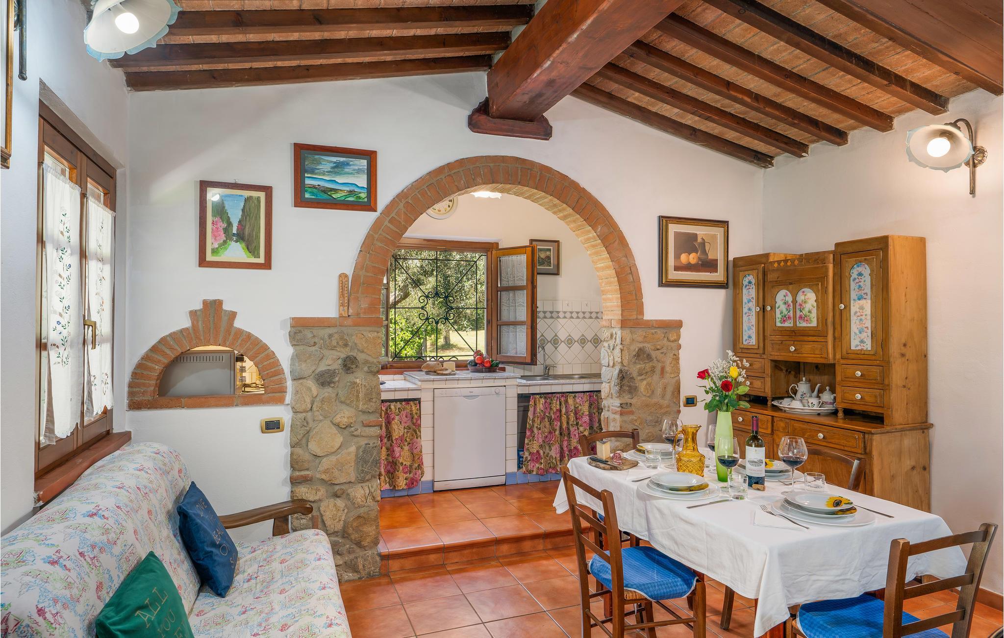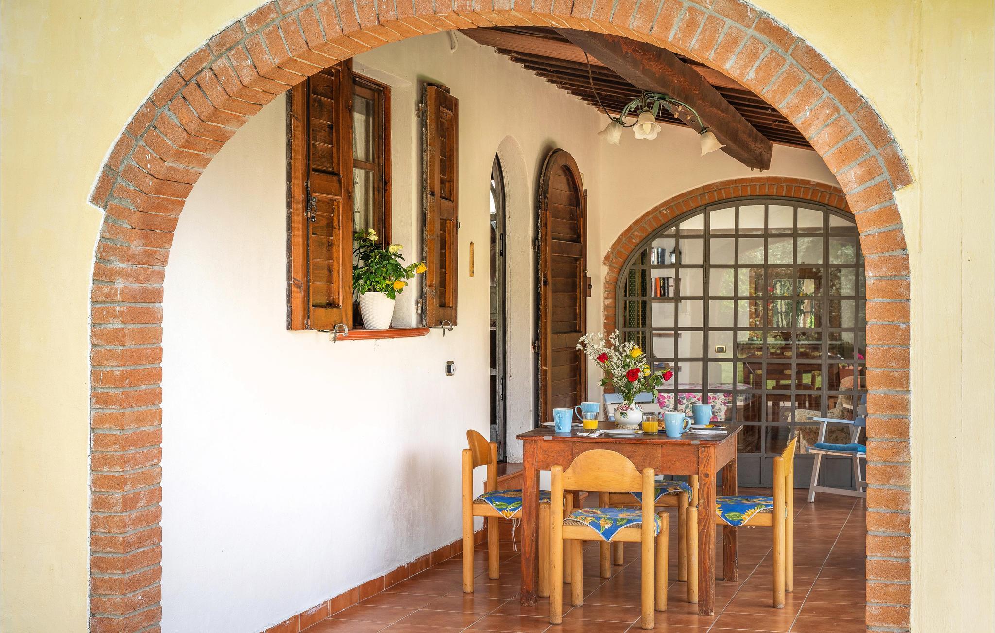 Dette indbydende hus har en idyllisk beliggenhed omgivet af det fantastiske toscanske landskab. Læn jer tilbage i de indbydende, autentisk møblerede værelser, designet i stil med en gammel landejendom. Gamle trælofter, klinkegulve og buede vinduer giver indretningen charme. Om aftenen kan I gøre det hyggeligt sammen ved det lange spisebord.