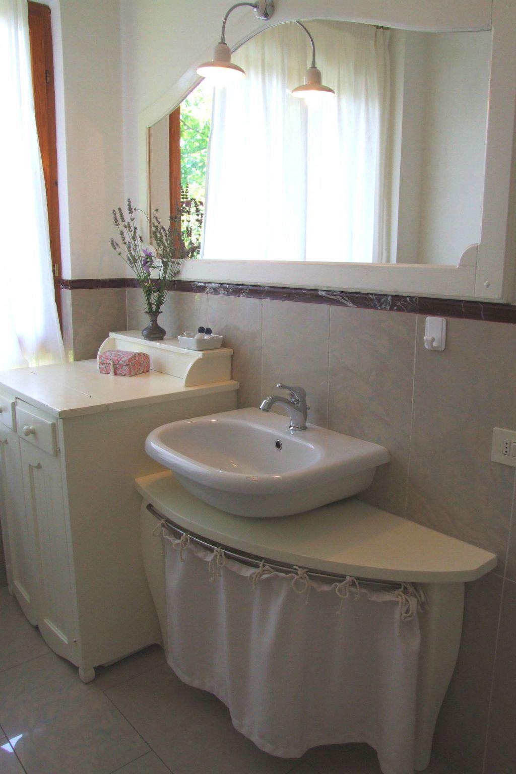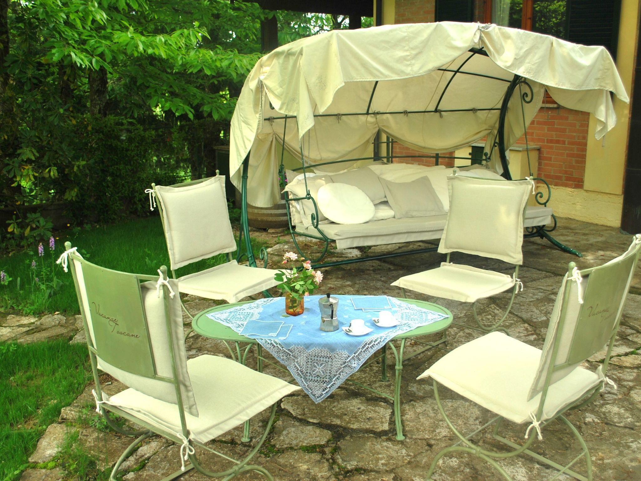 From the living room there is access to the covered terrace, shaded by the green chestnut tree, ideal for outdoor dining, and furnished with a marble table and wrought-iron chairs and a sofa with comfortable cushions. The living room leads to the two bedrooms (one with an extra bed) with en-suite bathrooms.