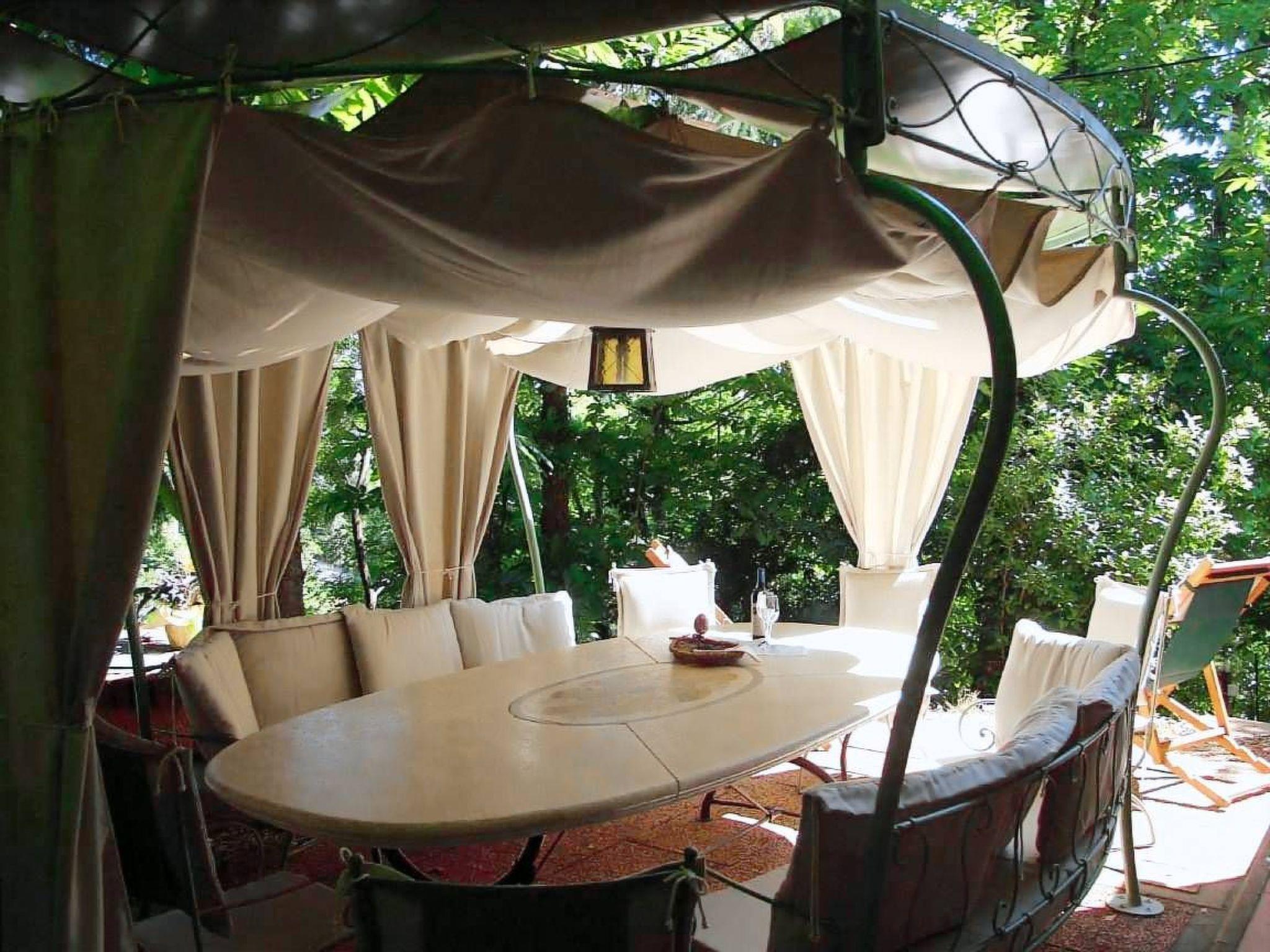 In front of this entrance is a gazebo for outdoor dining with a marble table and wrought-iron sofas with comfortable cushions.