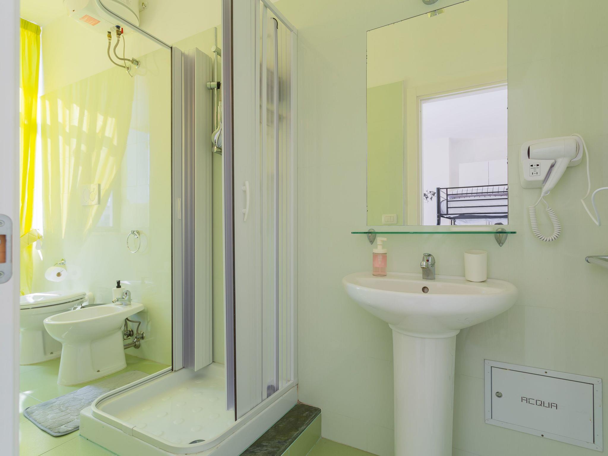 The bathroom is designed for your exclusive use and, although compact, is efficient and well appointed. You will find a washbasin with a backlit mirror, a shower cubicle, a washing machine and dispensers for shower gel, shampoo and soap, all in a clean, contemporary style.
