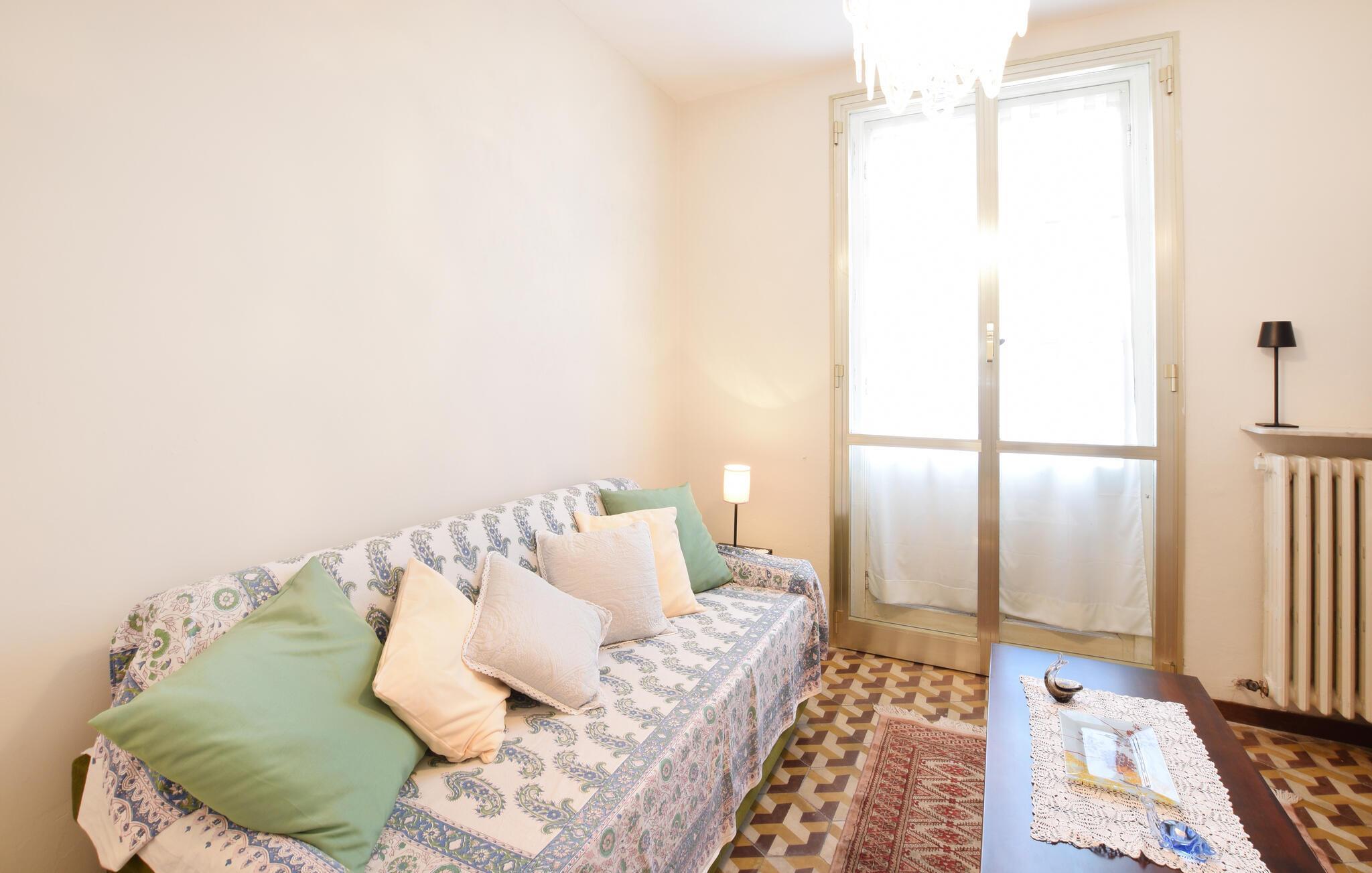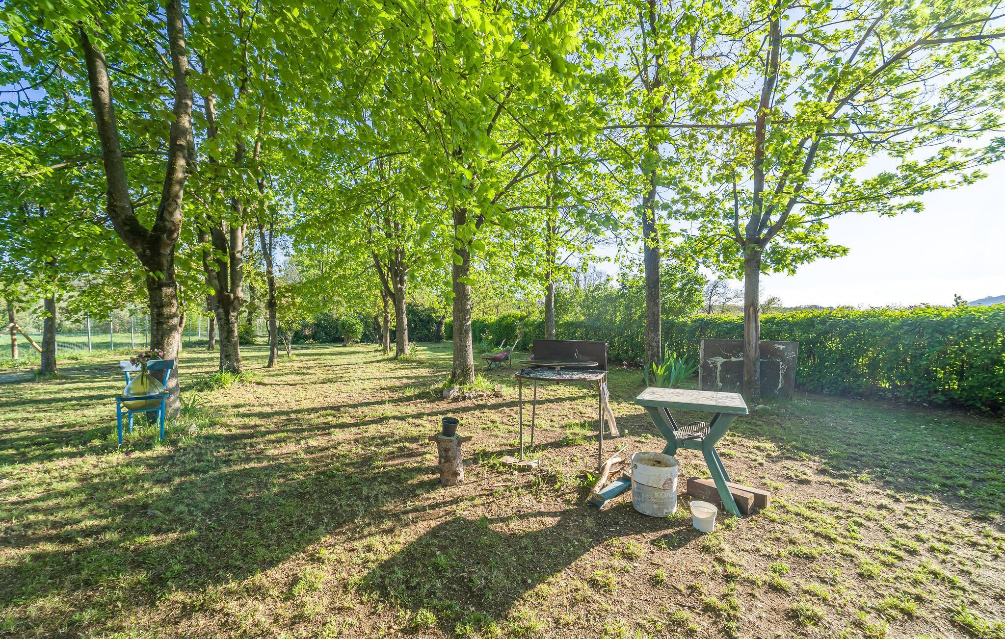 Nyd tiden sammen i det hyggelige interiør i denne indbydende ferielejlighed, som er noget særligt med varme farver og fine detaljer. Lav mad sammen i det fuldt udstyrede køkken med et retro-touch og nyd jeres måltider ved det indbydende spisebord med udsigt over de grønne træer. Efter en begivenhedsrig dag kan I lægge fødderne op i den komfortable sofa og nyde en spændende bog eller have en spilleaften.