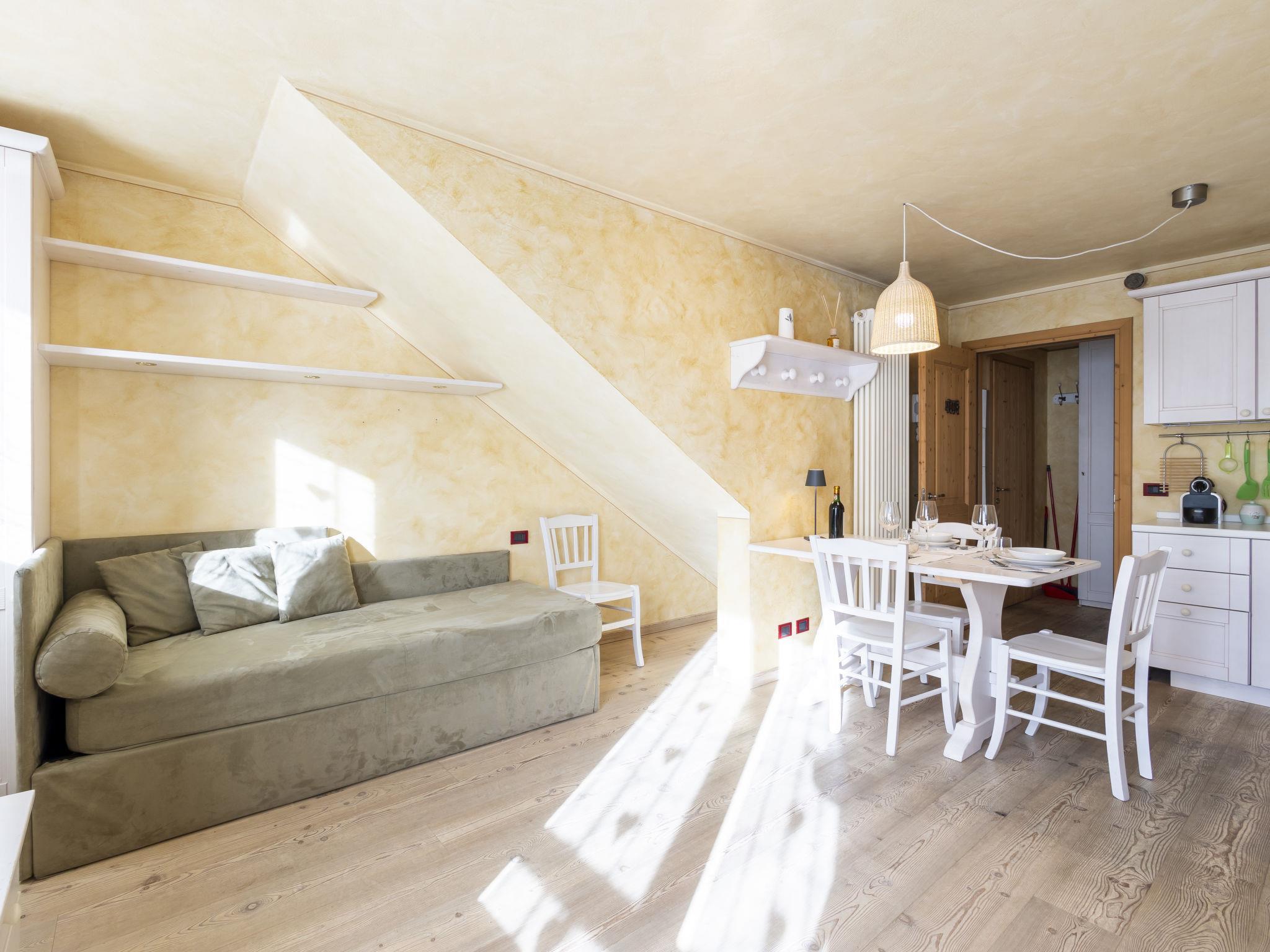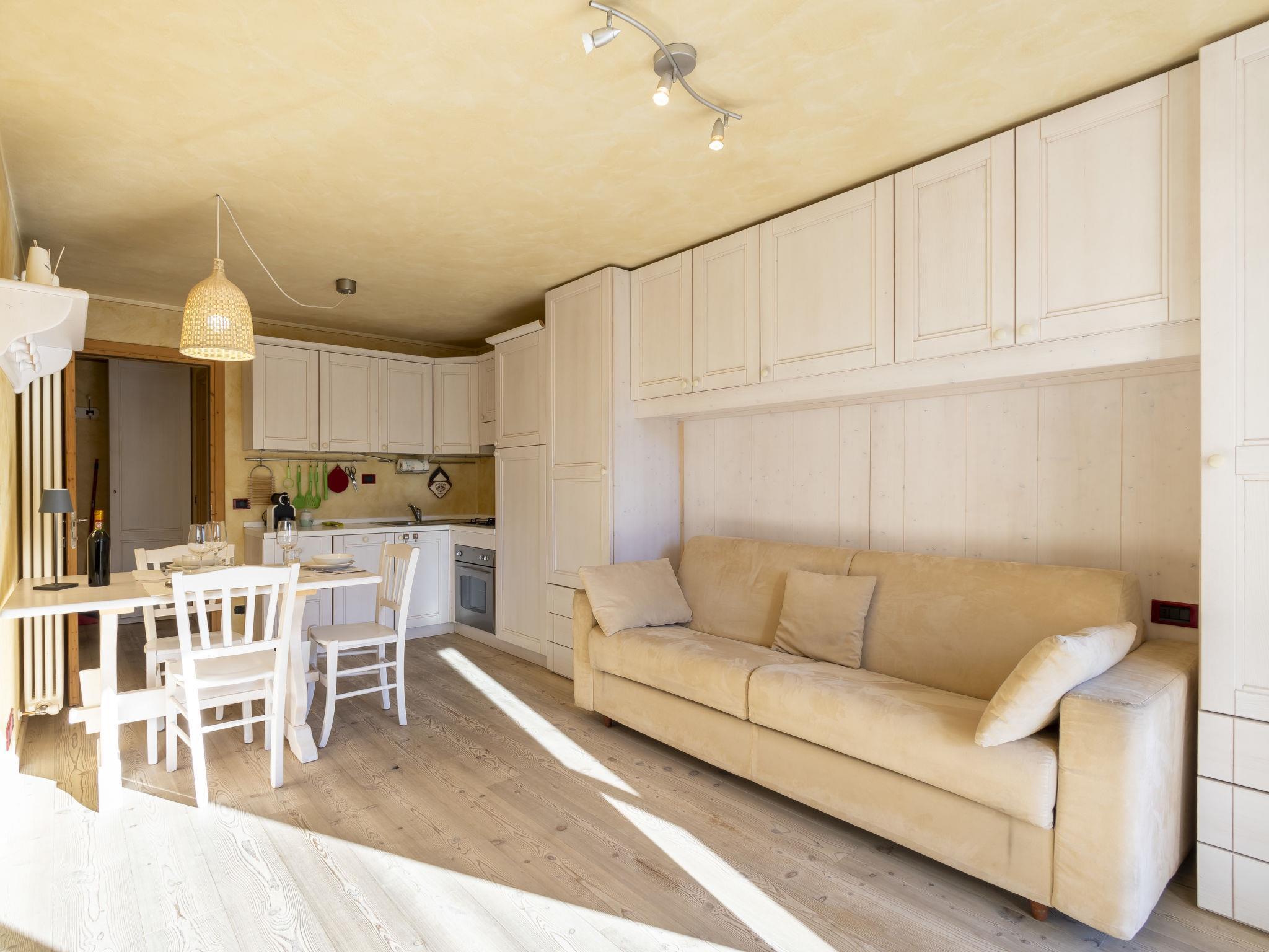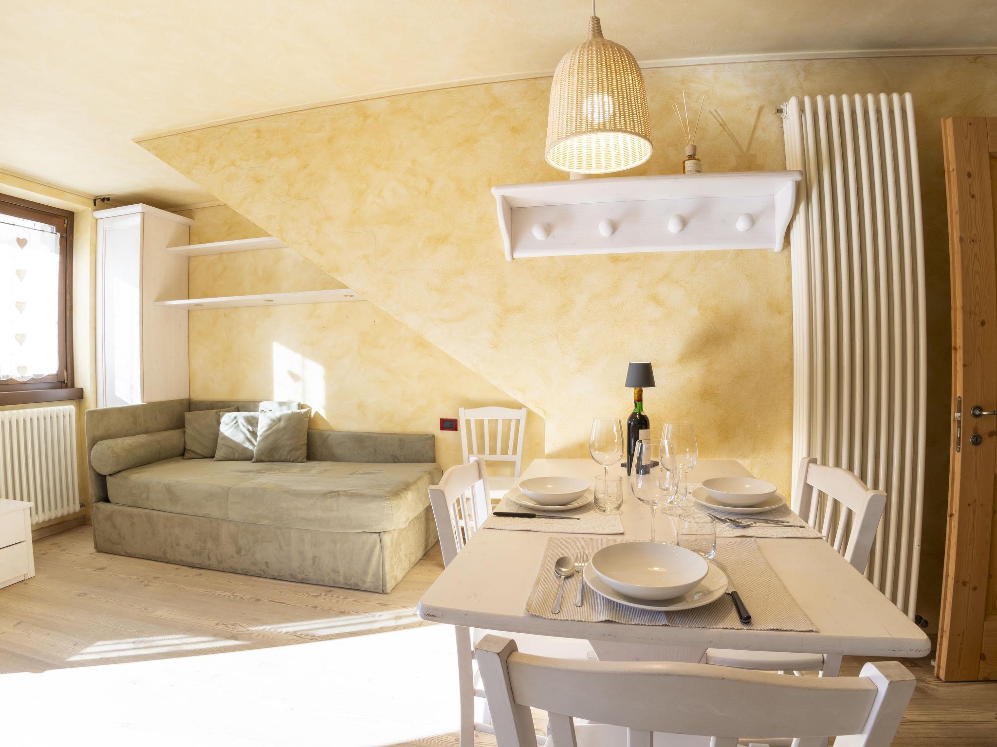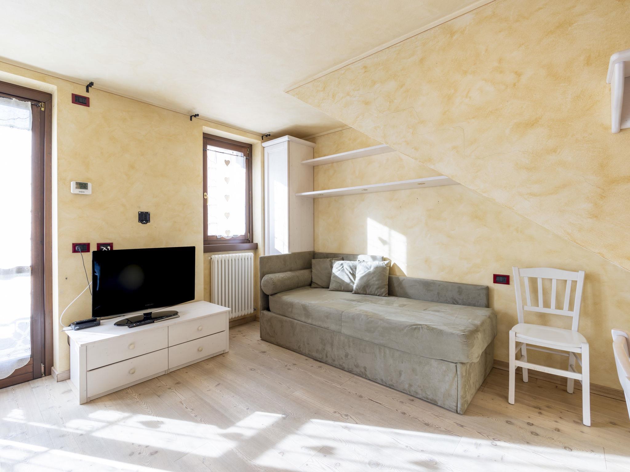 1-room studio 38 m2 on 1st floor. Practical and comfortable furnishings: living/dining room with 1 double sofabed, dining table and TV. Exit to the balcony. Kitchenette (4 hot plates, oven, dishwasher, toaster, kettle, microwave, electric coffee machine, Capsules for coffee machine (Nescafè Dolcegusto) free). Shower/bidet/WC. Parquet floors. 2 balconies. Balcony furniture. View of the mountains and the town. Facilities: children's high chair, baby cot, hair dryer. Internet (WiFi, free). Please note: suitable for families. Non-smokers only, no parking. Maximum 1 pet/ dog allowed. IT014009B4EVT3NEMU