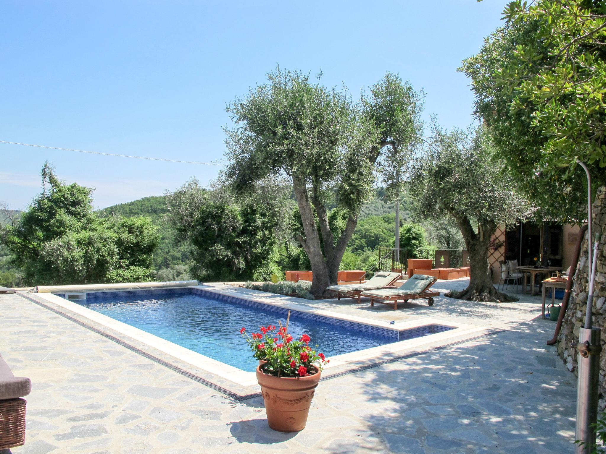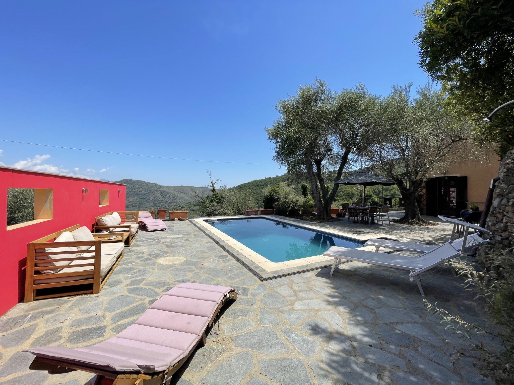 Comfortable single-family house "Il Rifugio", 380 m a.s.l., detached, built in 2011, surrounded by trees and fields. 300 m from the centre of Boscomare, on the outskirts, 9 km from the centre of San Lorenzo al Mare, 15 km from the centre of Imperia, 9 km from the sea. Private: beautiful, well-kept terraced garden, 300 m2 with wildlife garden and trees, swimming pool (7 x 3 m, depth 150 cm, seasonal availability: 15.May. - 01.Oct.). Outdoor shower, patio, terrace, garden furniture. In the complex: sun terrace. Stepped path (14 steps) to the house. Parking at the house. Shop 4 km, supermarket 9 km, restaurant, bus stop 200 m, railway station "Imperia Porto Maurizio" 15 km, sandy beach "San Lorenzo al Mare" 9 km, indoor swimming pool 15 km. Golf course (18 hole) 32 km.