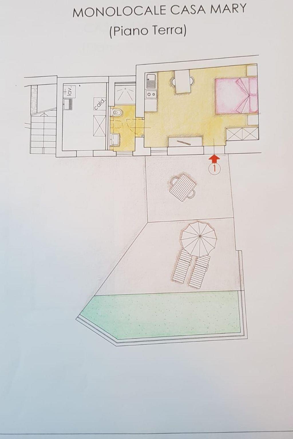 Casa Mary is located in Castello di Brenzone, above the church, and has a total of three holiday flats. This new one-room flat is located on the ground floor and has a living space of approx. 30 square metres. It has a separate entrance into the living/bedroom with a double bed and a dining area as well as a kitchenette with 2 electric hobs, coffee machine, fridge and toaster, separated by a curtain. The bathroom has a shower, WC and a washing mat, satellite TV, heating, wifi, hairdryer and iron.
