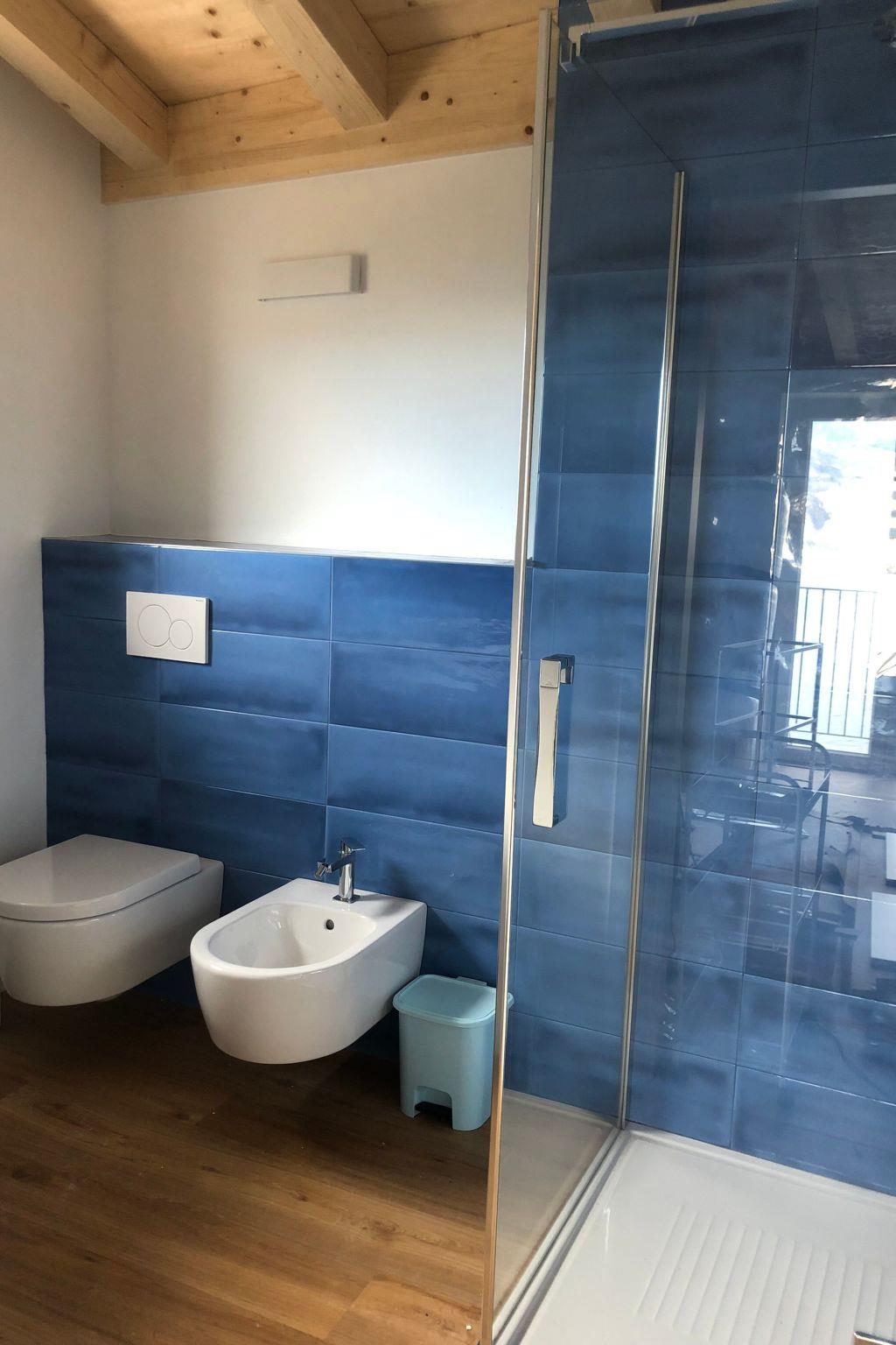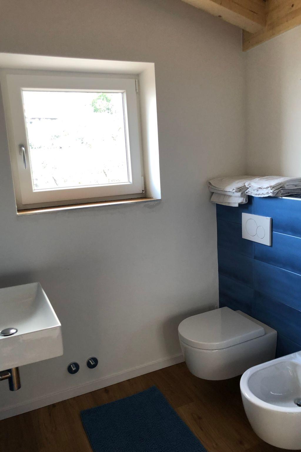 A bathroom with shower, washbasin, bidet and toilet, small balcony with table and chairs. On the ground floor there is a large garden for common use, a barbecue and a private car park, all with lake view.