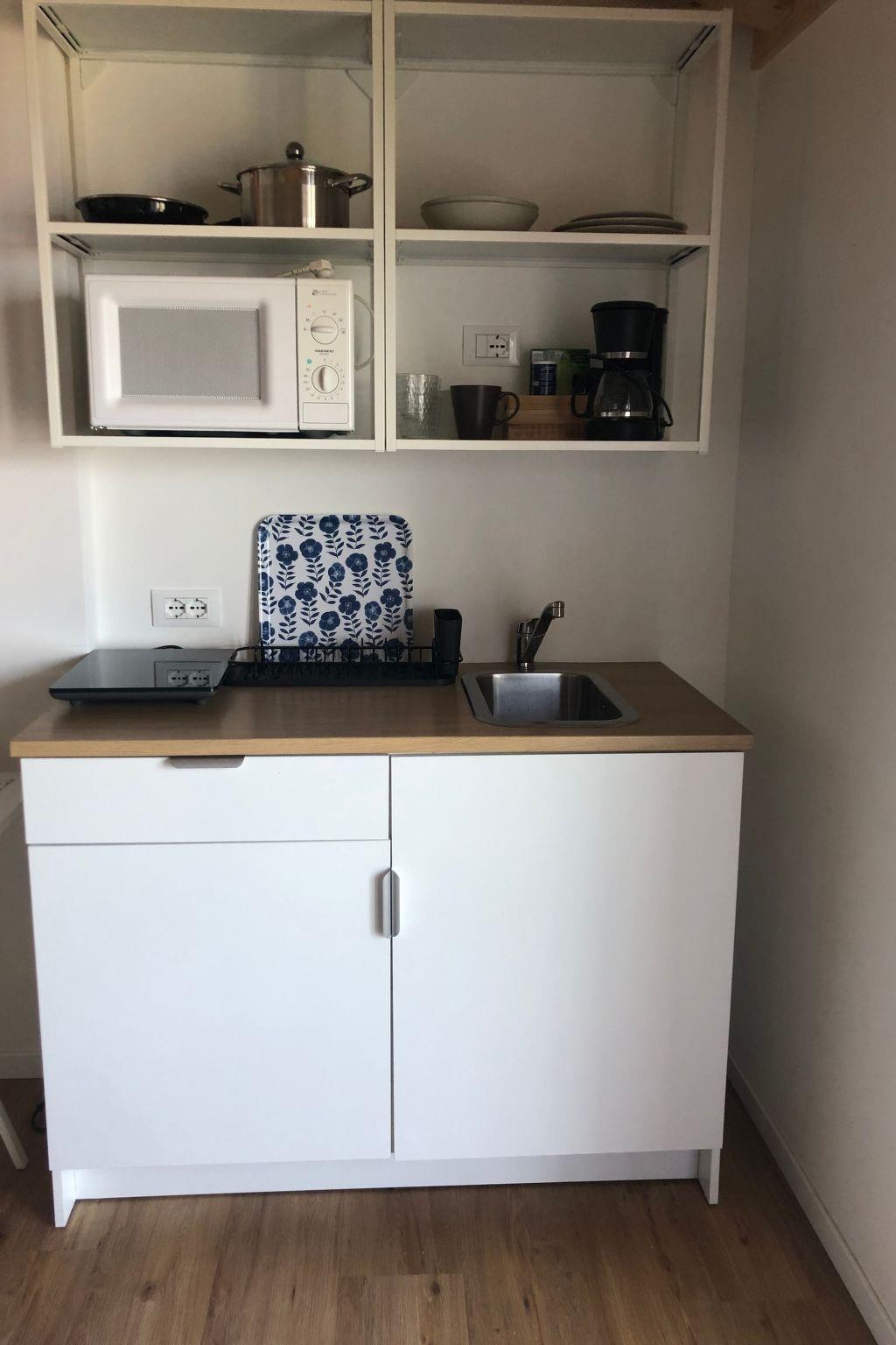 The n. 8 is a new room. It is located on the 2nd floor. There is a double bed, a small kitchen with induction hob, small sink, microwave, toaster and coffee maker, fridge.