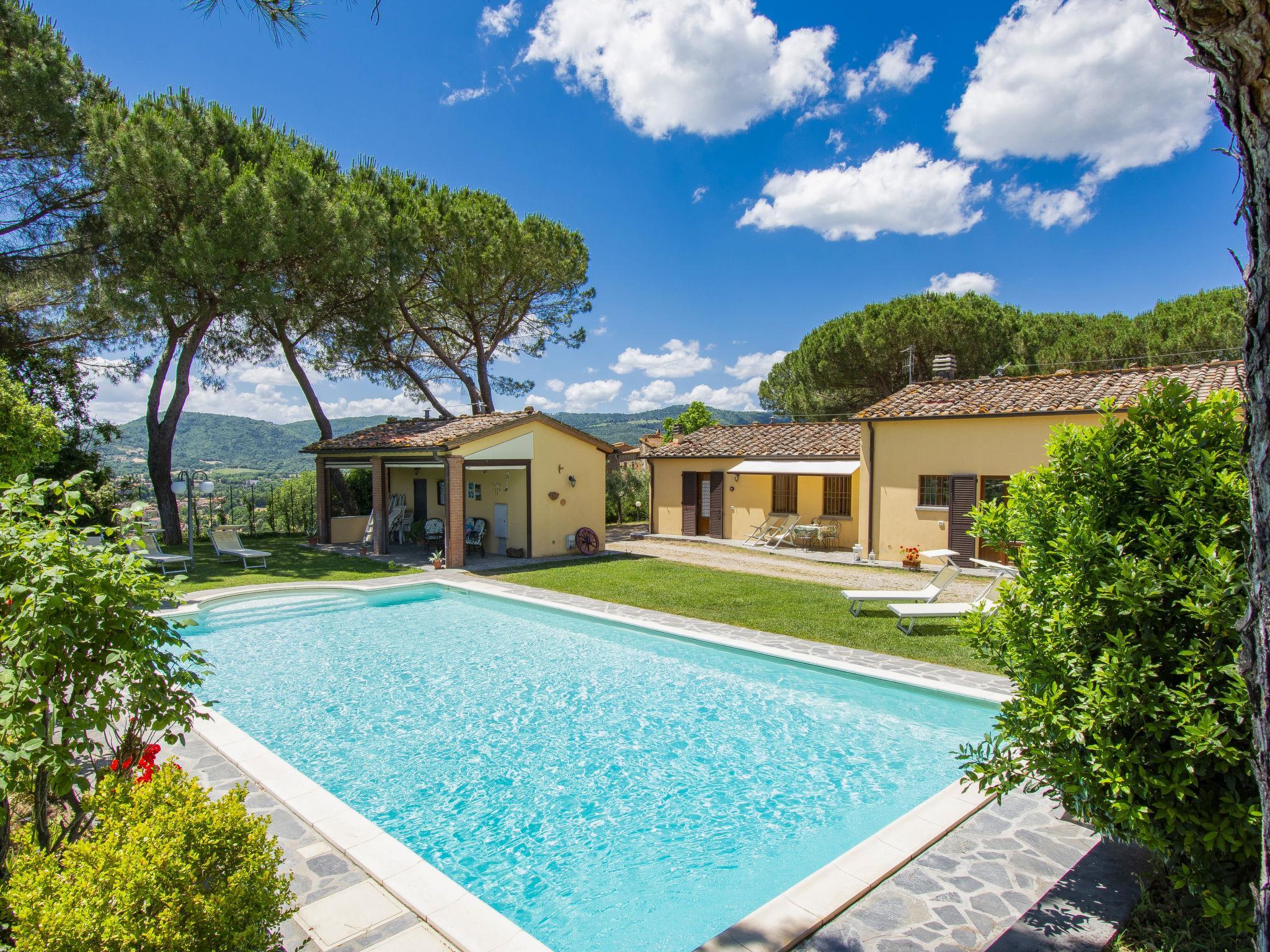Residence "Cedri Alti", surrounded by trees and fields. 4 houses in the residence. Above Gavignano in Val d'Ambra 5 km from the centre of Bucine, 1 km from the centre of Ambra, 32.5 km from the centre of Arezzo, in a quiet, elevated position. For shared use: property 14 ha, garden 6'000 m2 (fenced) with lawn and trees, meadow, orchard, swimming pool (12 x 6 m, depth 70 - 240 cm, seasonal availability: 15.Apr. - 31.Oct. pool opening hours: 00:01-24:00). Outdoor shower, poolhouse, table tennis, terrace, garden furniture, barbecue. In the house: table tennis, table football. Parking. Shop 1.4 km, supermarket 7 km, bus stop 500 m, railway station "Bucine" 3 km, sandy beach "Castiglione della Pescaia" 125 km, outdoor swimming pool 1 km. Tennis 1 km, riding stable 1 km. Nearby attractions: Siena 40 km, Montepulciano 55 km, Firenze 65 km, Equestrian Center Arezzo 25 km. Please note: suitable for families.