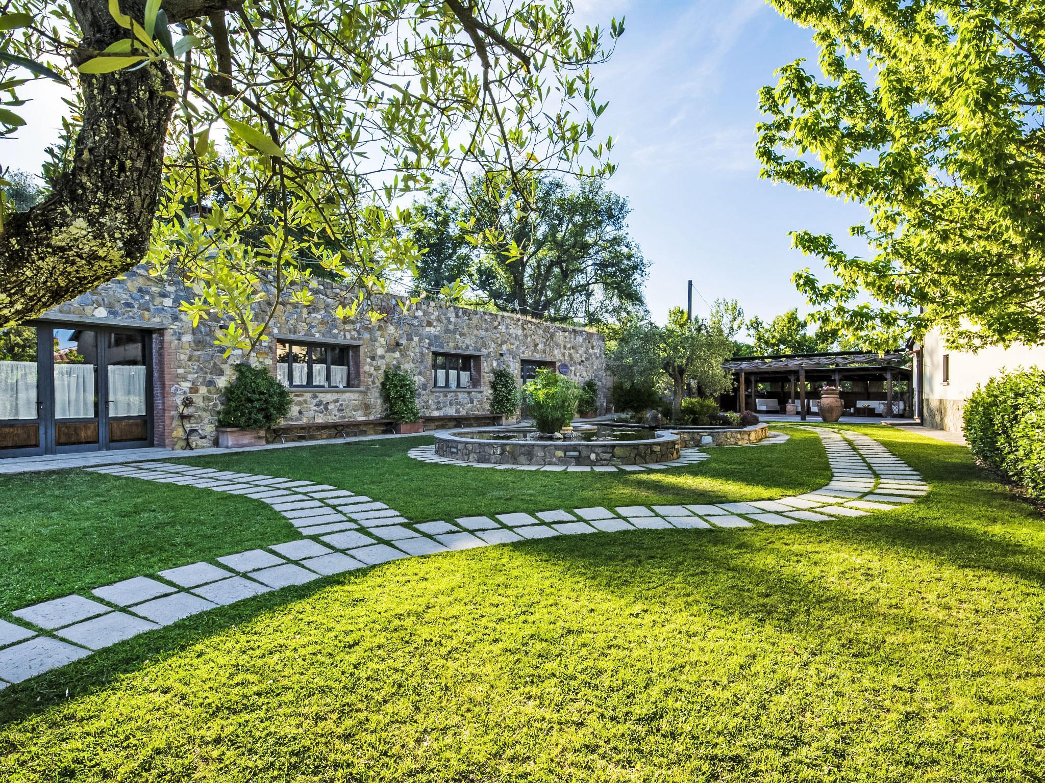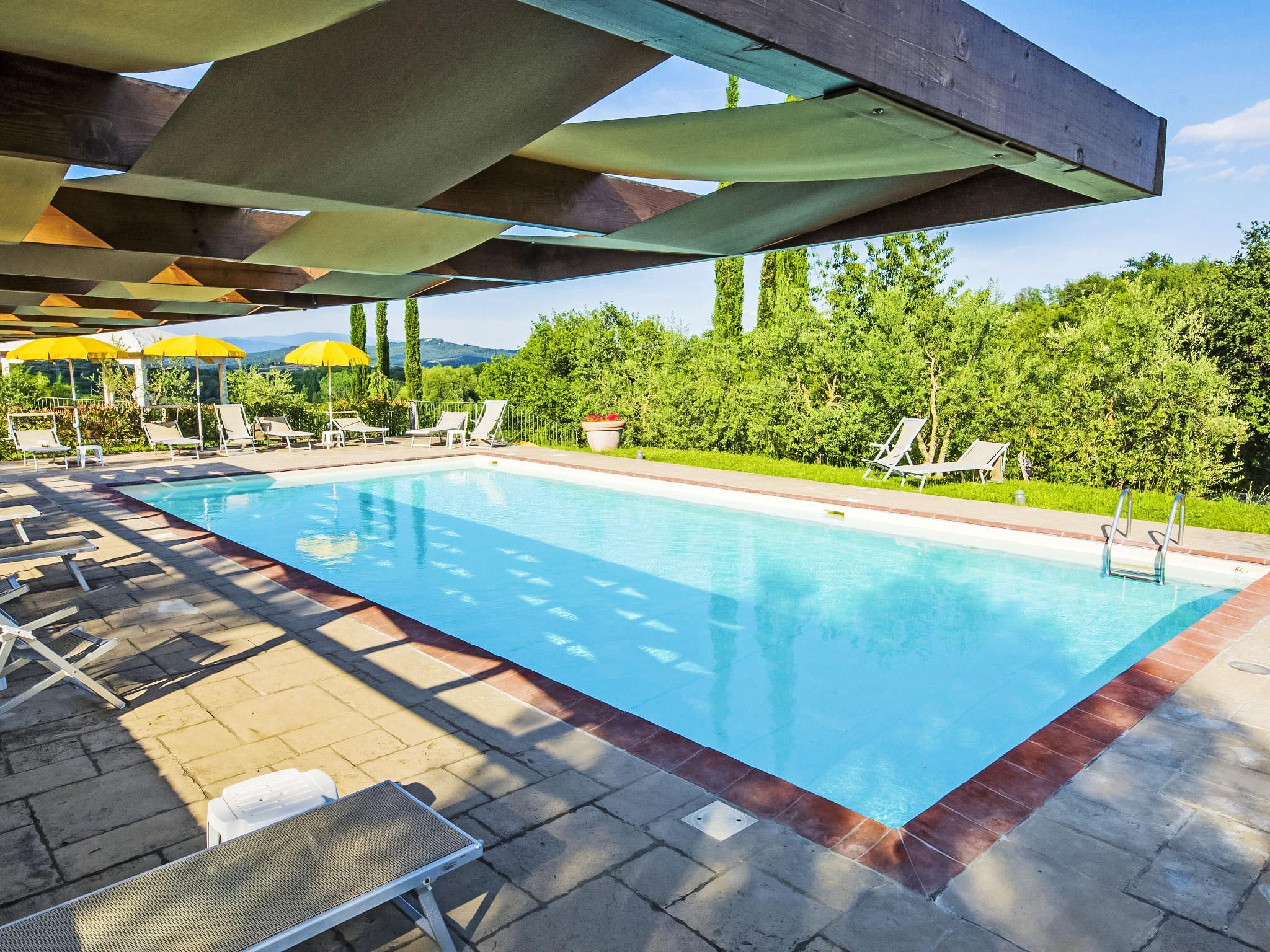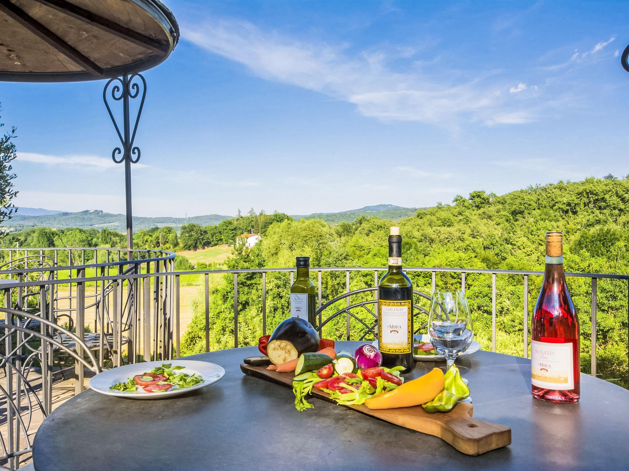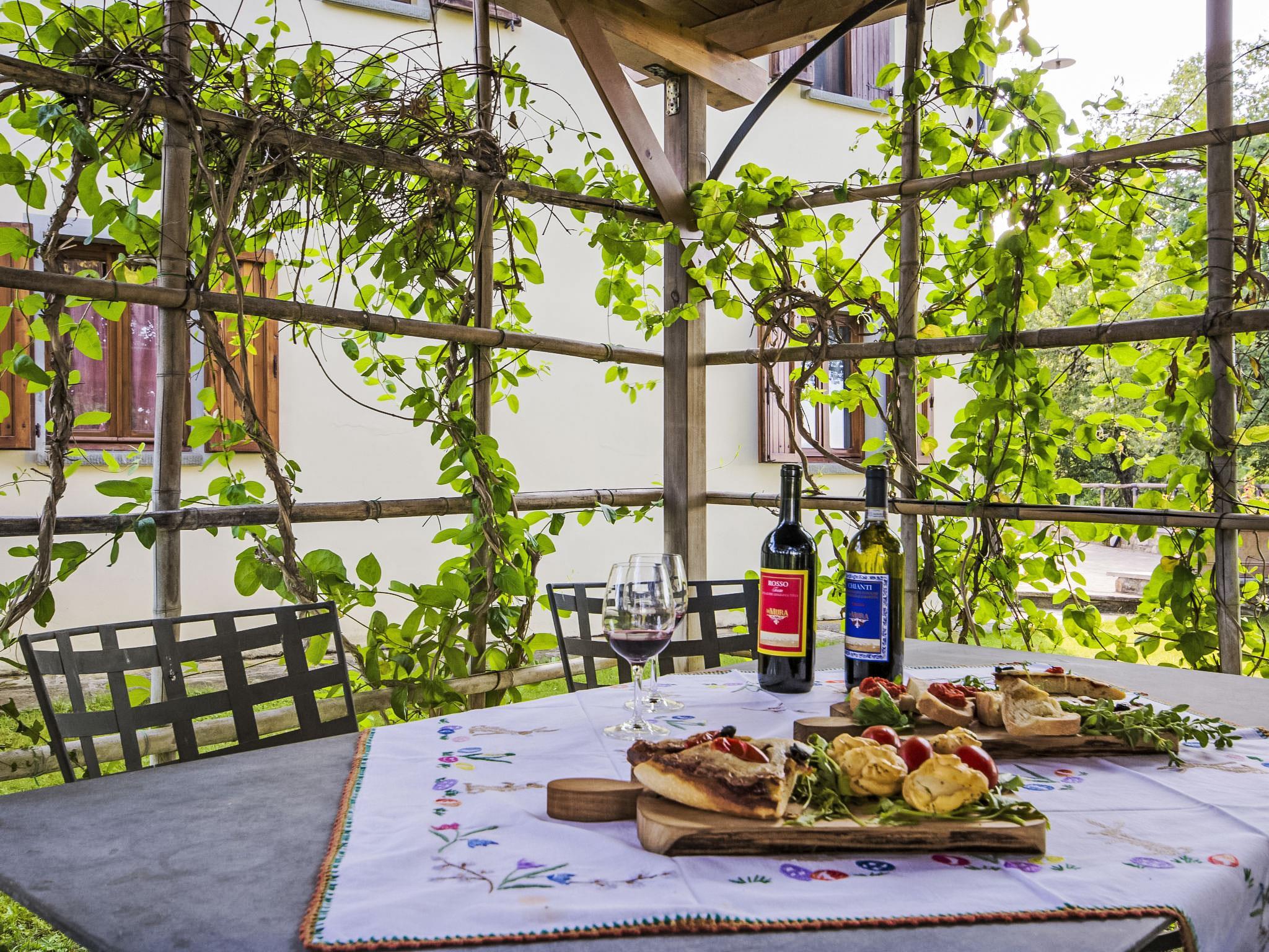 Country estate producing pure olive oil and DOCG Chianti wine. It is possible to take part in the grape harvest at the end of September and the olive harvest in November. The enclosed grounds of vines and olive groves are 8 ha in size, situated in typical Tuscan countryside. In the centre of the Florence/Siena/Arezzo triangle, in the best starting location for cultural trips which, on request, can be organized by the owner along with transport and excursions (extra). Every service available in Bucine. Spaccio Prada, 3 km. Large working farm "Le Mura", renovated, surrounded by trees and fields. 9 apartments in the property. 3 km from the centre of Bucine, 25 km from the centre of Arezzo, 35 km from the centre of Siena, in a quiet position on top of a hill, in the countryside. For shared use: swimming pool (7 x 14 m, depth 160 - 160 cm, seasonal availability: 20.May. - 30.Sep.) with internal staircase. Outdoor shower, children's playground (slide, swing). In the complex: restaurant, WiFi, sun terrace, central heating system, washing machine (for shared use, extra), heating to be paid on the spot, heating available only from 01.Nov. - 15.Apr.. Linen change (suppl. charge extra). Room cleaning on request (extra). House maid on request (extra). Motor access to the house. Parking at the house. Grocery 3 km, supermarket 3 km, restaurant 3 km, bus stop 4 km, railway station "Bucine", thermal baths 20 km. Nearby attractions: Firenze 55 km, Siena 35 km, Arezzo 30 km. Suitable for events.