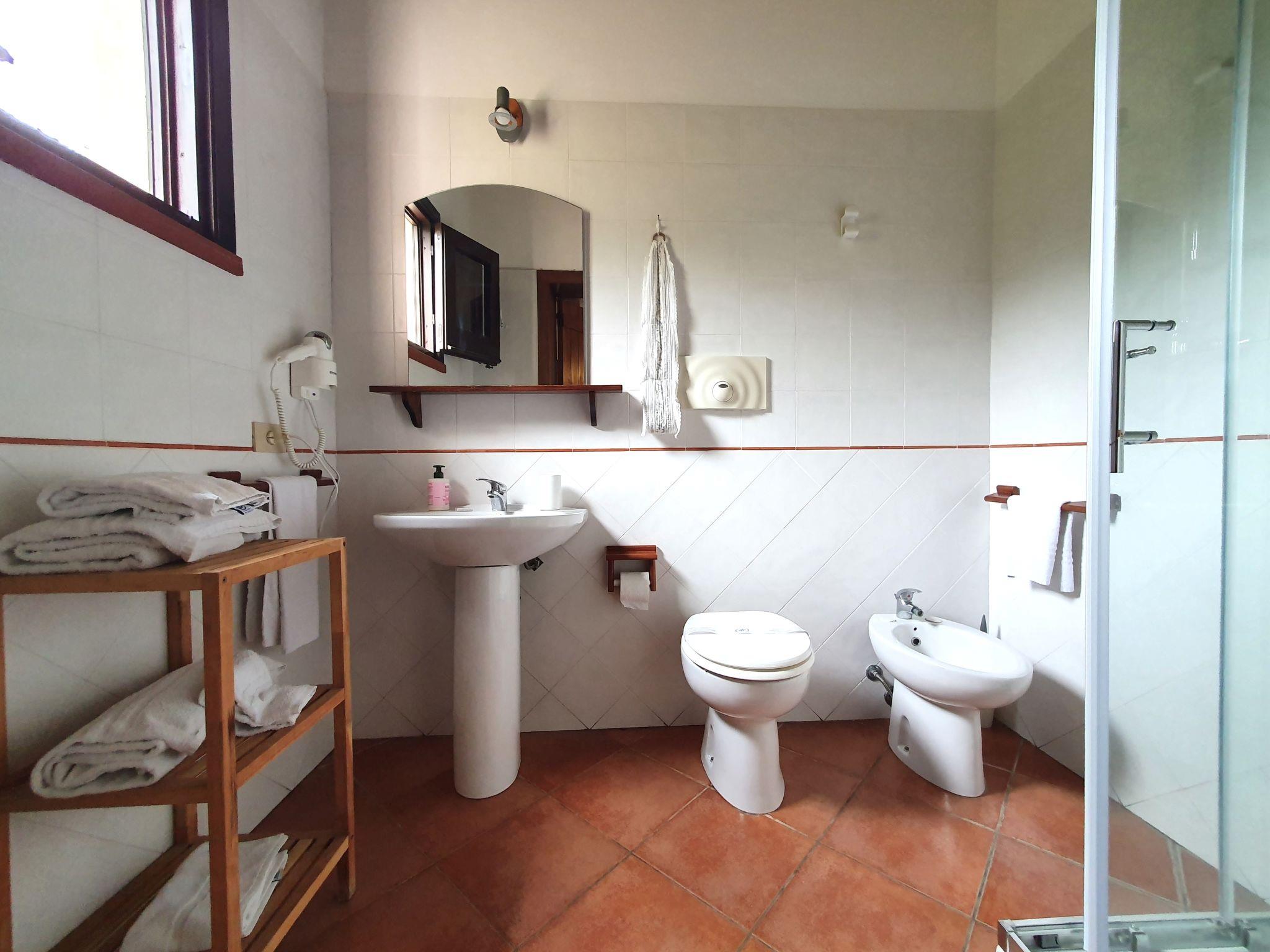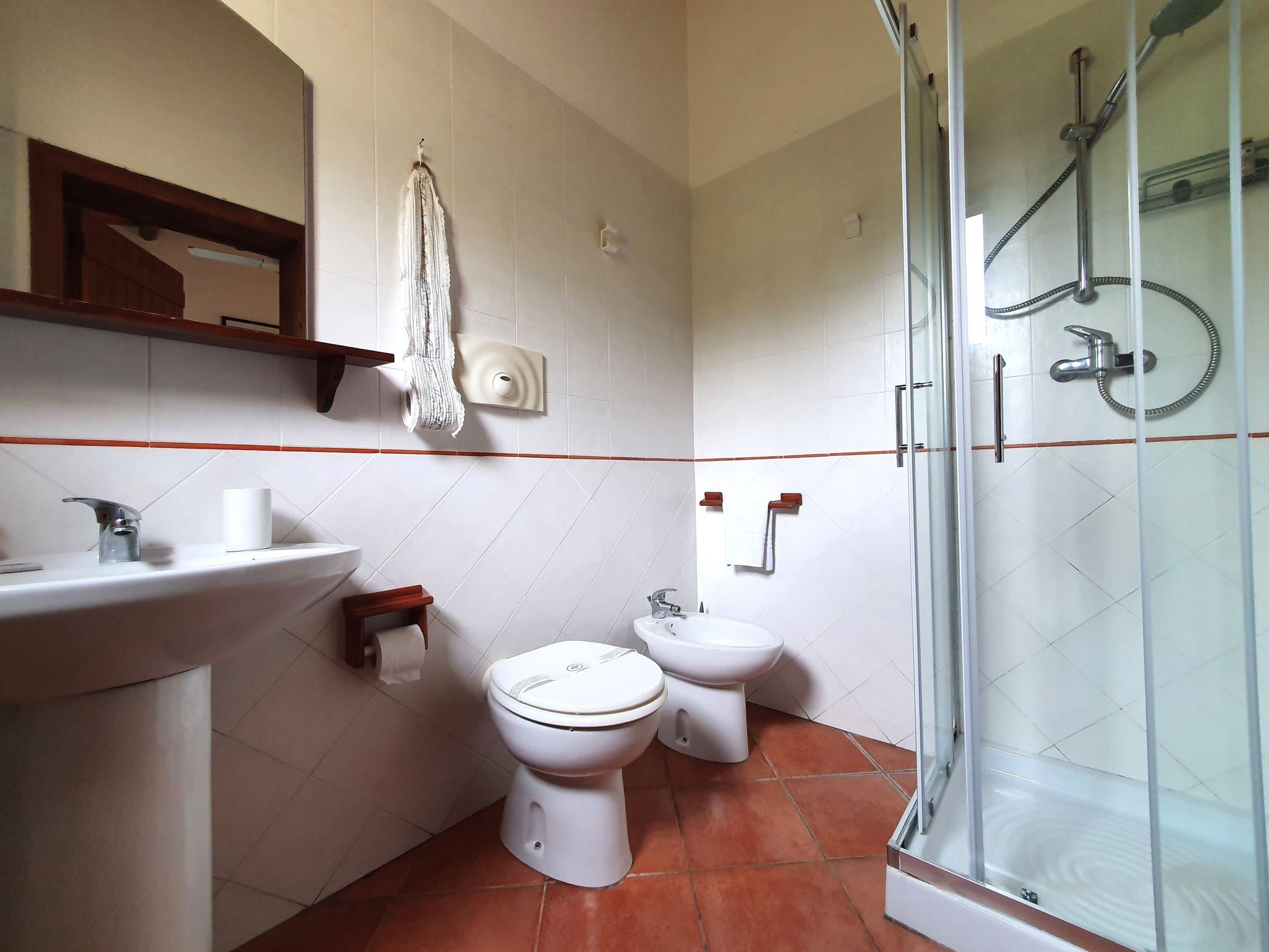 6-room farmhouse 150 m2 on 2 levels, on the ground floor. Comfortable and rustic furnishings: living/dining room with TV, air conditioning and forced-air heating. Exit to the patio. 1 double bedroom with 1 bed, shower/bidet/WC, air conditioning, fan and forced-air heating. Exit to the patio. 1 double bedroom with 2 beds, shower/WC, air conditioning, fan and forced-air heating. 1 double bedroom with dining nook, kitchen corner, shower/bidet/WC, air conditioning, fan and forced-air heating. Exit to the patio. 1 double bedroom with shower/bidet/WC, air conditioning, fan and forced-air heating. Kitchenette (mini-oven, 4 induction hot plates, toaster, kettle, microwave, electric coffee machine). Upper floor: 1 double bedroom with 1 bed, shower/bidet/WC, air conditioning, fan and forced-air heating. Comfortable furnishings in the country house style. Terrace 80 m2. Terrace furniture, barbecue, deck chairs. View of the garden. Facilities: washing machine, iron, children's high chair, baby cot for up to 2 year olds (extra), hair dryer. Internet (WiFi, free). Parking (fenced 4 cars). Please note: smoke alarm, fire extinguisher. The pool mentioned in the description is for private use. "The ground floor rooms can only be accessed from the outside. IT081002C26BFQGEFE