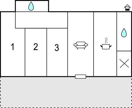 Denne rummelige stuelejlighed har tre store soveværelser, alle med dobbeltsenge, stue med køkken og to badeværelser. Enkel, men funktionel indretning.
