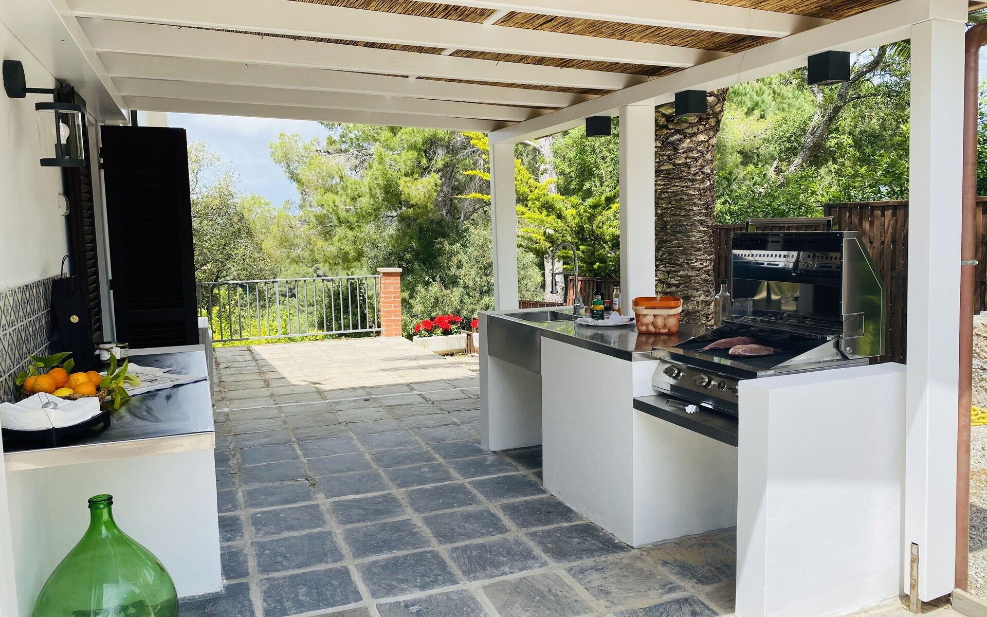 Sie können auch Ihre Mahlzeiten im Freien zubereiten und genießen, indem Sie die Außenküche und eine voll ausgestattete Veranda mit einem Esstisch benutzen. Grill vorhanden.