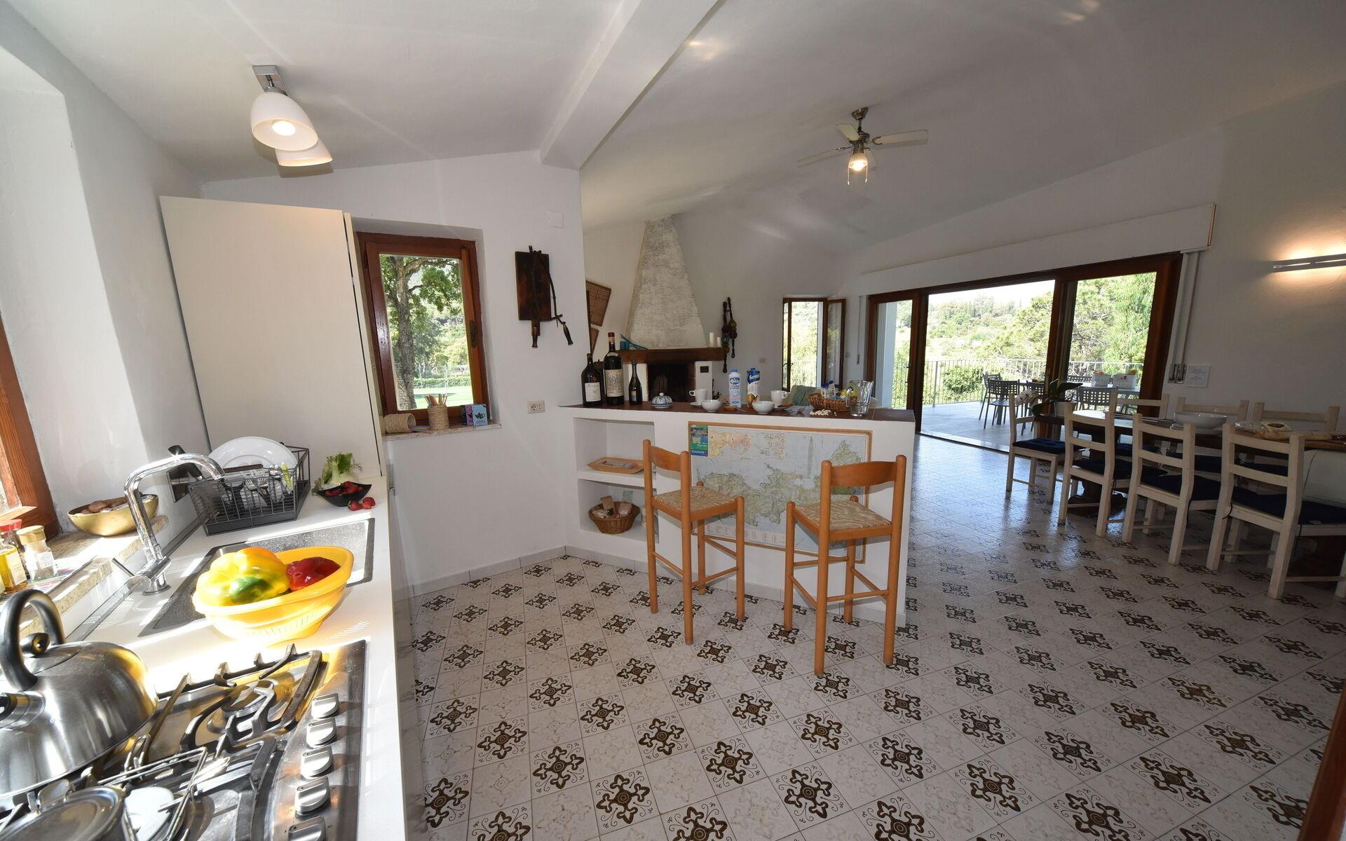 In der Hauptvilla finden wir einen geräumigen, offenen Raum, der aus der Küche, dem Wohnzimmer mit Sat Tv, Sofas und Kamin besteht.