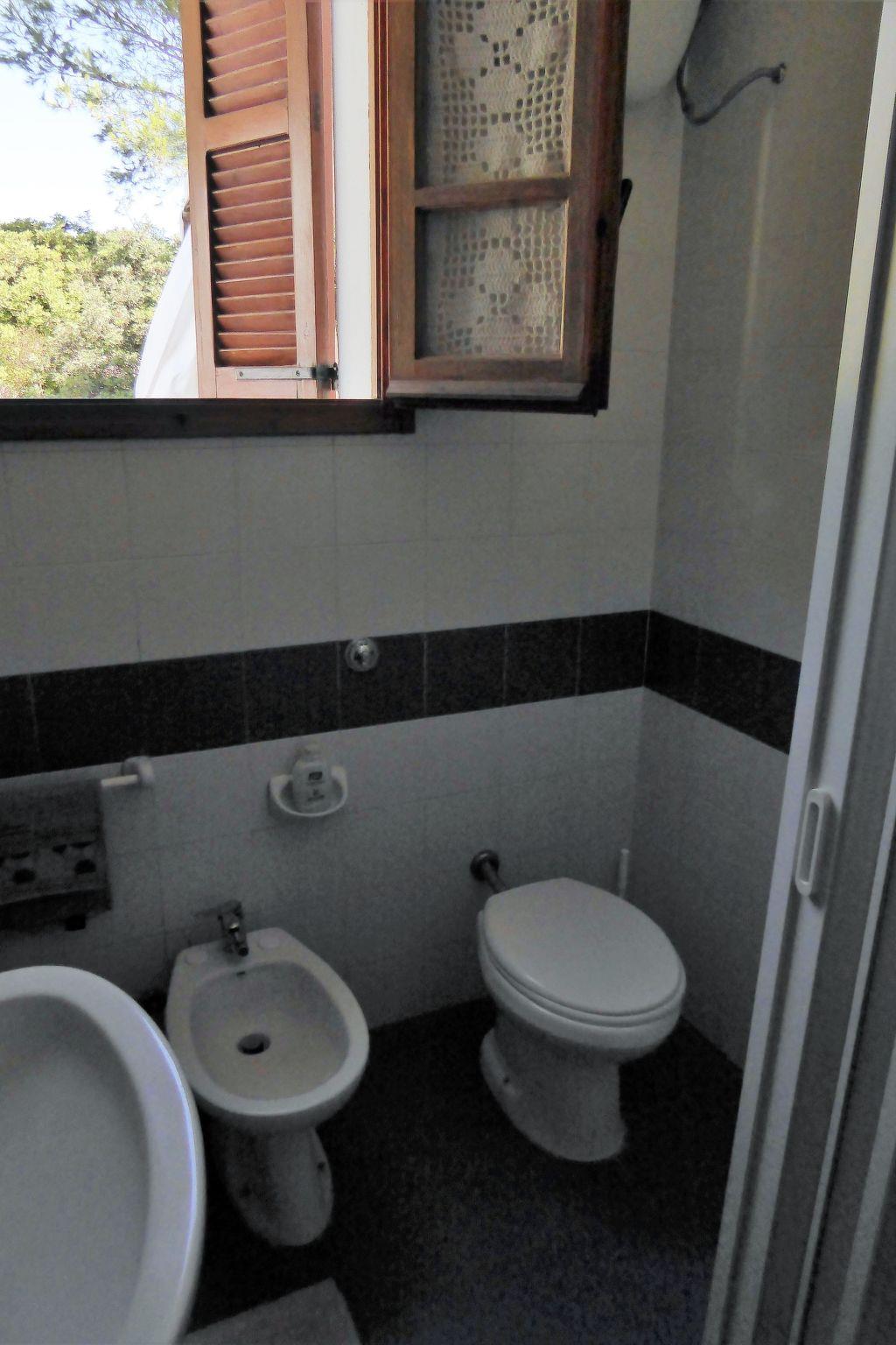 The villa is divided into two levels. On the ground floor there is a large living room with sofas (seating 10), a fireplace, a flat screen satellite TV and a fridge with freezer. The living room opens onto a small kitchen that includes a gas hob and oven, microwave, coffee machine and a sink with two sinks and of course cupboards with plates, cutlery, glasses. The kitchen leads directly out onto the patio, where there is a large dining table that seats 10. Also on the ground floor is a bedroom with two single beds (80x190 cm) that can be combined into a double bed on request, a built-in wardrobe and a direct exit to the patio. Another smaller bedroom with two single beds (80x190 cm) that can be combined into a double bed on request, a built-in wardrobe and a window. In front of the two rooms is a bathroom complete with toilet, bidet, shower and washbasin. A staircase leads from the living room to the loft. Here there is a single bed (80x190 cm), a washing machine and access to a complete bathroom. A door gives access to a large loft with three single beds that can be combined as desired, a cupboard at the bottom and two windows. From the loft there is access to a terrace leading down to the garden. The three bedrooms are equipped with air conditioning. In a small storage room adjacent to the house there is another fridge, a small chest freezer and a dishwasher. There is also wireless internet access in the immediate vicinity of the house.