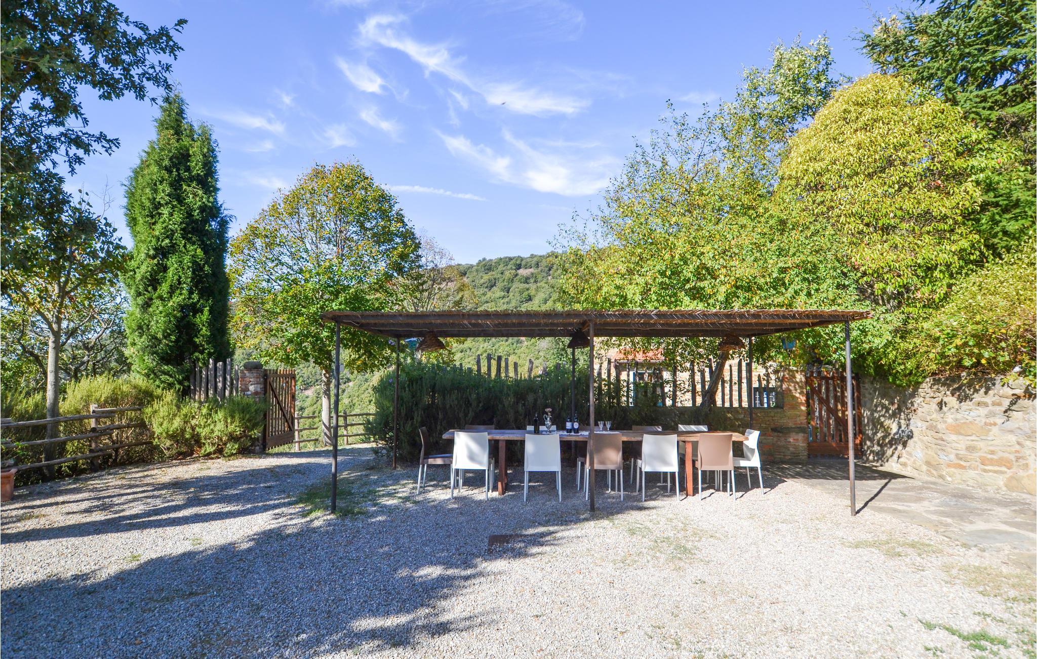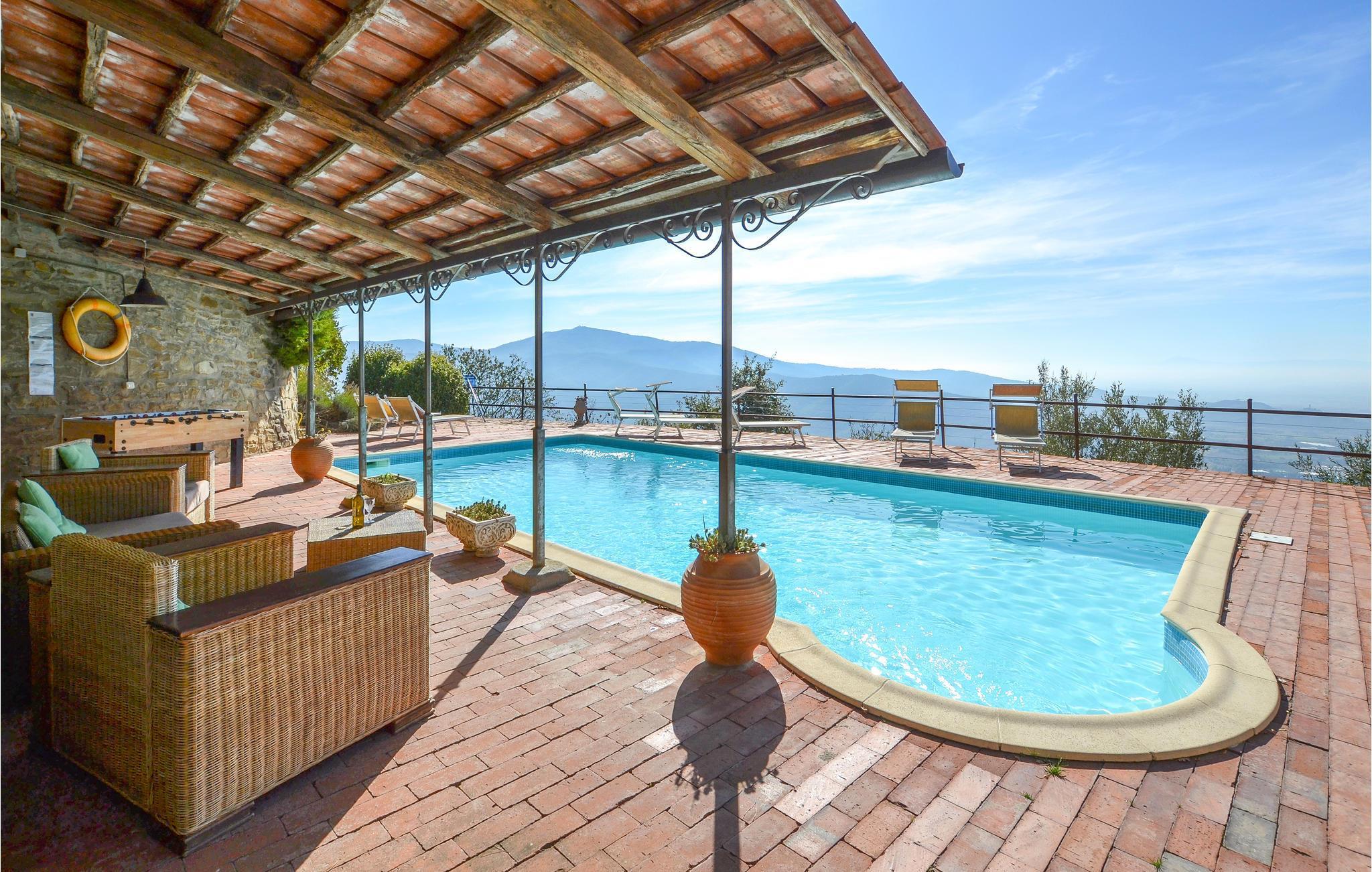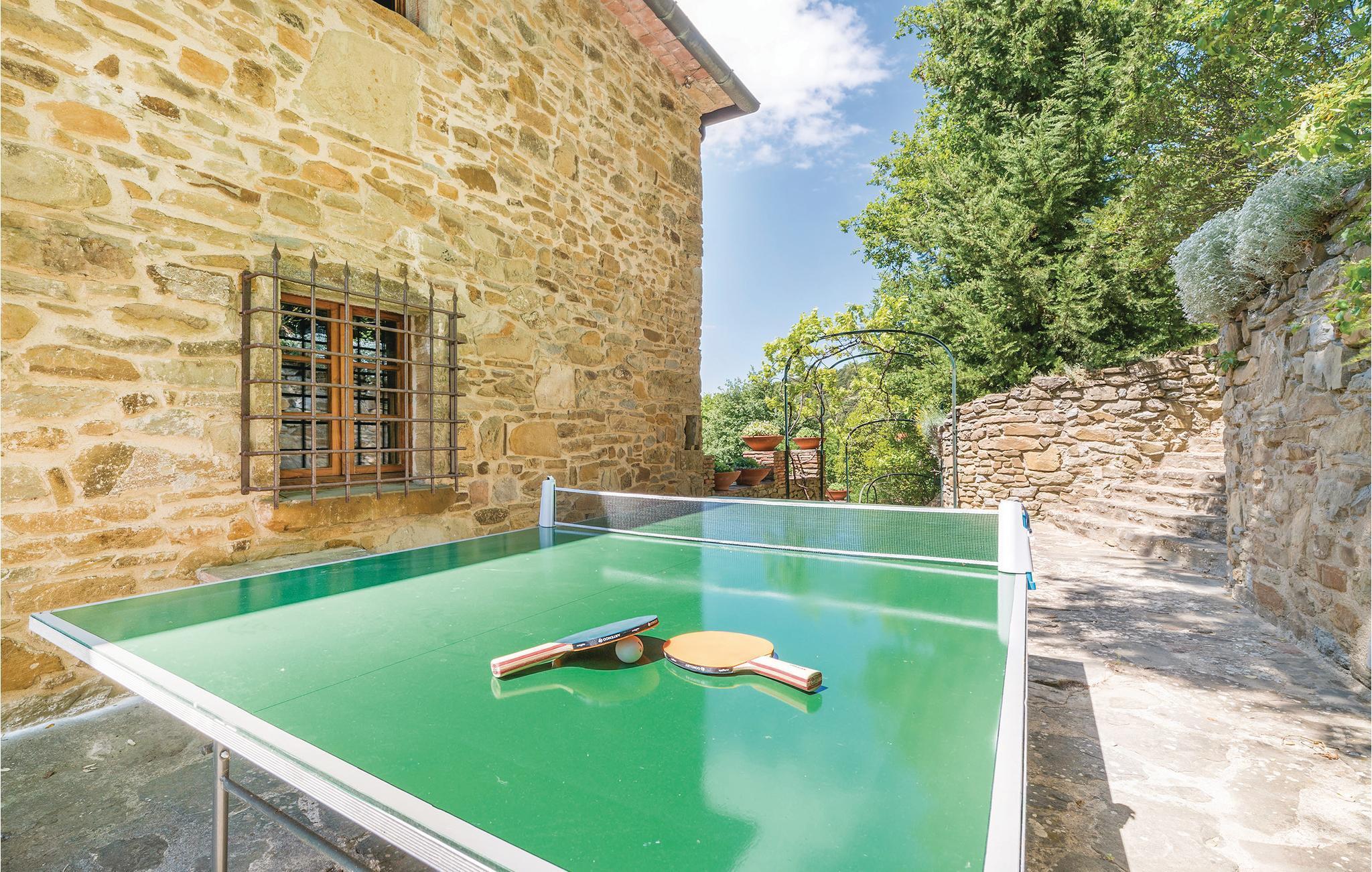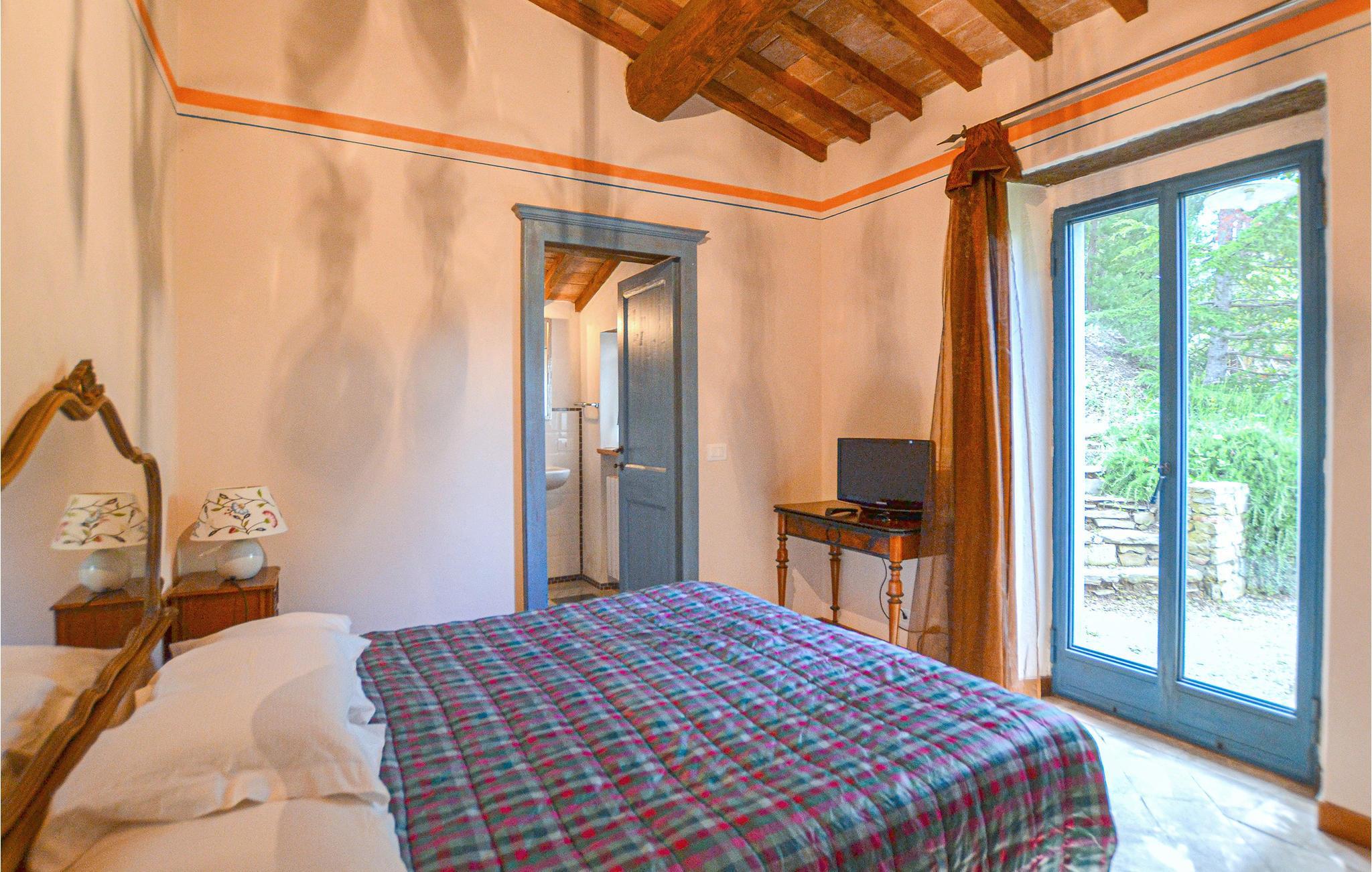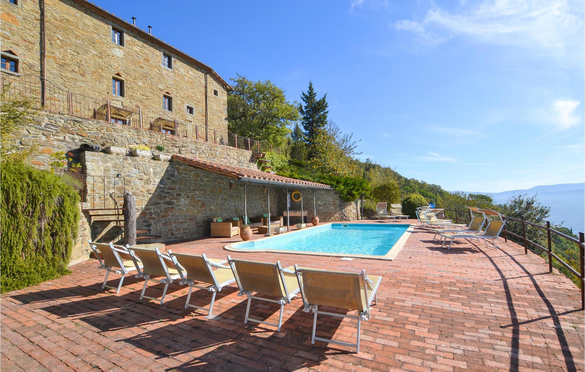 Dette stilfuldt restaurerede feriehus i natursten ligger ca. 6 km over Castiglion Fiorentino, i 700 m højde. Herfra kan I se ud over hele Chiana-dalen og nyde stedets enestående ro. Det forhenværende kloster ligger over tre etager med forskellige udgange til naturen. Gulve og mure af natursten hører til husets karakter, ligesom åbne pejse, forskellige trapper, buer, nicher og mange smukke udsigter. Hvert værelse er individuelt og smagfuldt indrettet. Soveværelset på anden sal med sovesofa og enkeltseng er gennemgangsværelse. Omkring huset er der terrasser og træer, der giver skyggefulde hyggesteder. Lige nedenfor boligen har I swimmingpoolen med panorama-terrasse og pavillon. Dertil kommer grill, bordtennis og volleyball. Ideelt til afslapning, og samtidigt er det oplagt at tage på spændende ture i området. Besøg Castiglion Fiorentino 6 km, Cortona og Arezzo circa 16 km, Montepulciano 35 km, Pienza 40 km og til Lago Trasimeno er der 30 km. Ikke asfalteret og meget stejl tilkørsel, uegnet til sportsvogne og lave biler.