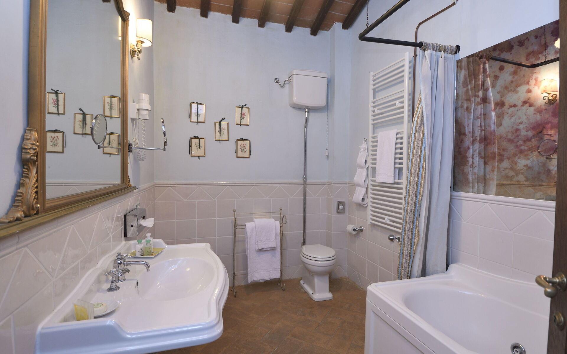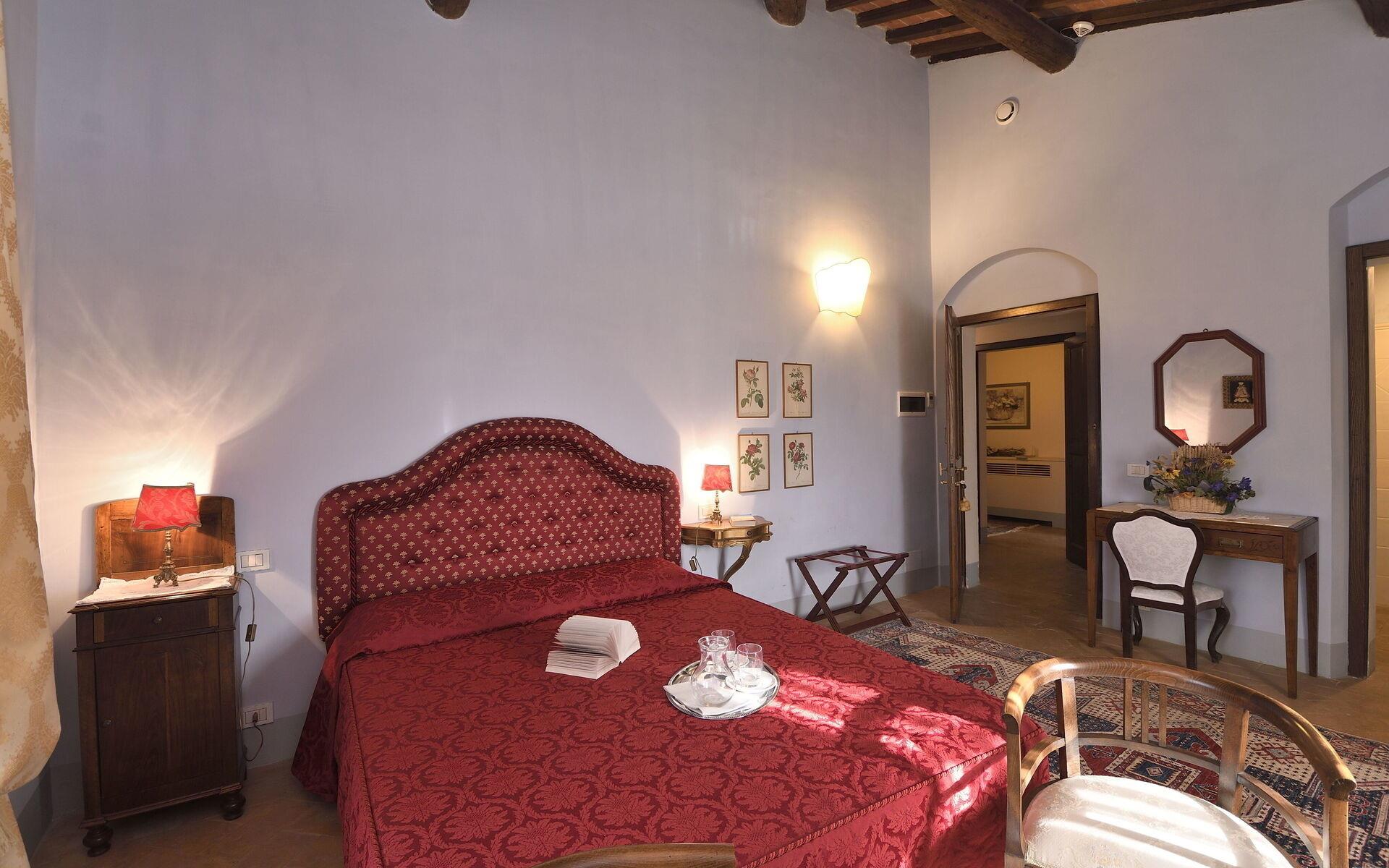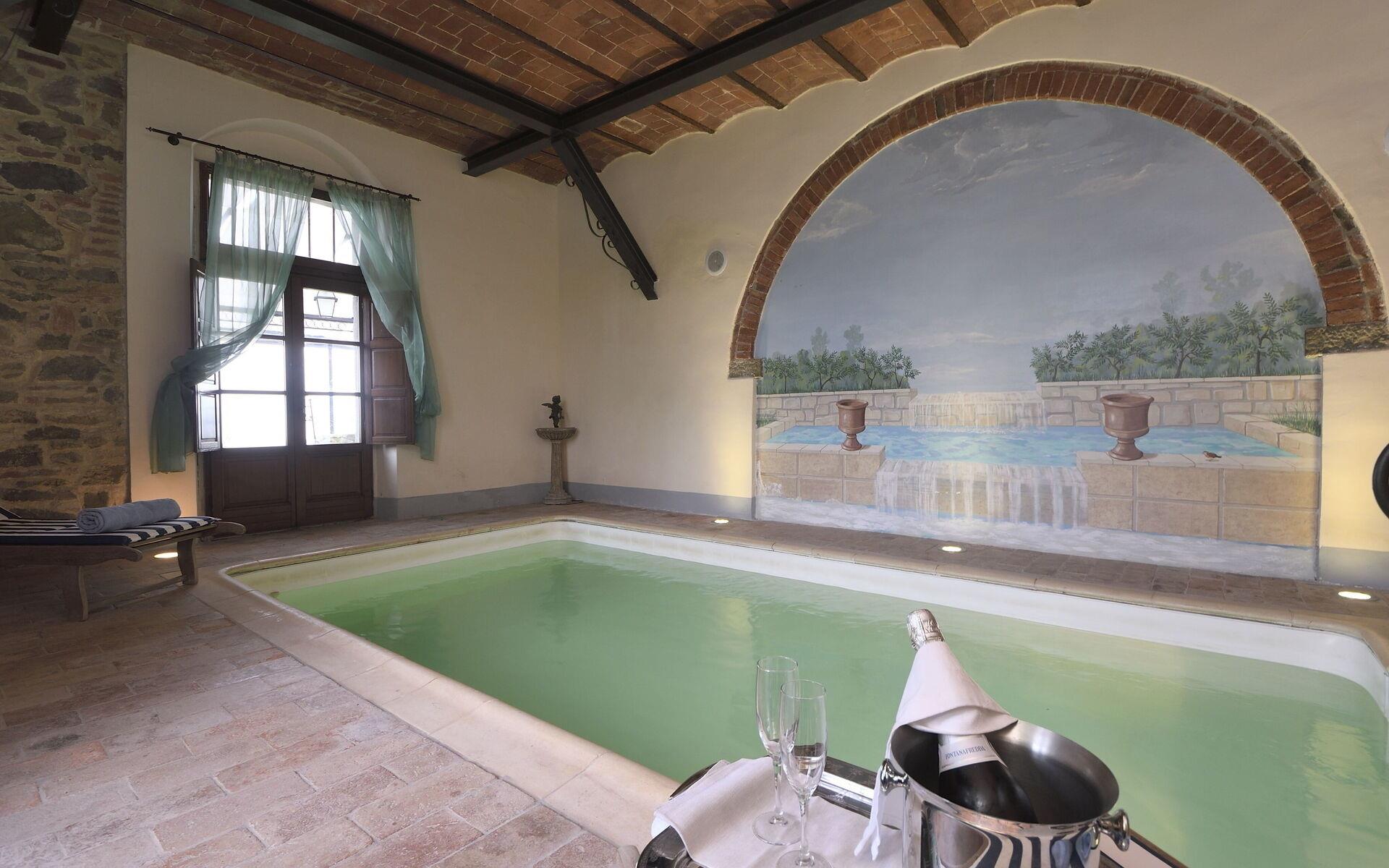 Die Innenräume der Villa Michelangelo sind geräumig (800 m²) und hell und zeichnen sich durch freiliegende Holzbalken und Terrakottaböden aus, die an den traditionellen toskanischen Stil erinnern, der auf der ganzen Welt bekannt ist. Die Villa verfügt über 9 Schlafzimmer und 11 Badezimmer und bietet Platz für bis zu 18 Personen. Jedes Zimmer verfügt über Klimaanlage. Es erstreckt sich über 3 Etagen und ist intern über Treppen und einen Aufzug miteinander verbunden. Das Erdgeschoss besteht aus einem bequemen Eingang und einem geräumigen Wohnzimmer mit Kamin, Bar und Essbereich. Vom Wohnbereich aus hat man direkten Zugang zur professionellen, modernen, voll ausgestatteten Küche und zum beheizten Innenpool. (3x5 Meter, feste Tiefe 1,10 Meter) mit Gegenstromsystem und Hydromassage, Sauna und Bad mit Dusche. Der Wellnessbereich ist wöchentlich kostenpflichtig und muss im Voraus reserviert werden. Ein Schlafzimmer mit Doppelbett und eigenem Bad mit eigener Dusche, ein Wäschebereich (Waschmaschine, Trockner, Bügeleisen und Bügelbrett) und ein Service-Badezimmer vervollständigen das Erdgeschoss. Im ersten Stock finden Sie 2 wunderschöne Suiten, die jeweils aus einem Schlafzimmer mit Doppelbett, einem Wohnbereich mit Kamin und einem eigenen Bad mit Whirlpool bestehen. Immer im ersten Stock finden Sie weitere 5 Doppelzimmer mit eigenem Bad mit Dusche. Im zweiten Stock, der Mansarde, befindet sich ein schönes Schlafzimmer mit Doppelbett und eigenem Bad mit Dusche.
