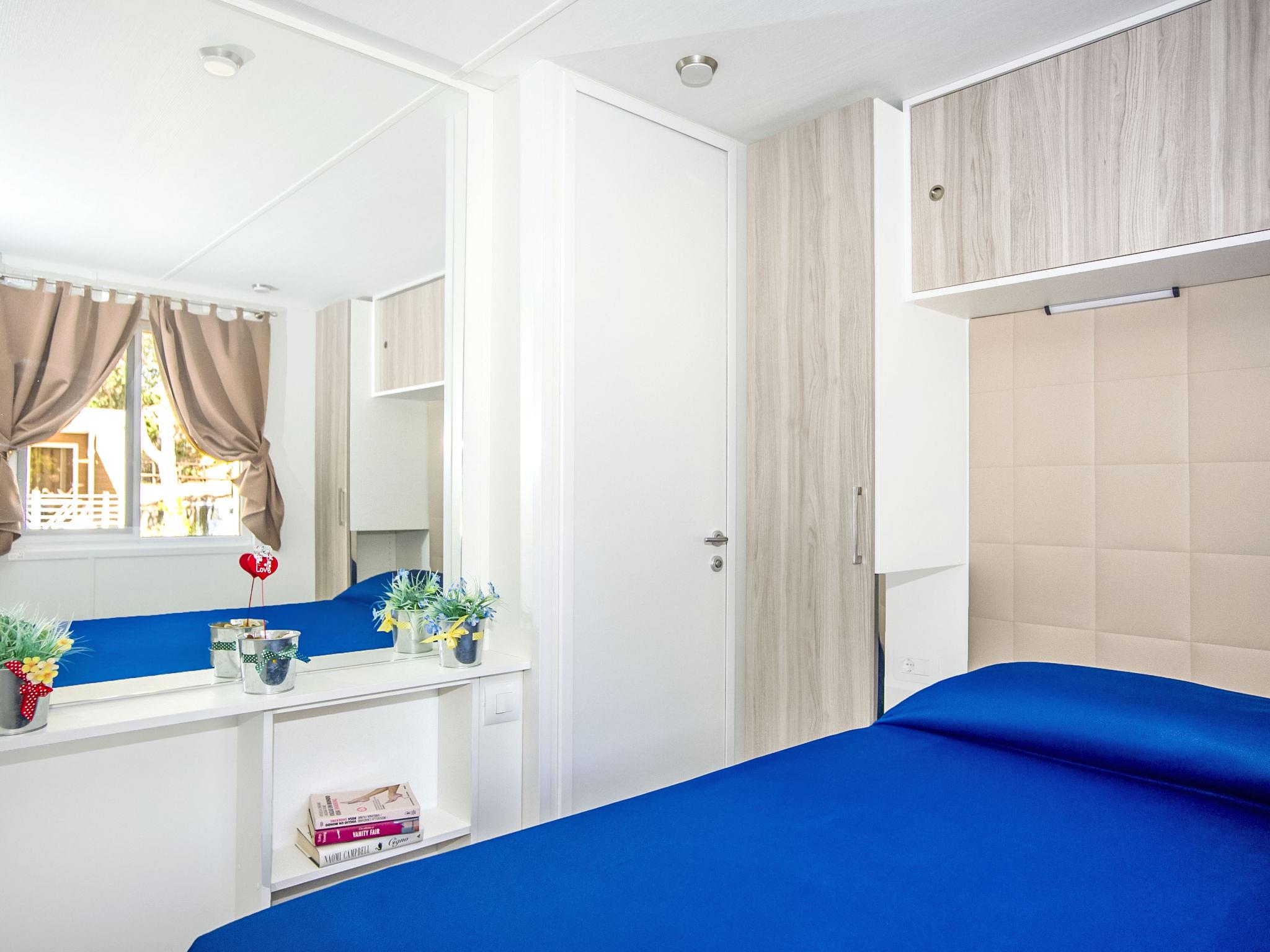 "Bungalow Trendy", 3-room mobile home 30 m2, on the ground floor. Object suitable for 4 adults + 1 child. Practical and modern furnishings: living/dining room with kitchen corner and TV. Exit to the veranda. 1 double bedroom with separate WC. 1 small room with 3 beds. Shower/WC. Air-conditioning. Terrace 14 m2, garden. Terrace furniture. Facilities: safe, mosquito net, hair dryer. Internet (WiFi, free). E-charging station. Please note: private entrance. IT053006B1ZWQW8ZUA