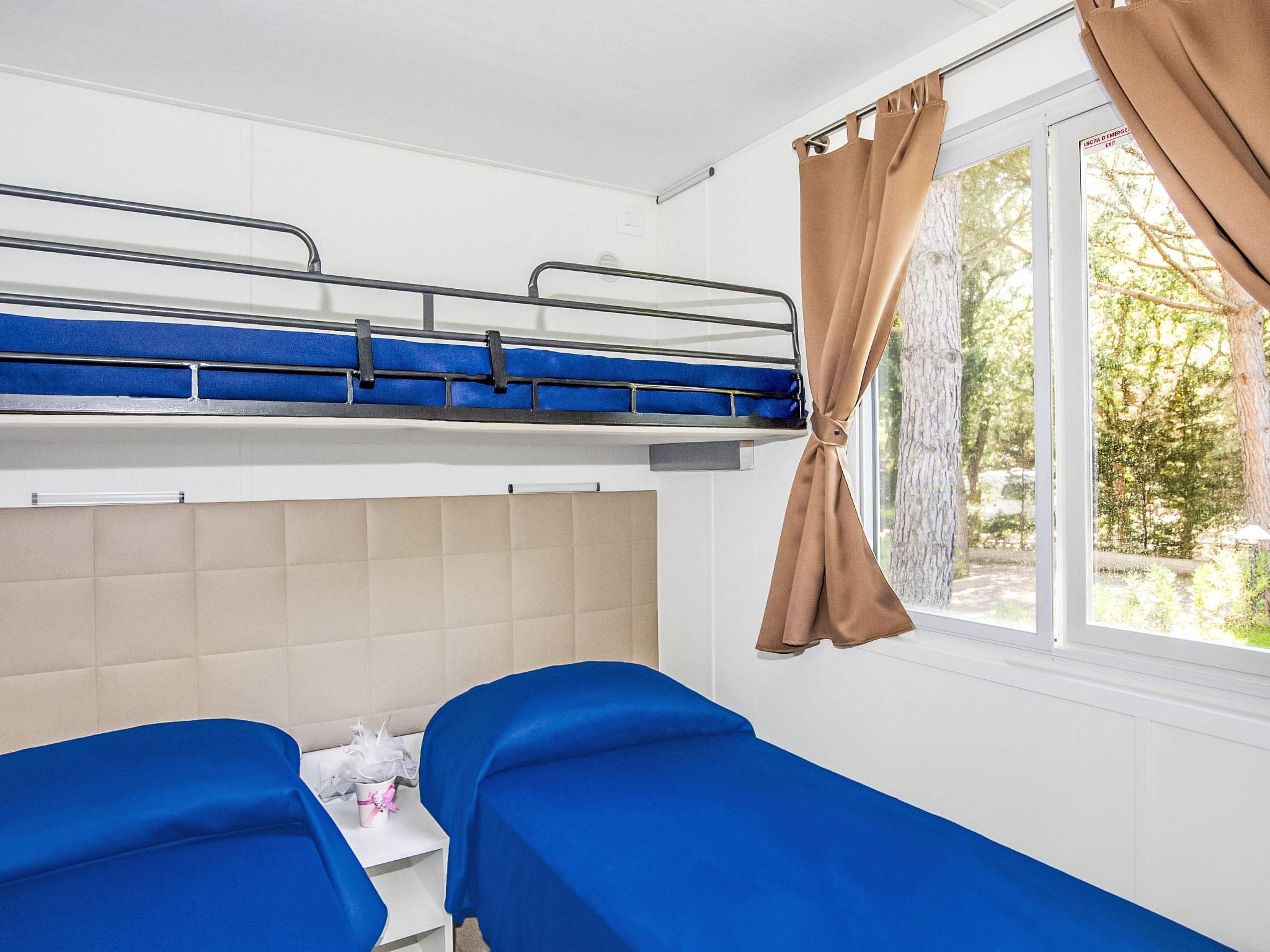 "Bungalow Trendy", 3-room mobile home 30 m2. Object suitable for 4 adults + 1 child. Practical and modern furnishings: living/dining room with kitchen corner and TV. Exit to the veranda. 1 double bedroom with separate WC. 1 small room with 3 beds. Shower/WC. Air-conditioning. Terrace 14 m2, garden. Terrace furniture. Facilities: safe, mosquito net, hair dryer. Internet (WiFi, free). E-charging station. Please note: private entrance. IT053006B1ZWQW8ZUA