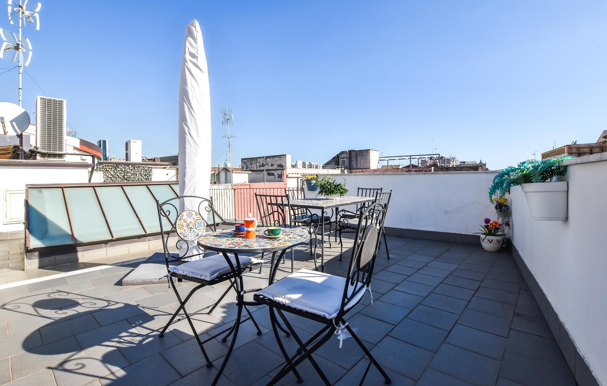 Velkommen til denne bylejlighed, der er kendetegnet ved sit historiske strejf og sin fremragende beliggenhed, kun en kort gåtur fra det græske amfiteater, Villa Bellini, Via Etnea og Sant'Agata-katedralen. Lejligheden ligger i en flot bygning fra omkring år 1800 og har en særdeles karakteristisk indretningsstil. Stuen er yderst elegant med en flot, åben første sal, og med de mange storladne detaljer får man indtryk af svundne tiders glamour. Lejligheden er det ideelle valg for jer, der gerne vil bo i helt særlige rammer på ferien. På øverste etage kan I beundre de smukke og særlige kasselofter, og hele lejligheden er en fantastisk base at slappe efter en dag fyldt med oplevelser. Smæk fødderne op i sofaerne og sludr til langt ud på natten. På den smukke tagterrasse med borde, stole og grill kan I nyde jeres måltider i det fri.